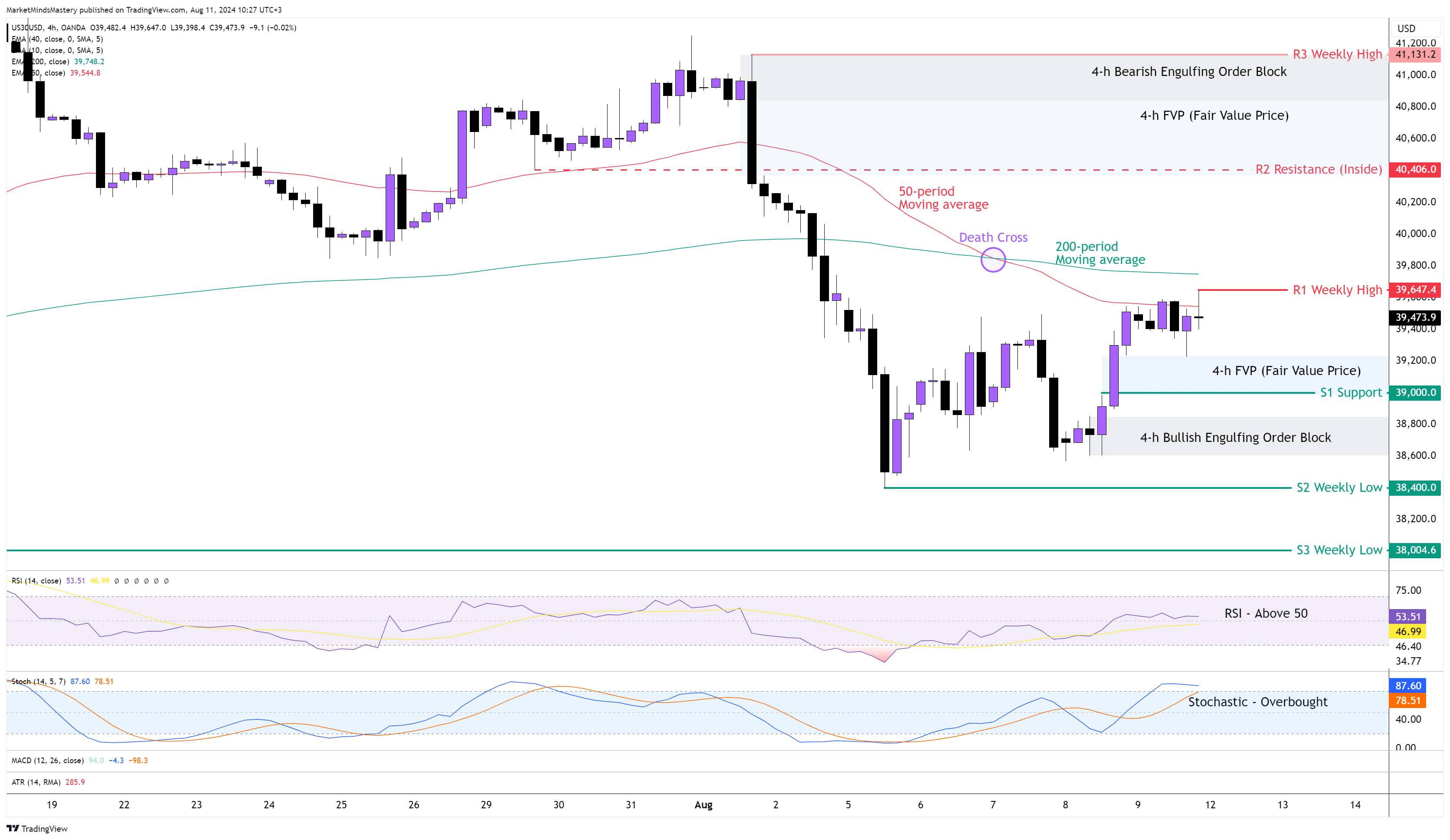 US30 geçen hafta diğer büyük ABD Endekslerinden daha düşük bir fiyat aralığına sahipti. Bir önceki haftanın Piyasa Görünümünü takiben, geçen Pazartesi, fiyat destek bulduğu 39400$'a kadar düşmeye devam etti ve ardından şu anda bulunduğu 50 dönemlik hareketli ortalamaya kadar yukarı doğru hareket etti. Geçtiğimiz Çarşamba günü 50 periyot, "Ölüm kesişmesi" olarak bilinen 200 periyotluk hareketli ortalamanın altına geçti ve bu düşüş göstergeleri arasında yer alıyor. RSI 50'nin üzerinde ve son 15 periyot boyunca piyasayı ağırlıklı olarak alım emirleri yönlendirdi. Ayrıca, fiyat değişimlerine daha hızlı tepki veren Stochastic Osilatör şimdiden Aşırı Alım alanına girdi. Pazartesi gününden itibaren, fiyat 50 dönemlik hareketli ortalamanın altında kalır ve aşağı doğru hareket ederse, ilk destek alanı olan S1 39000$ olacaktır. Bu yuvarlak bir sayıdır ve fiyat grafiğinde FVP'nin altında ve geçen Perşembe günü oluşturulan Bullish Engulfing Order Block'un üzerindedir. Fiyat S1'e nüfuz eder ve daha da düşerse, bir sonraki destek olan S2, bir önceki haftanın en düşük seviyesi olan 38400 $ civarında olacaktır. Öte yandan, fiyat 50 dönemlik hareketli ortalamayı aşar ve yukarı doğru hareket ederse, ilk direnç alanı olan R1, bir önceki haftanın en yüksek seviyesi olan 39647 $ civarında olacaktır. Fiyat R1'e nüfuz eder ve yukarı doğru hareket etmeye devam ederse, bir sonraki direnç alanı R2, 40406 $ civarında iç direnç olacaktır.