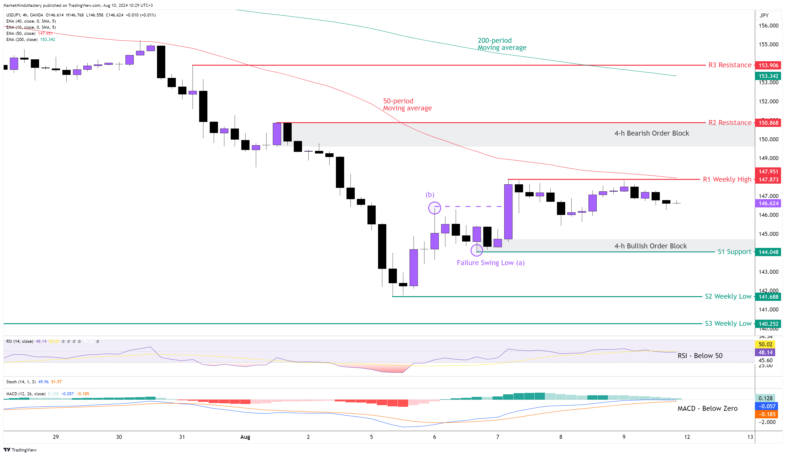 4 saatlik grafikte, 50 dönemlik hareketli ortalama 200 dönemin altında seyrediyor. RSI Osilatörü orta çizgisi olan 50'nin altında ve fiyat zayıflığına işaret ediyor. MACD ise sıfır çizgisinin altında ve düşüş eğilimi gösteriyor. Dow teorisine göre, (a) noktasındaki Başarısız Dalgalanma Düşüklüğü ve (b) noktasındaki yüksek dalgalanmanın penetrasyonu, piyasa yapısında bir değişiklik ve yeni bir trendin potansiyel gelişimi olarak kabul edilir.