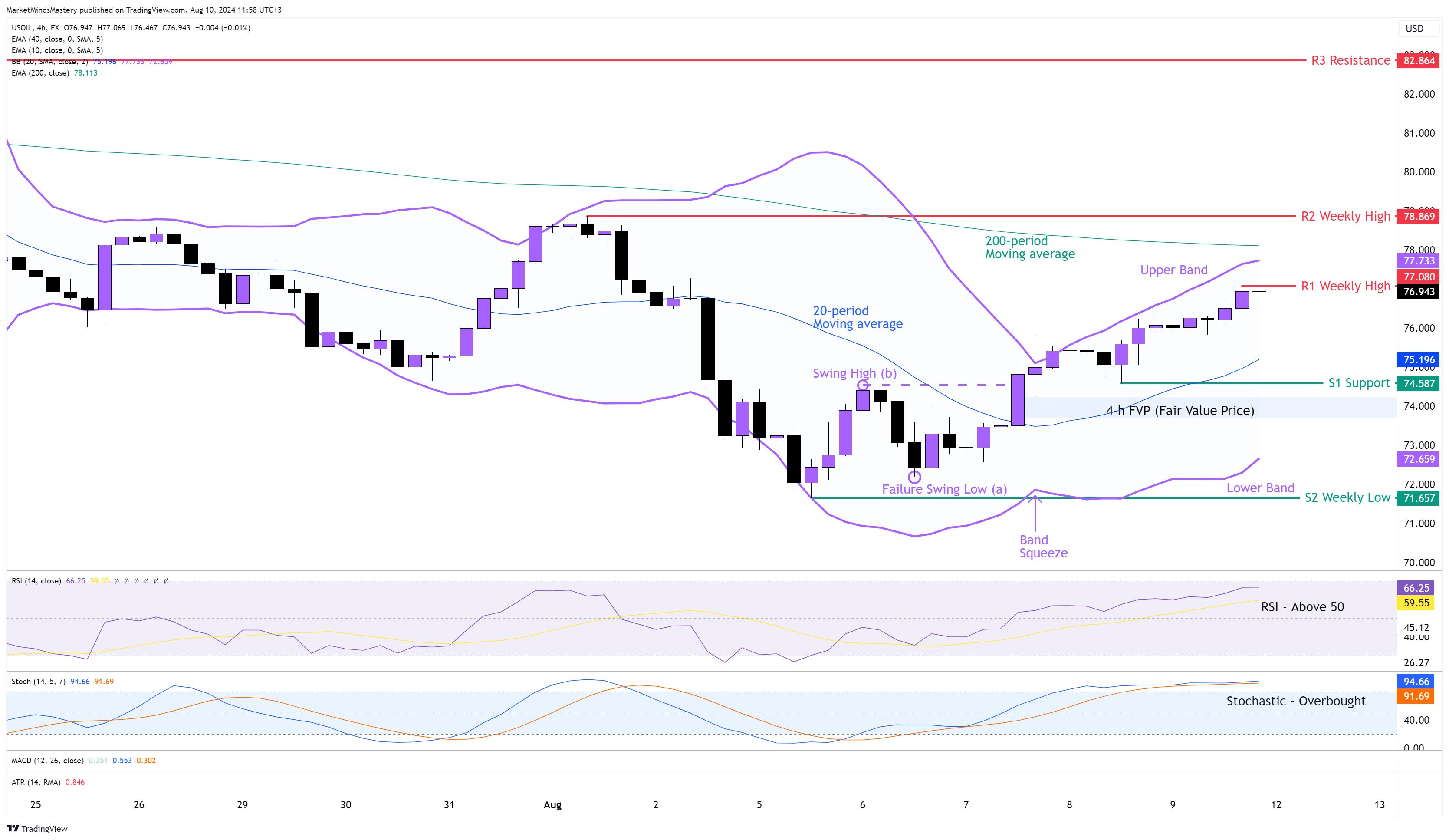 Bir önceki haftanın Piyasa Görünümünün ardından, USOIL fiyatı haftalık grafikte bir Boğa Dönüşü Fiyat hareketi yarattı ve geçen Salı gününden bu yana fiyat yukarı doğru hareket etti. 4 saatlik grafikte, dalgalanma analizine göre, fiyat (a) noktasında bir Başarısız Dalgalanma Düşüklüğü oluşturdu ve ardından piyasa yapısı değişti. Bu, Temmuz ortasında başlayan düşüş trendini sona erdirdi. Şu anda fiyat, Bollinger Band Göstergesinin orta çizgisi olan 20 dönemlik hareketli ortalamanın üzerinde ve aynı zamanda yükseliş olarak kabul edilen üst bant alanına yakın. Buna ek olarak, RSI orta çizgisi olan 50'nin üzerindedir ve bunun yükseliş etkileri vardır. Stochastic Osilatör geçen Perşembe gününden bu yana Aşırı Alım durumunda ve bu da bir yükseliş göstergesi. Bu nedenle, fiyat yukarı doğru hareket etmeye devam ederse, ilk direnç alanı olan R1, önceki haftanın kapanışı olan 77,08 $ civarında olacaktır. Fiyat R1'e nüfuz eder ve artmaya devam ederse, bir sonraki direnç alanı olan R2, önceki haftanın en yüksek seviyesi olan 78,86 $ olacaktır. 78 $ civarında çizilen 200 dönemlik hareketli ortalama, fiyat için dinamik bir direnç olabilir.