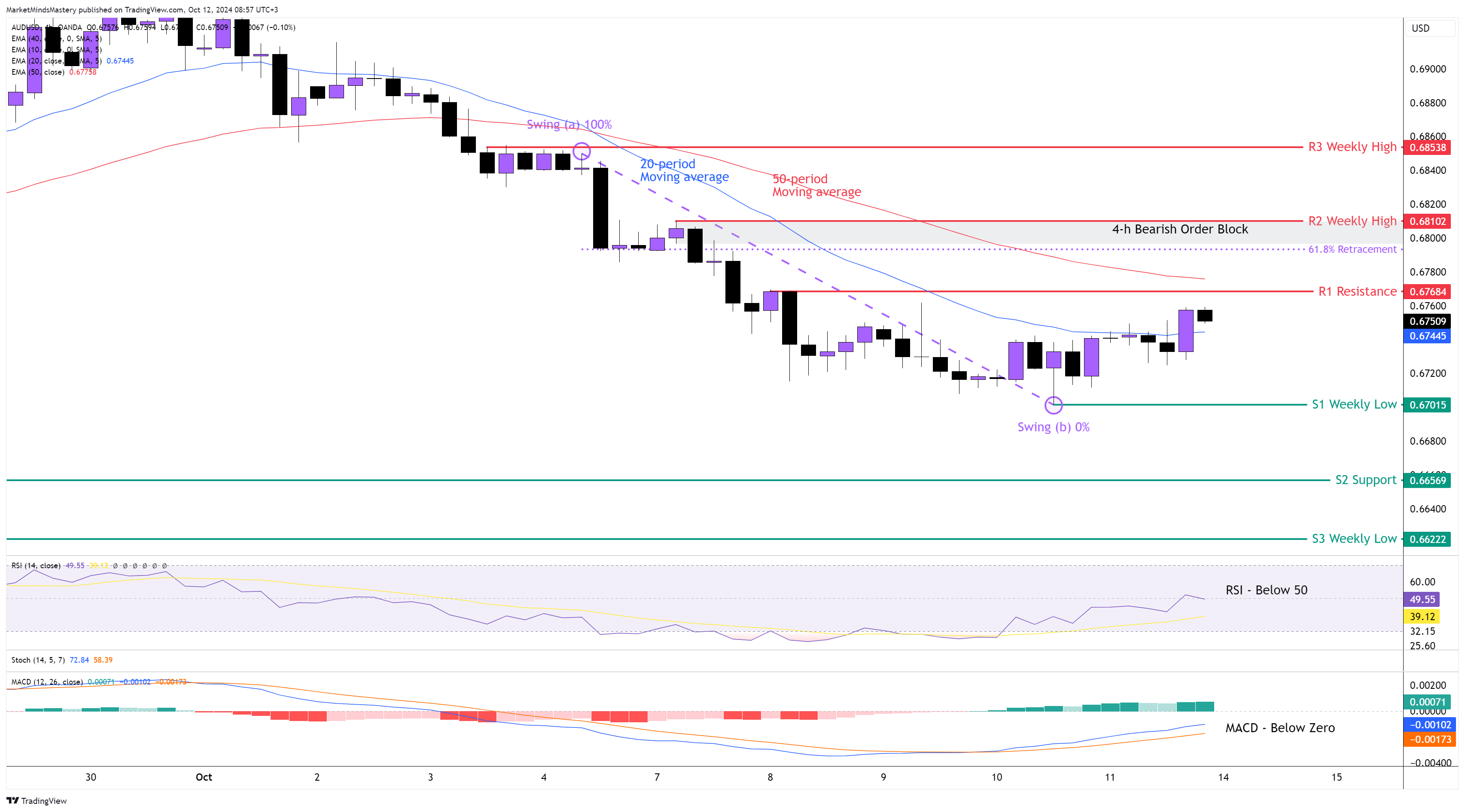 Ekim ayının başında başlayan düşüş trendi, ABD Dolarının para birimleri genelinde daha fazla güç kazanmasıyla geçen hafta da devam etti. Haftalık grafik yeni bir düşük yüksek ve düşük düşük oluşum yarattı. 4 saatlik grafikte, 20 periyotluk düşüş eğilimi gösteren 50 periyotluk hareketli ortalamanın altında kalıyor. RSI Osilatörü de düşüş eğilimi gösteren 50 orta çizgisinin altında. MACD sıfır çizgisinin altında, bu da düşüşe işaret ediyor. MACD'nin Histogramı sıfır çizgisinin üzerinde, bu da fiyatın bir geri çekilme aşamasına girdiğini gösteriyor. Dolayısıyla, fiyat geri çekilmeye devam eder ve yukarı doğru hareket etmeye devam ederse, ilk direnç alanı olan R1, mevcut fiyatın yaklaşık 200 puan (20 pip) altında olan 0,67684 civarında olacaktır. Fiyat R1'e nüfuz eder ve yukarı doğru hareket etmeye devam ederse, bir sonraki direnç alanı R2, 0,68102 civarında olacaktır. Bu önemli bir direnç seviyesi çünkü bir önceki haftanın en yüksek seviyesi, aynı zamanda geçen hafta bir Ayı Emir Bloğu oluşturdu ve % 61,8 Fibonacci Altın Oranı, (a) noktasındaki en yüksek dalgalanmadan (b) noktasındaki en düşük dalgalanmaya kadar olan fiyat hareketini ölçtüğü için bu fiyat seviyesi civarında.