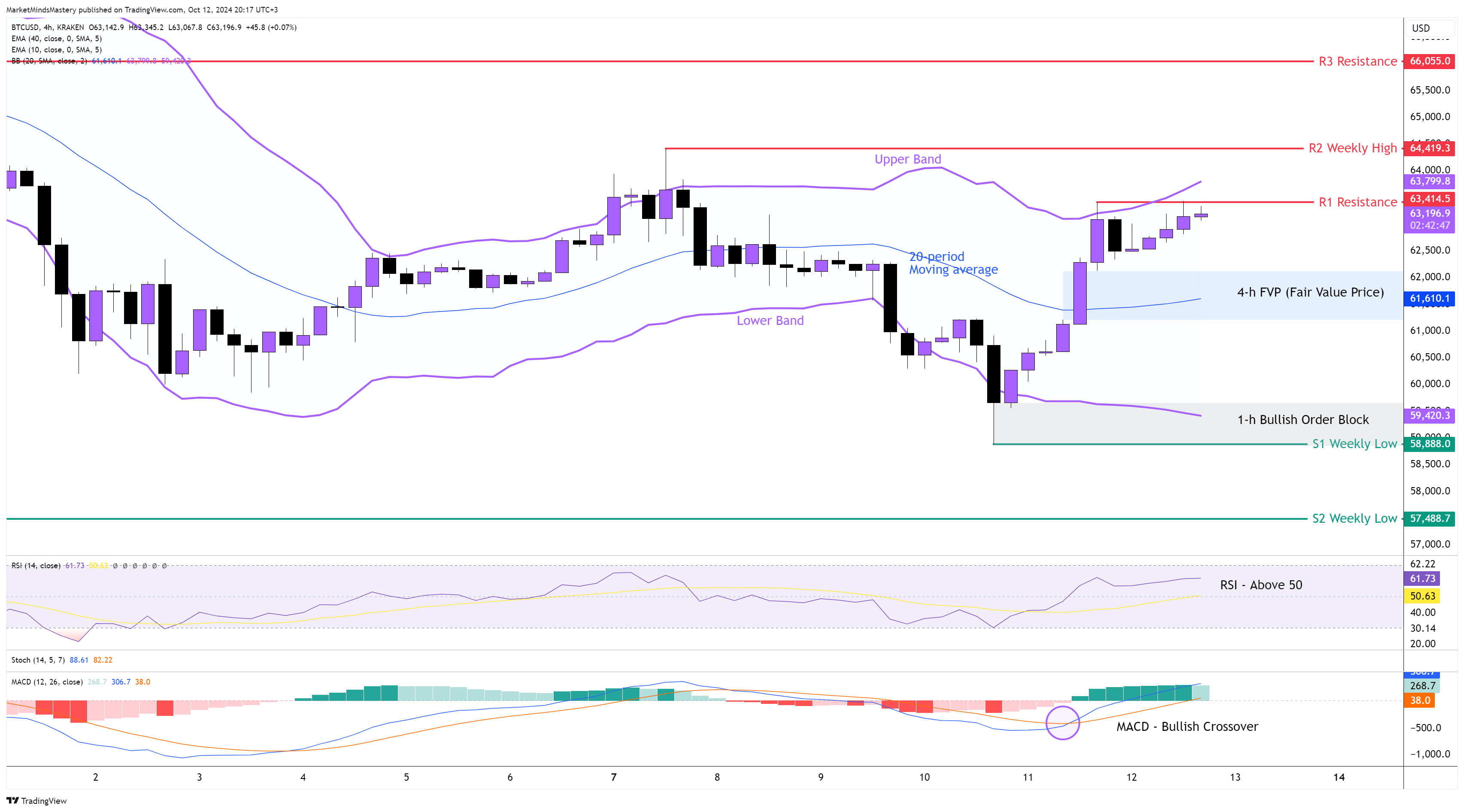 Öte yandan, fiyat aşağı doğru hareket ederse, 61600 $ civarında FVP'ye (Adil Değer Fiyatı) girecektir. FVP fiyatı reddeder ve düşmeye devam ederse, ilk destek alanı olan S1, önceki haftanın en düşük seviyesi olan 58888$'da olacak. Bu fiyat seviyesinde, geçtiğimiz Perşembe günü bir Bullish Order Block oluşturuldu ve fiyat için ek bir destek haline gelebilir. Fiyat S1'e nüfuz eder ve aşağı doğru hareket etmeye devam ederse, bir sonraki önemli destek seviyesi olan S2, 57488 $ olacaktır.