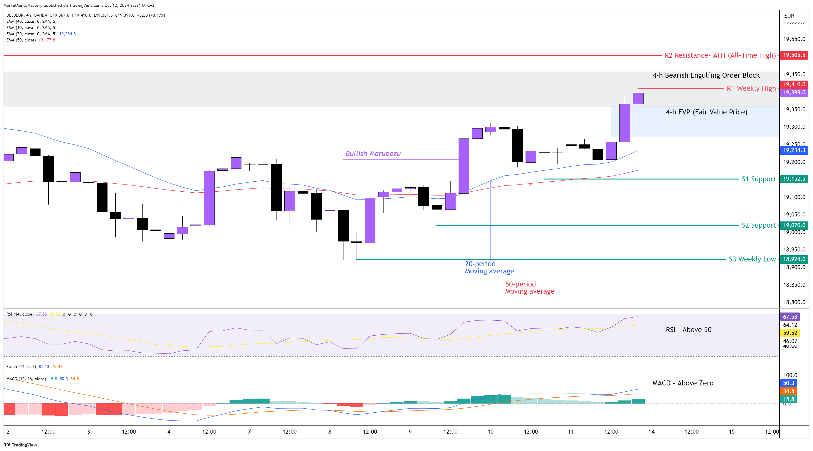 Geçtiğimiz hafta, Avrupa endeksleri bir önceki haftanın Piyasa Görünümünde bahsettiğimiz tüm fiyat seviyelerini başarıyla test etti. Geçtiğimiz Perşembe günü, fiyat 19300 civarında bir yüksek tepe formasyonu oluşturarak bir Marubozu mum çubuğu formasyonu oluşturdu. Bu yükseliş momentumu geçen haftanın sonuna kadar devam etti ve haftalık grafikte Uzun Alt Fitil ile bir Boğa mumu oluşturdu. 4 saatlik grafikte, 20 periyot, yükseliş etkileri olan 50 periyot hareketli ortalamanın üzerinde. RSI orta çizgisi olan 50'nin üzerinde ve bu yükseliş anlamına geliyor. MACD sıfır çizgisinin üzerindedir ve bunun yükseliş etkileri vardır. MACD'nin Histogramı yükseliyor ve fiyatın yukarı doğru hareket ettiğini gösteriyor. Şu anda fiyat 20 dönemlik hareketli ortalamanın üzerinde ve 19400 civarındaki Yutan Ayı Emir Bloğu alanı içinde. Bu nedenle, fiyat bu alandan reddedilir ve aşağı doğru hareket ederse, ilk destek alanı olan S1, 19152 civarında olacaktır. Fiyatın S1'e girmesi ve aşağı doğru hareket etmeye devam etmesi durumunda, bir sonraki destek alanı olan S2 yaklaşık 19020 olacaktır. Fiyat S2'yi aşar ve düşmeye devam ederse, bir sonraki destek alanı olan S3, bir önceki haftanın en düşük seviyesi olan 18924'te olacaktır.