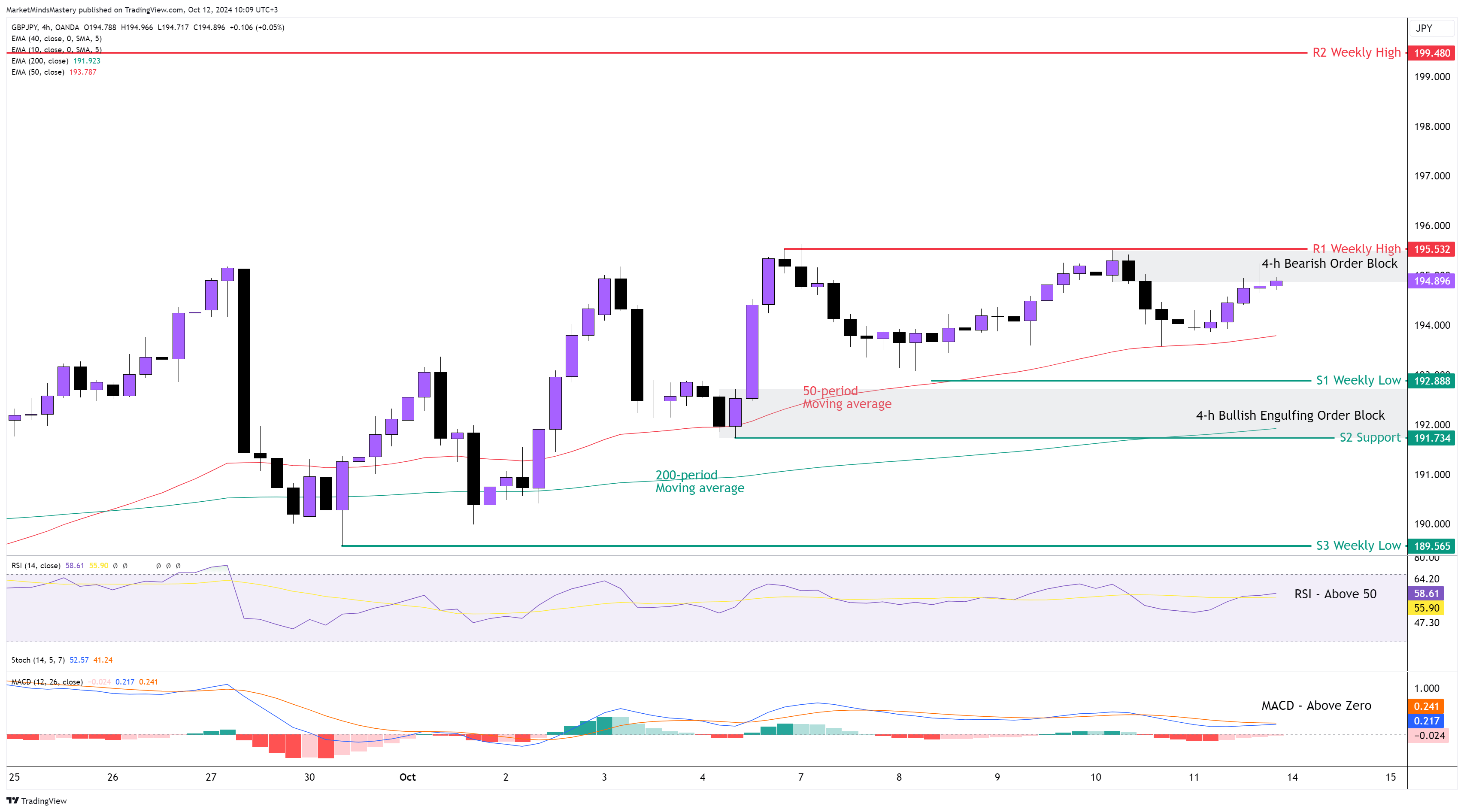 Fiyat geçen hafta yönlü bir hareket yaratmamış olsa da, geçen haftaki Piyasa Görünümünde işaret ettiğimiz FVP (Adil Değer Fiyatı)'yi hafifletti. Ardından, sıçradı ve yukarı doğru hareket ederek tüccarlar için yüksek olasılıkla takas edilebilir fırsatlar sundu. Haftalık grafik, yerleşim bölgelerinde bulunduğunda ters fiyat hareketi olarak kabul edilen bir Asılı Adam mum çubuğu formasyonuyla sona erdi. 4 saatlik grafikte, 50 periyot, 200 periyotluk hareketli ortalamanın üzerinde ve bunun yükseliş etkileri var. RSI Osilatörü orta çizgisi olan 50'nin üzerinde ve bu yükselişe işaret ediyor. MACD sıfırın üzerinde ve bu da yükseliş anlamına geliyor. Fiyat yüksek düşük formasyonunu koruyor, ancak daha yüksek zirveler yapmıyor. Şu anda fiyat, geçen Cuma günü oluşturulan Ayı Sipariş Bloğu civarında. Bu nedenle, fiyat reddedilir ve aşağı doğru hareket ederse, ilk destek alanı olan S1, önceki haftanın en düşük seviyesi olan 192.888 civarında olacaktır. Fiyat S1'i aşar ve aşağı doğru hareket etmeye devam ederse, bir sonraki destek alanı olan S2 191.734'te olacak. Fiyat, birkaç hafta önce oluşturulan Bullish Engulfing Order Block ve 200 dönemlik hareketli ortalama ile bir arada bulunduğu için bu kilit bir destek seviyesi olarak kabul ediliyor. Fiyat S2'ye nüfuz eder ve düşmeye devam ederse, bir sonraki destek alanı olan S3, bir önceki haftanın en düşük seviyesi olan 189.565'te olacak. Tersine, fiyat yukarı doğru hareket eder ve 195.000 civarındaki Ayı Emir Bloğu'na nüfuz ederse, ilk direnç alanı olan R1, önceki haftanın en yüksek seviyesi olan yaklaşık 195.532 olacaktır. Fiyat R1'e nüfuz eder ve yukarı doğru hareket etmeye devam ederse, bir sonraki direnç alanı R2, eski bir haftalık fiyat seviyesi olan 199.480 civarında olacaktır.