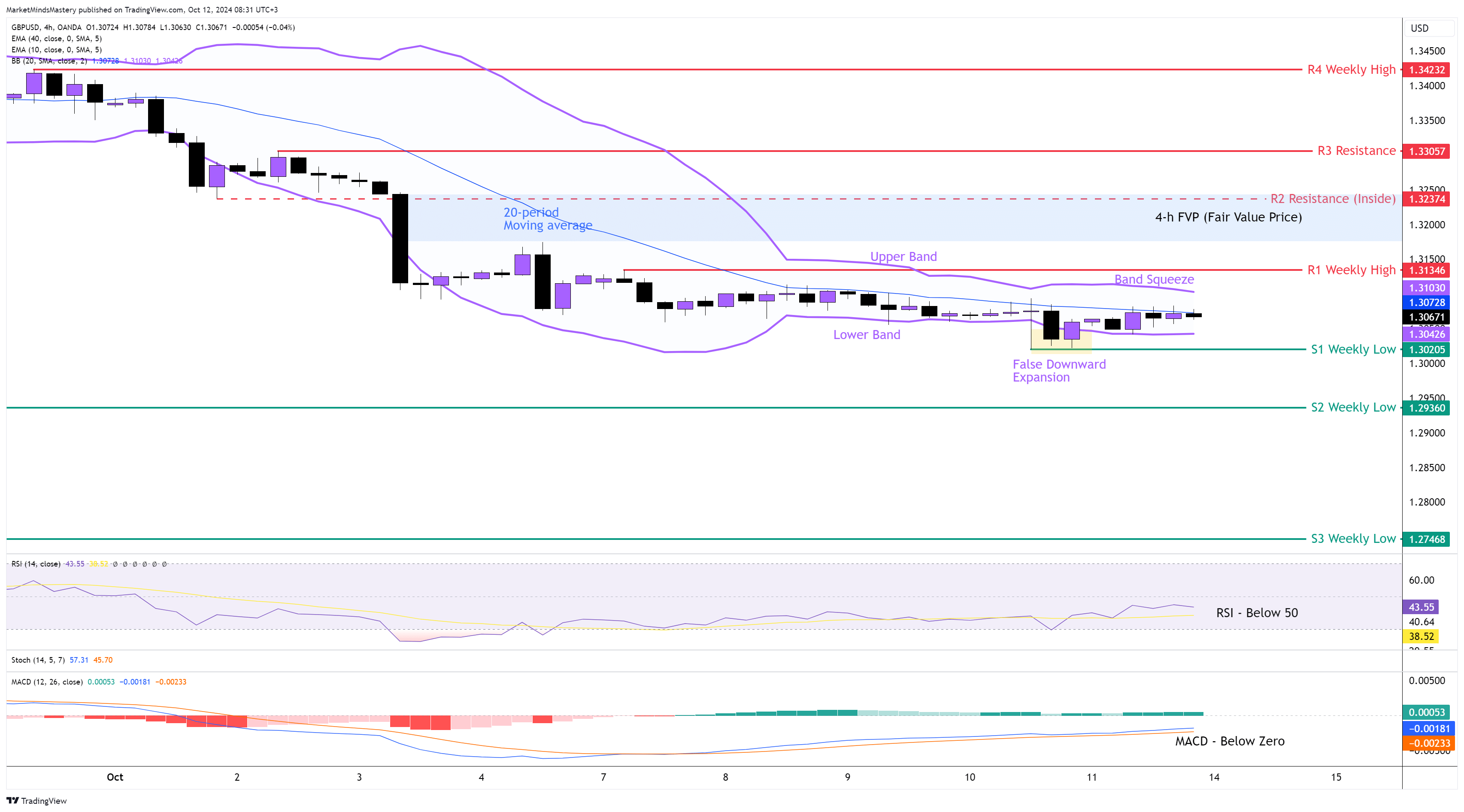 Geçtiğimiz Pazartesi günü, GBPUSD'nin fiyatı Ayı Yutan Emir Bloğu alanı olan 1,31300 civarında reddedildi. Ardından, geçen haftaki Piyasa Görünümünde grafikte işaret ettiğimiz S1 haftalık desteğine ulaşana kadar aşağı doğru hareket etti. Dolayısıyla, haftalık mum çubuğunun gövdesi sadece 430 puanlık (43 pip) bir aralığa sahiptir. Bu, ATR (Average True Range) göstergesine göre bu döviz çifti için önemsiz bir fiyat hareketidir. 4 saatlik grafikte, fiyat Bollinger Band göstergesinin sınırları içinde kalıyor. Geçen hafta, fiyat Bollinger Bandının ortası olan 20 dönemlik hareketli ortalamanın altında kaldığı için Üst Banda dokunulmadı. RSI, düşüş eğilimine işaret eden orta çizgisi 50'nin altında. MACD de düşüş eğilimi gösteren sıfır çizgisinin altında. Şu anda, Bantlar Squezze ve yukarı ya da aşağı yönlü bir hareket fark edilecek ve oynaklığın genişlemesi bekleniyor. Pazartesi gününden itibaren, fiyat aşağı yönlü hareket etmeye devam ederse, ilk destek alanı olan S1, bir önceki haftanın en düşük seviyesi olan 1,30205 civarında olacak. Fiyat S1 desteğini aşar ve düşmeye devam ederse, bir sonraki destek alanı olan S2 1,29360 civarında olacak.