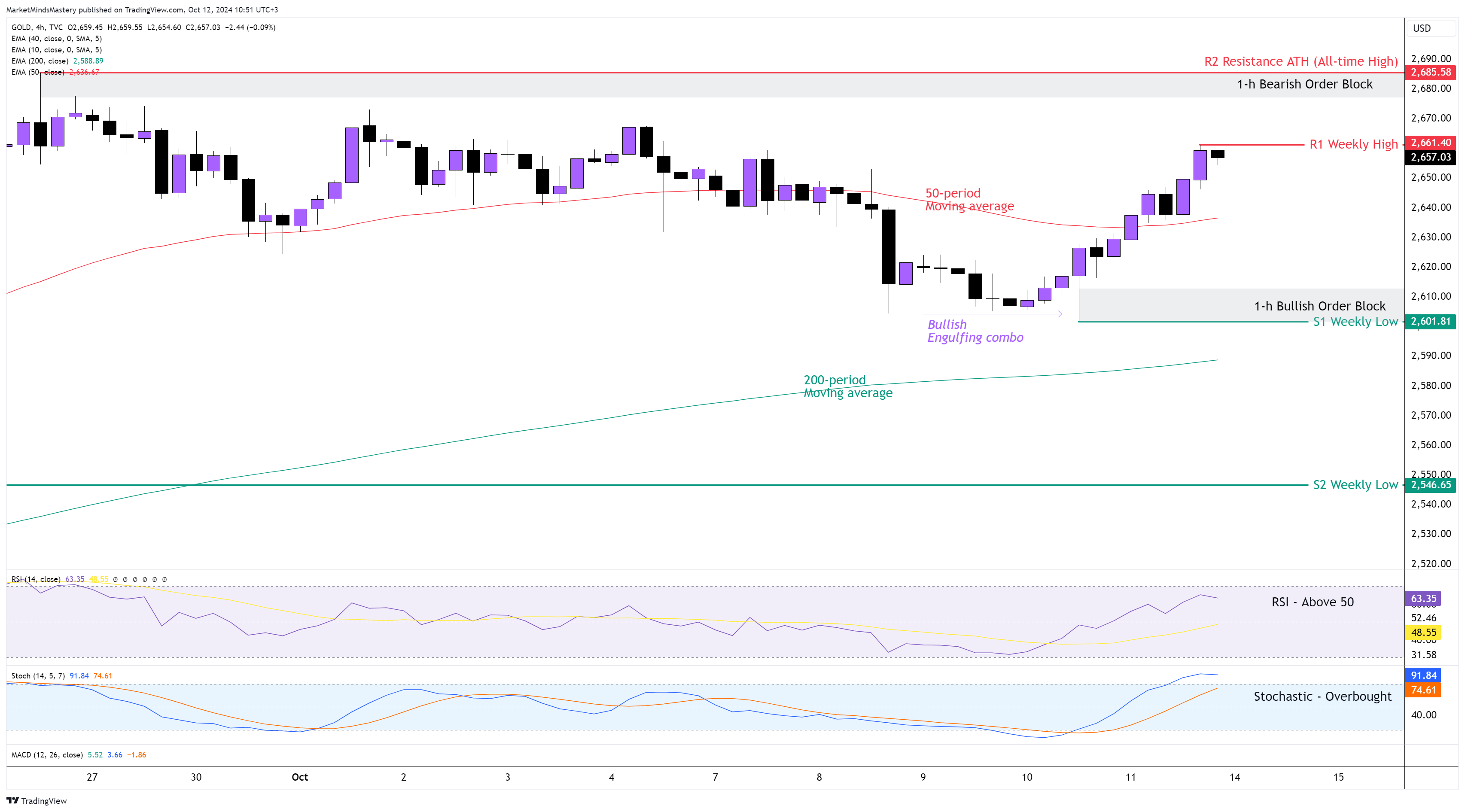 Geçen hafta ALTIN fiyatı, geçen haftaki piyasa analizinde bahsettiğimiz haftalık mumun en düşük seviyesi olan 2625$'ın altına indi. Ancak, geçen haftanın sonunda fiyat toparlandı, yukarı doğru hareket etti ve Uzun Alt Fitil ile Bullish Candle olarak kapandı. Bu, Altın fiyatının bir hafta daha ATH (Tüm zamanların en yüksek seviyesi) civarında seyretmek istediğini gösteriyor. 4 saatlik grafik incelendiğinde, 50 periyotluk yükseliş eğilimi gösteren 200 periyotluk hareketli ortalamanın üzerinde kalmaya devam ediyor. RSI 50'nin üzerinde ve yükselişe işaret ediyor. Stokastik Osilatör Aşırı Alım Durumunda ve bunun yükseliş etkileri var. Dalgalanma analizi ve piyasa yapısına göre, fiyat üç hafta önce başlayan uzun vadeli bir aralıkta işlem görüyor. Şu anda fiyat 50 dönemlik hareketli ortalamanın üzerinde. Bu nedenle, fiyat yukarı doğru hareket etmeye devam ederse, ilk direnç alanı olan R1, önceki haftanın en yüksek seviyesi olan 2661 $ civarında olacaktır. Fiyat R1'i aşar ve yukarı doğru hareket etmeye devam ederse, bir sonraki direnç alanı olan R2, yaklaşık 2685 $ olan ATH (Tüm Zamanların En Yüksek) seviyesi olacaktır. Bu fiyat seviyesinde, üç hafta önce 1 saatlik grafikte bir Ayı Emir Bloğu oluşturuldu. Henüz test edilmediği için, fiyat onu aşarsa, muhtemelen bunu fark edilir miktarda dalgalanma ile yapacaktır.