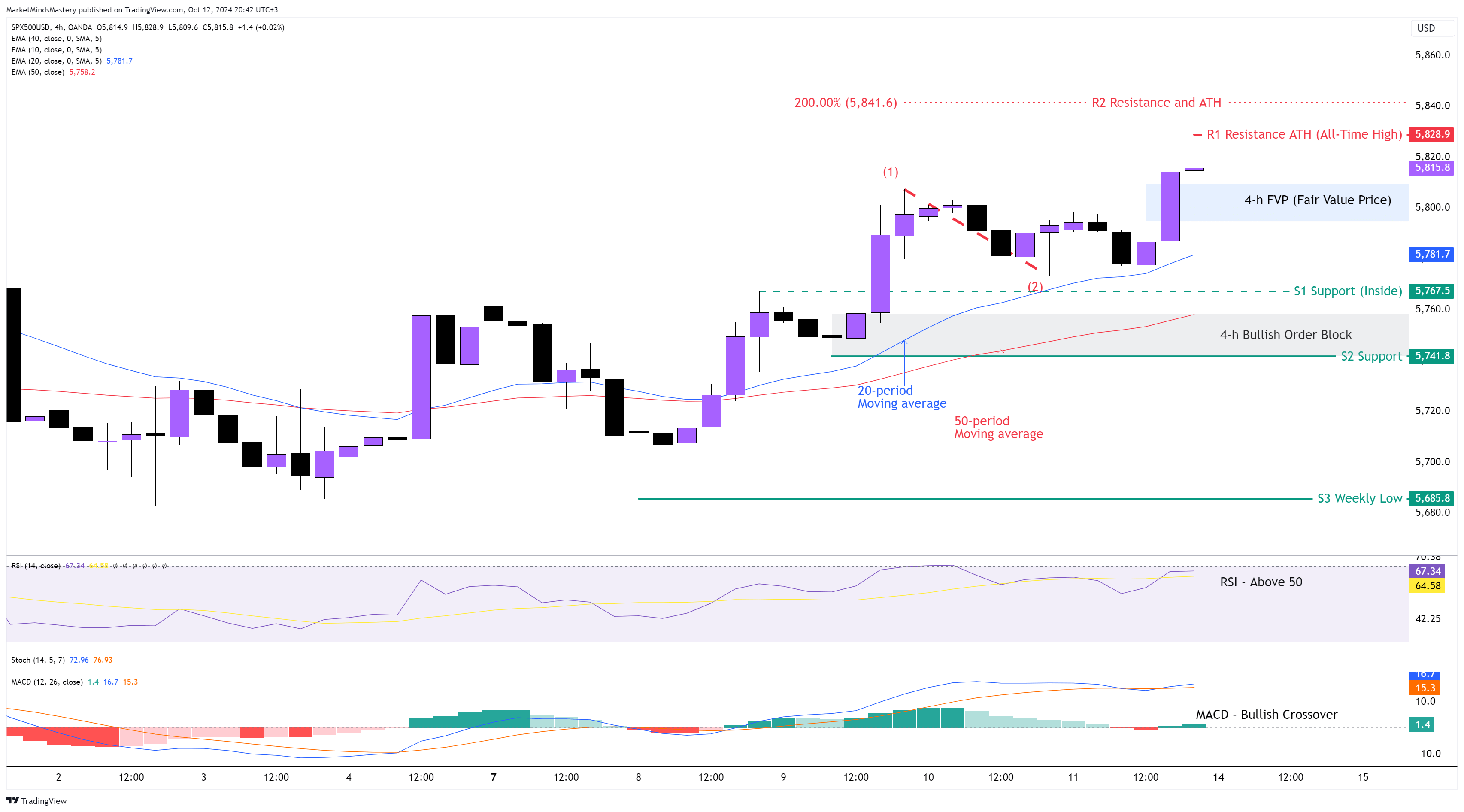 Geçen hafta fiyat, bir önceki haftanın Piyasa Analizinde işaret ettiğimiz %200 Fibonacci Uzantısı olan 5830 $ civarında yeni bir ATH (Tüm Zamanların En Yüksek Seviyesi) yarattı. Bu da MACD Çizgisinin (Mavi) MACD göstergesinin yükselişe işaret eden Sinyal Çizgisinin (Turuncu) üzerine çıkmasına neden oldu. Eş zamanlı olarak, RSI Osilatörü de yükselişe işaret eden orta çizgisi 50'nin üzerinde kaldı. Şu anda, fiyat 20 dönemlik hareketli ortalamanın üzerinde ve bu da yükselişe işaret ediyor. Geçen Çarşamba, fiyat 5750$ civarında bir Bullish Order Block oluşturdu ve geçen Cuma, 5800$ civarında bir FVP (Fair Value Price) oluşturdu.