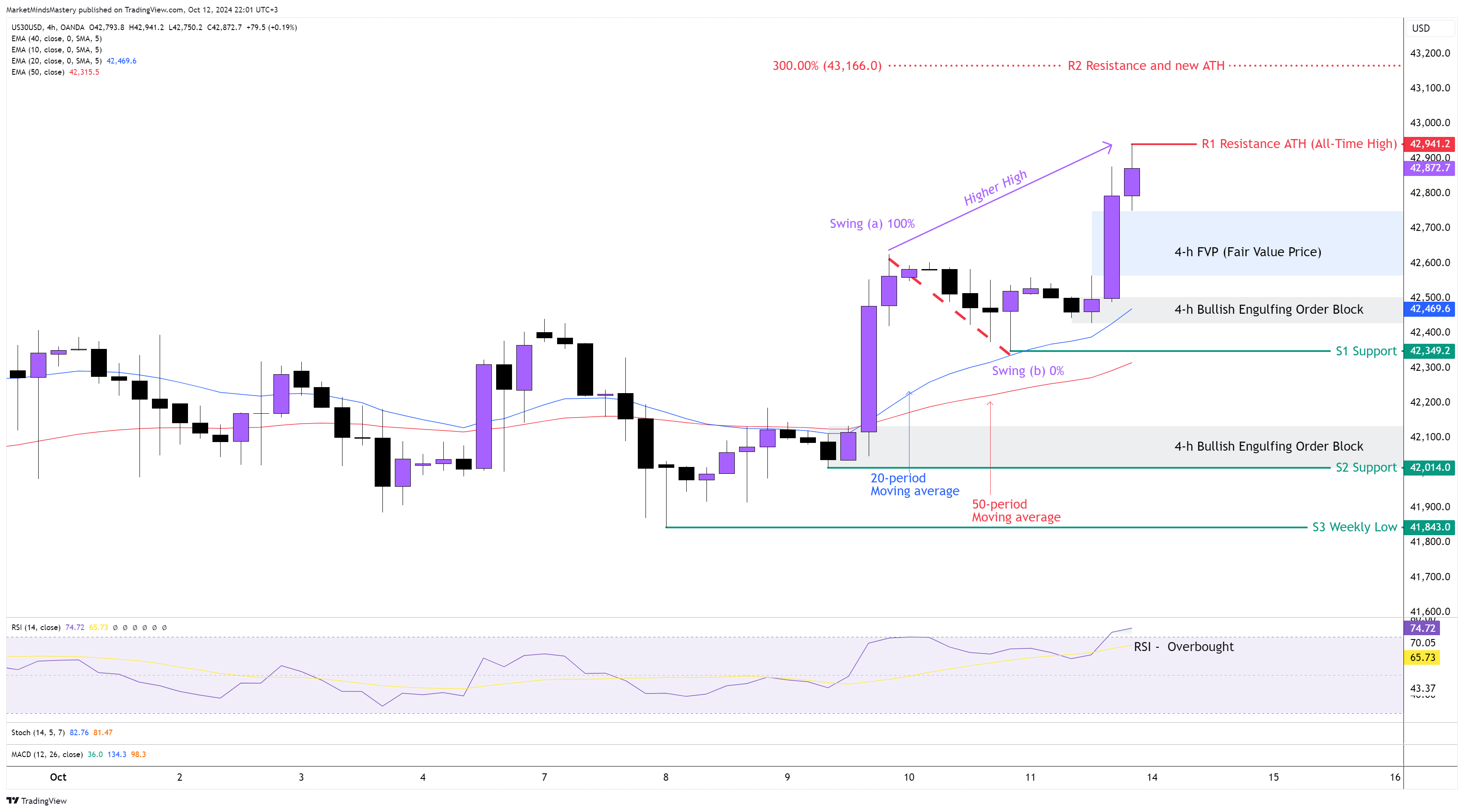 Geçen hafta US30'da oluşan ivme belirgindi ve geçen Çarşamba ve geçen Cuma New York Ticaret Seansı sırasında dalgalanma dikkat çekiciydi. Haftalık grafikteki fiyat hareketi Bullish Engulfing, olarak sona erdi ve fiyat yeni bir ATH (All-time High) yarattı. Bu nedenle, RSI Osilatörü yükseliş etkileri olan Aşırı Alım koşuluna girdi. 20 periyotluk hareketli ortalama 50 periyotluk hareketli ortalamanın üzerinde ve bu da yükseliş anlamına geliyor. Geçtiğimiz Cuma günü, fiyat yeni bir yüksek tepe formasyonu yarattı ve ayrıca 42600 dolar civarında, henüz hafifletilmemiş bir FVP (Adil Değer Fiyatı) oluşturdu. Pazartesi gününden itibaren, fiyat reddedilir ve aşağı doğru hareket ederse, ilk destek alanı olan S1, 42349 $ civarında olacak. Geçtiğimiz Cuma günü S1'in biraz üzerinde fiyat, fiyat için ek bir destek faktörü haline gelebilecek bir Bullish Engulfing Order Block, yarattı. Fiyat S1'e nüfuz eder ve aşağı doğru hareket etmeye devam ederse, bir sonraki destek alanı olan S2, 42000 $ civarında olacaktır. Bu, geçen Çarşamba günü oluşturulan 4 saatlik Boğa Yutan Sipariş Bloğu ile bir arada bulunduğu için anahtar bir destek seviyesidir. Fiyatın S2'ye nüfuz etmesi ve düşmeye devam etmesi durumunda, bir sonraki destek alanı olan S3, bir önceki haftanın en düşük seviyesi olan 41843 $ 'da olacak.