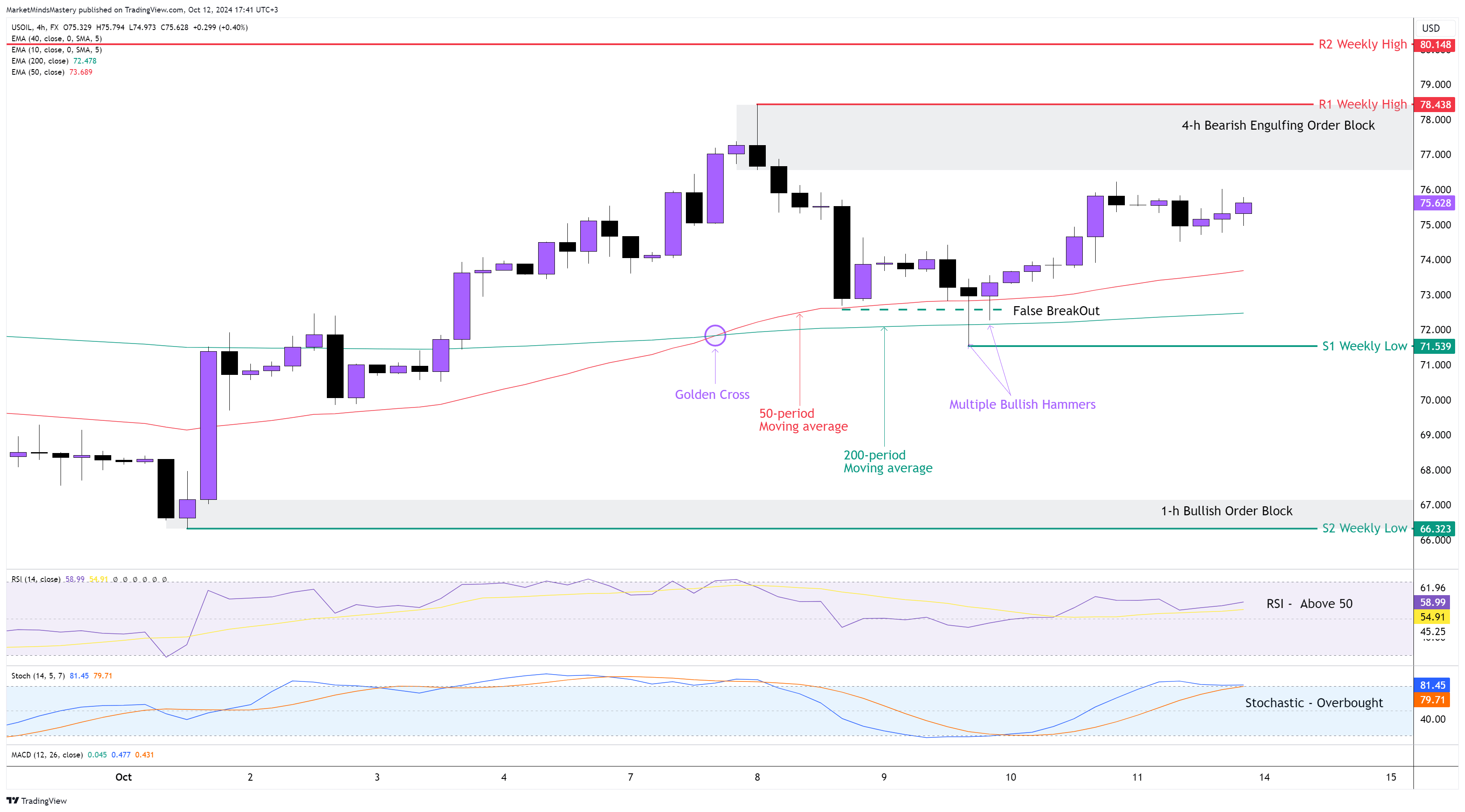 Tersine, fiyat reddedilir ve aşağı doğru hareket ederse, ilk destek alanı S1, önceki haftanın en düşük seviyesi olan yaklaşık 71,53 $ olacaktır. Fiyat S1'i aşarsa, piyasa büyük olasılıkla bir düşüş trendi başlatacaktır. Bu gerçekleşir ve fiyat aşağı doğru hareket etmeye devam ederse, bir sonraki destek alanı olan S2, daha eski bir haftalık seviye olan 66,32 $ civarında olacaktır. Birkaç hafta önce bir 1-h Bullish Order Block oluşturuldu, ancak henüz test edilmedi.