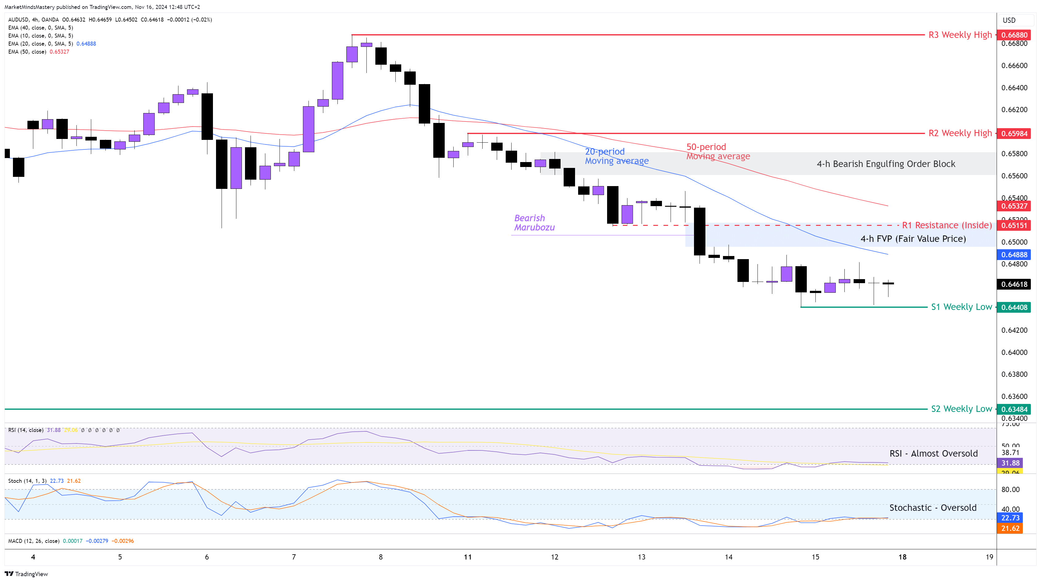 Benzer şekilde, Stochastic Osilatör neredeyse aşırı satım durumunda ve bu da düşüş eğilimi gösteriyor. Pazartesi gününden itibaren, fiyat aşağı doğru hareket etmeye devam ederse, ilk destek alanı olan S1, önceki haftanın en düşük seviyesi olan 0,64408 civarında olacak. Fiyat S1'e nüfuz eder ve aşağı doğru hareket etmeye devam ederse, bir sonraki destek alanı olan S2, daha eski bir haftalık seviye olan 0.63484'te olacak. Öte yandan, fiyat sıçrar ve yukarı doğru hareket ederse, ilk direnç alanı olan R1, 0.65151 civarında bir İç direnç olacaktır. Bu önemli bir alan olarak kabul edilir çünkü 4 saatlik FVP ve 20 dönemlik hareketli ortalama ile bir arada bulunur. Fiyat R1'e nüfuz eder ve yukarı doğru hareket etmeye devam ederse, bir sonraki direnç olan R2, bir önceki haftanın en yüksek seviyesi olan 0.65984'te olacaktır.