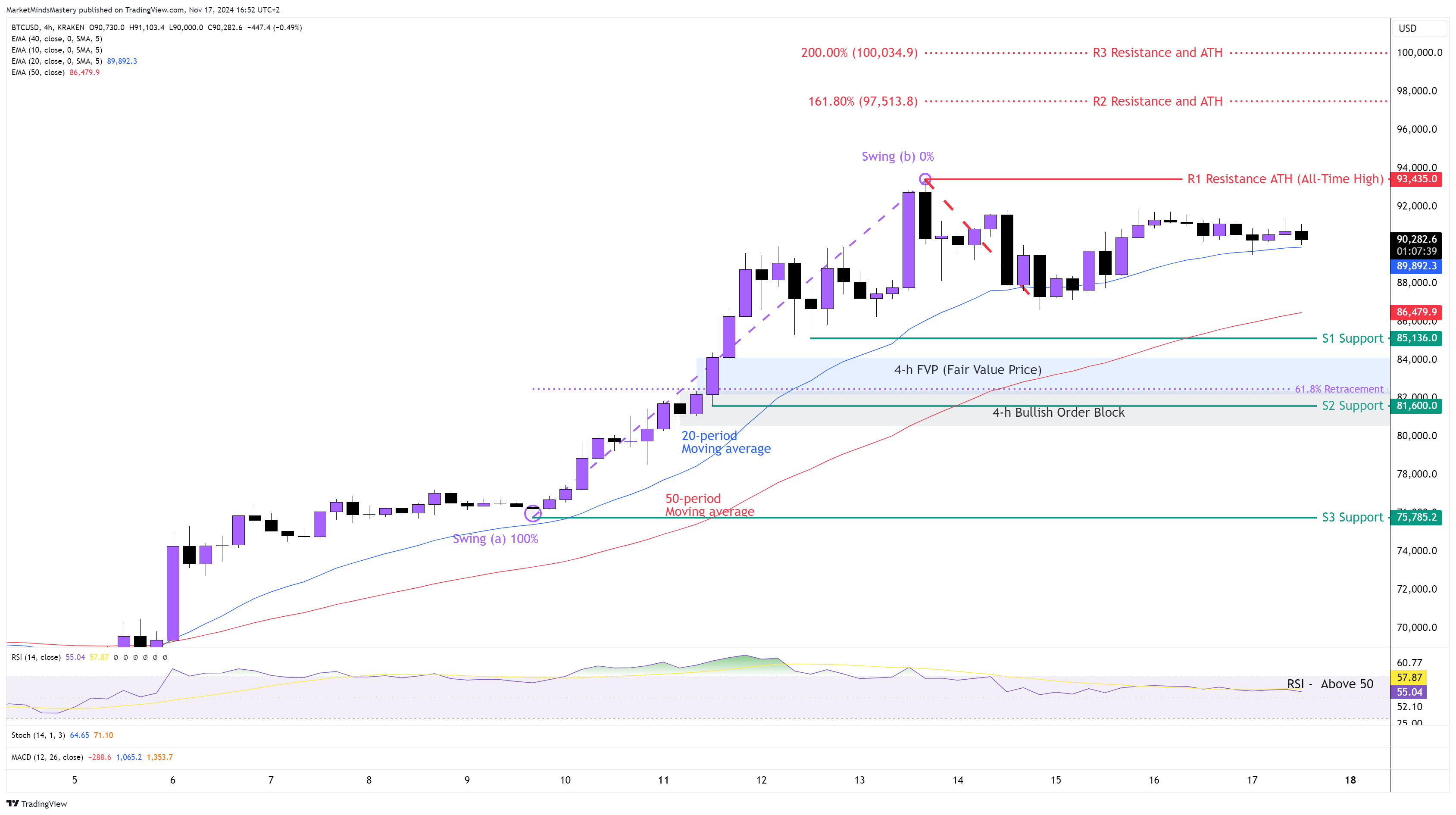 Öte yandan, fiyat reddedilir ve bir geri çekilme aşamasına başlarsa, aşağı doğru hareket etmeye başlayacak ve ilk destek alanı olan S1, 85136 $ civarında olacak. Fiyat S1'e nüfuz eder ve düşmeye devam ederse, bir sonraki destek alanı olan S2 81600 $ olacaktır. Bu, bir Bullish Engulfing Order Block, bir FVP (Fair Value Price) ve 61,8% Fibonacci Golden Ratio'dan oluştuğu için önemli bir destek seviyesi olarak kabul edilir.