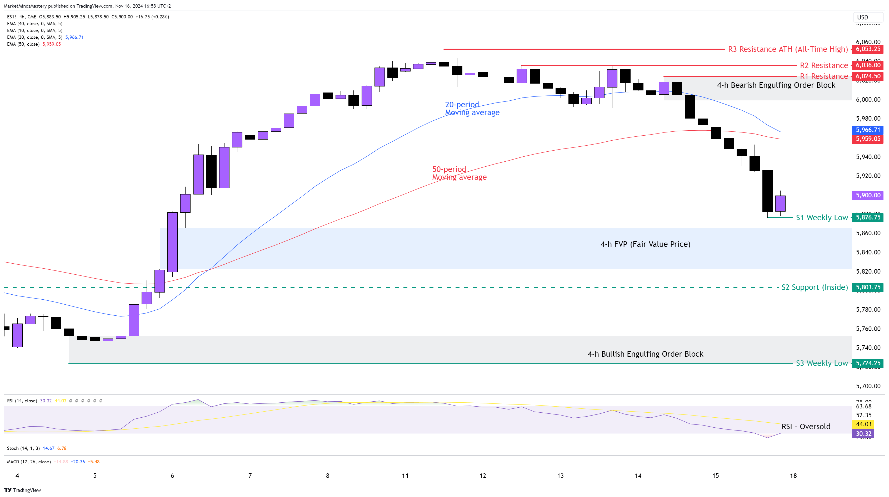 Haftalık grafikteki fiyat yukarı yönlü ivmesini kaybetti ve fiyat hareketi bir İçeride Ayı mumu olarak sona erdi. 4 saatlik grafiğe daha yakından bakıldığında, fiyatın yeni bir ATH (Tüm Zamanların En Yüksek Seviyesi) yaptığı görülüyor, ancak bu sadece 6050 $ civarında yanlış bir yukarı doğru kırılma oldu. O zamandan beri, yani geçen Salı gününden itibaren, fiyat ivme kaybediyor ve Ayı mumları fiyat tablosunda daha belirgin hale geldi. Fiyat daha düşük zirveler yapmaya başladı ve geçen Perşembe günü satış baskısı belirgindi ve fiyat Asya, Londra ve New York'taki tüm büyük işlem seanslarında iki gün üst üste düştü. Bu da RSI'nın 30'luk alt çizgisinin altına düşmesine neden oldu ve ardından düşüş eğilimi gösteren Aşırı Satım haline geldi. Dolayısıyla, fiyat aşağı doğru hareket etmeye devam ederse, ilk destek alanı olan S1, bir önceki haftanın en düşük seviyesi olan 5876,75$'da olacak. Fiyat S1'e nüfuz eder ve düşmeye devam ederse, bir sonraki destek alanı olan S2, 5803,75 $ 'da bir İç destek olacaktır. Fiyat S2'ye nüfuz eder ve aşağı doğru hareket etmeye devam ederse, bir sonraki destek alanı olan S3 5724,25 $ olacaktır.
