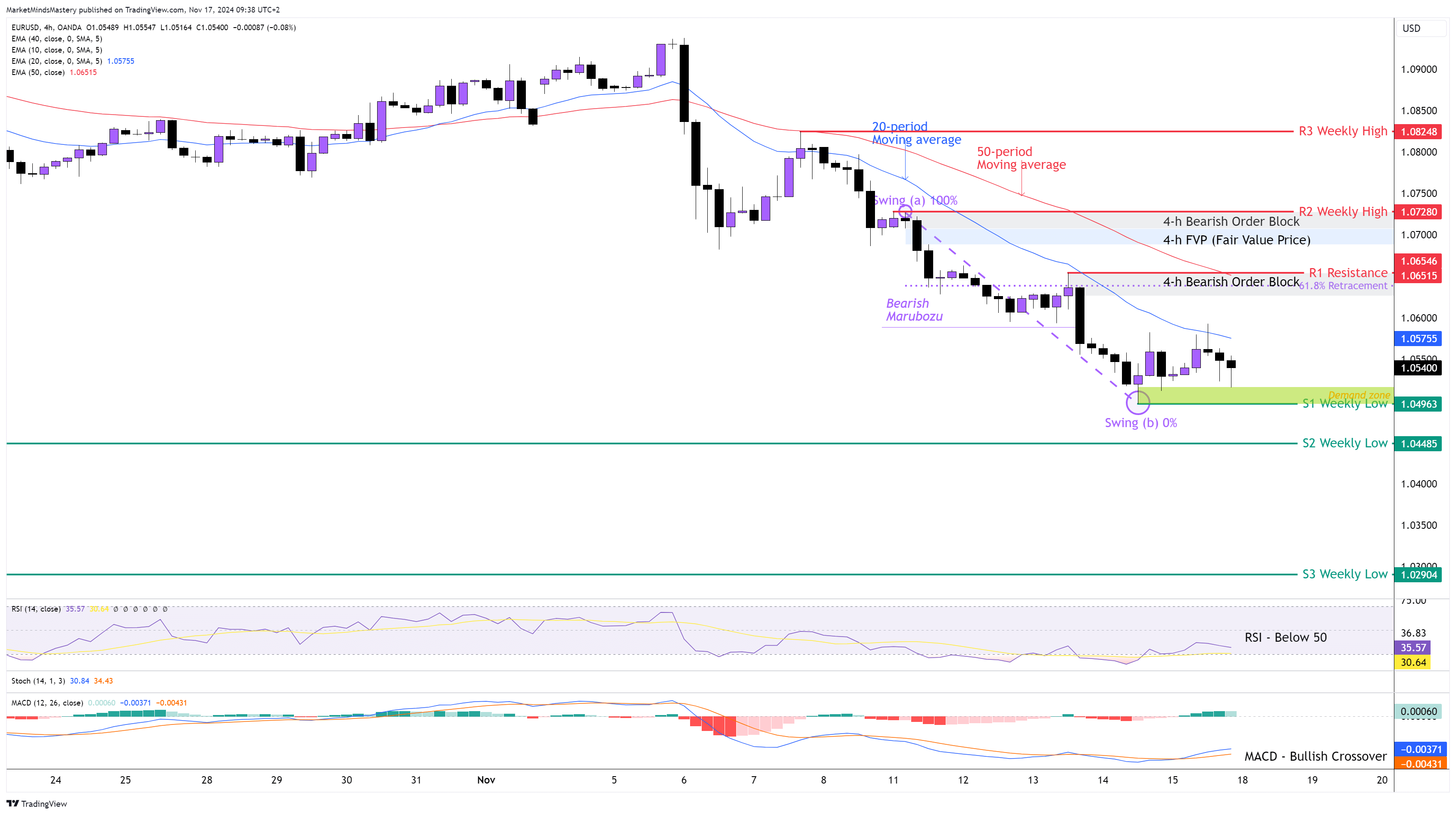 Öte yandan, fiyat yukarı doğru hareket ederse, ilk direnç alanı olan R1, 1.06546 civarında olacaktır. Bu, (a) noktasındaki salınımdan (b) noktasındaki salınıma kadar ölçülen Fibonacci seviyesinin % 61,8 Altın Oranı, Bearish Order Block ve 50 dönemlik hareketli ortalamadan oluştuğu için önemli bir direnç seviyesidir. Fiyat R1'e nüfuz eder ve artmaya devam ederse, bir sonraki direnç alanı olan R2, önceki haftanın en yüksek seviyesi olan 1.07280 civarında olacaktır.