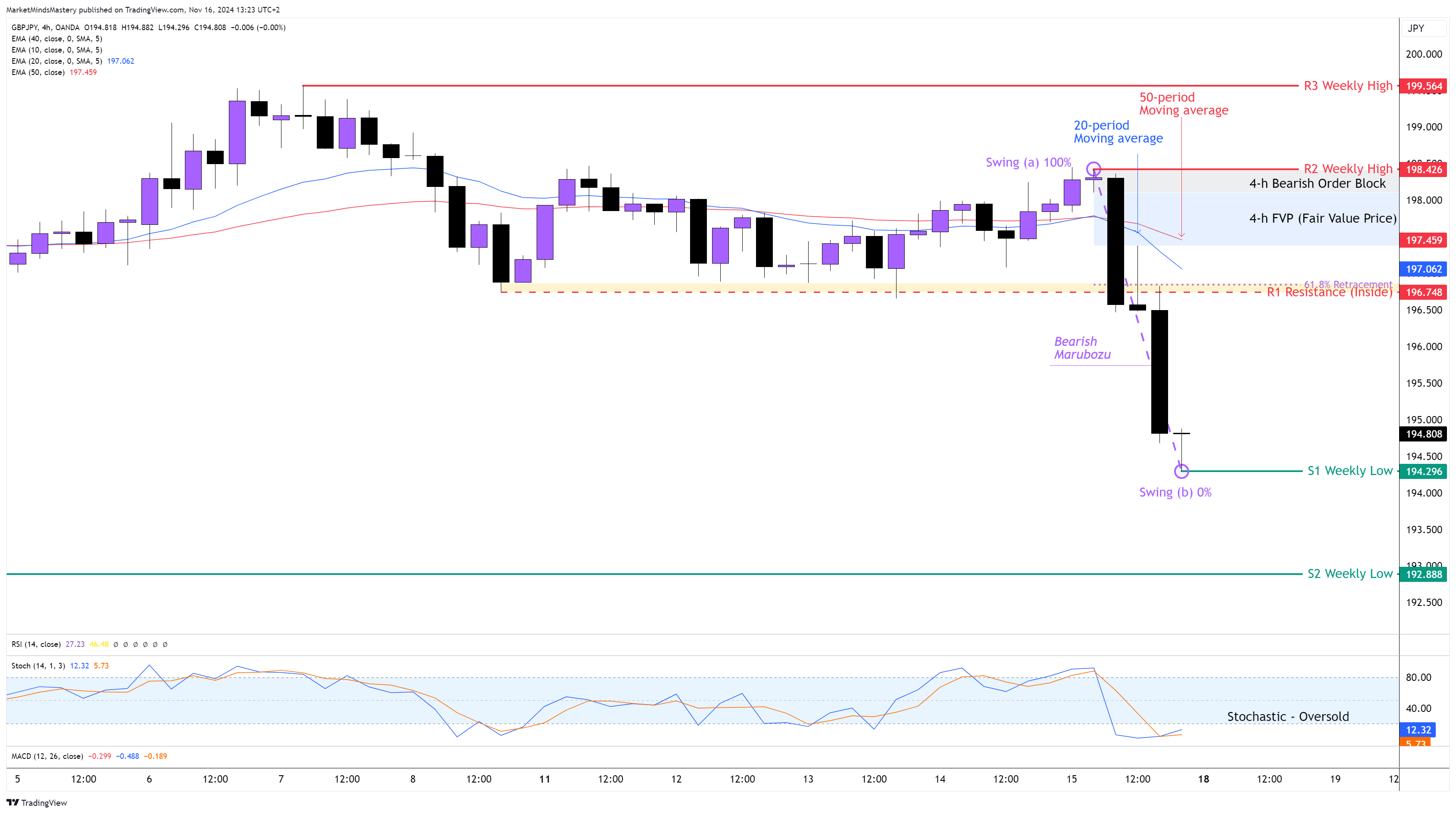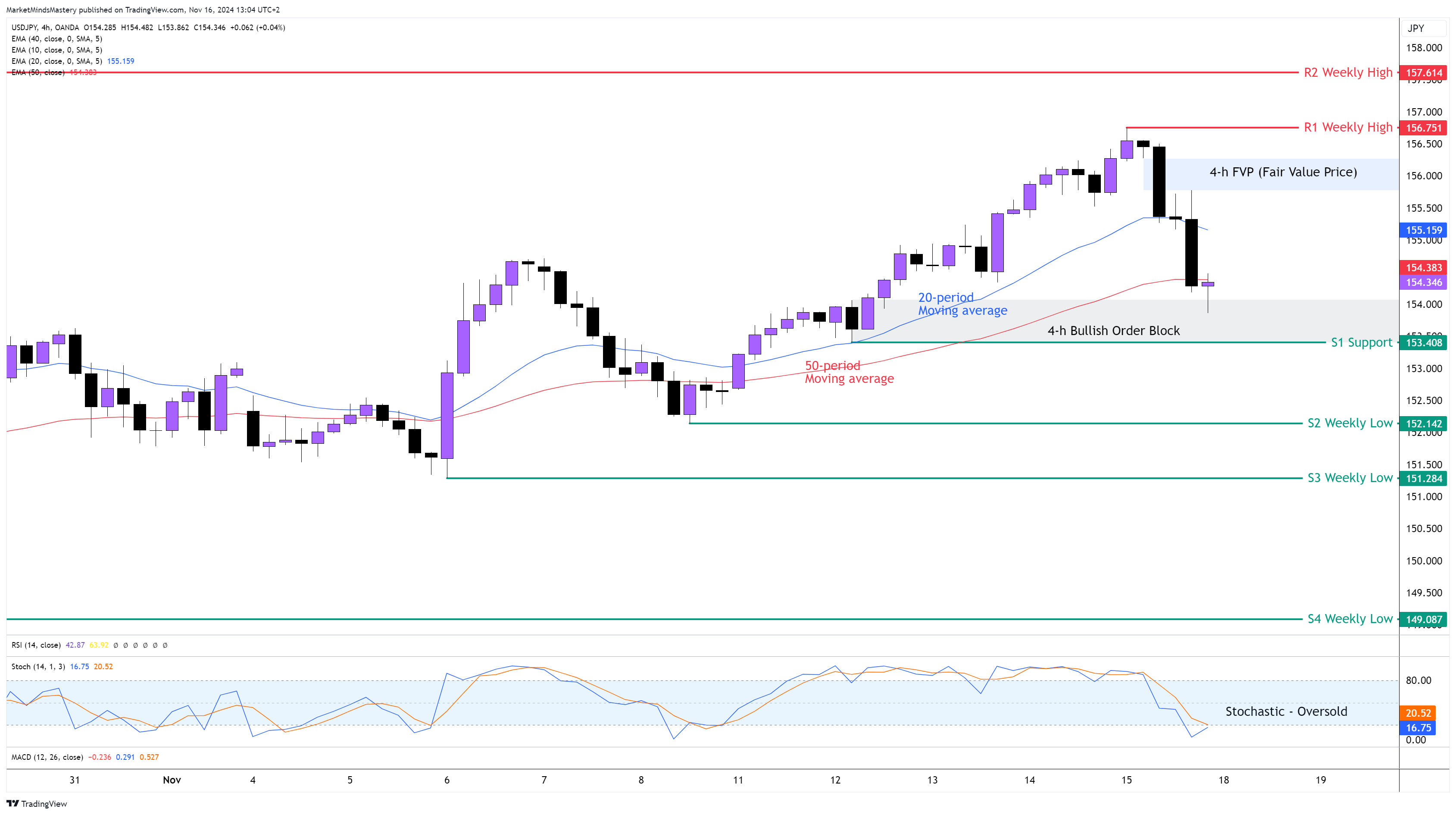 ABD Dolarının geçen haftaki gücüne rağmen, Japon Yeni bir sonraki en güçlü para birimi oldu. Bu nedenle, haftalık grafikteki fiyat bir Boğa mumu olarak sona erdi, ancak bu hafta bir miktar düşüşe neden olabilecek gözle görülür bir Üst Fitil ile. 4 saatlik grafikte 20 periyot, 50 periyot hareketli ortalamanın üzerinde ve bu yükseliş anlamına geliyor. Fiyat geçen Cuma gününe kadar daha yüksek zirveler ve daha yüksek dipler yapıyordu. Geçtiğimiz Salı günü, fiyat 154.000 civarında bir Bullish Order Block oluşturdu. Son olarak, Cuma günü fiyat düşerken, henüz test edilmemiş olan 156.000 civarında bir FVP (Adil Değer Fiyatı) oluşturuldu. Stochastic Osilatör bir Aşırı Satım durumunda ve bu düşüş eğilimi gösteriyor. Geçtiğimiz Cuma günü, fiyat Sipariş Bloğu alanına girdi ve grafikte gösterildiği gibi 50 dönemlik hareketli ortalamanın da altında kapandı.