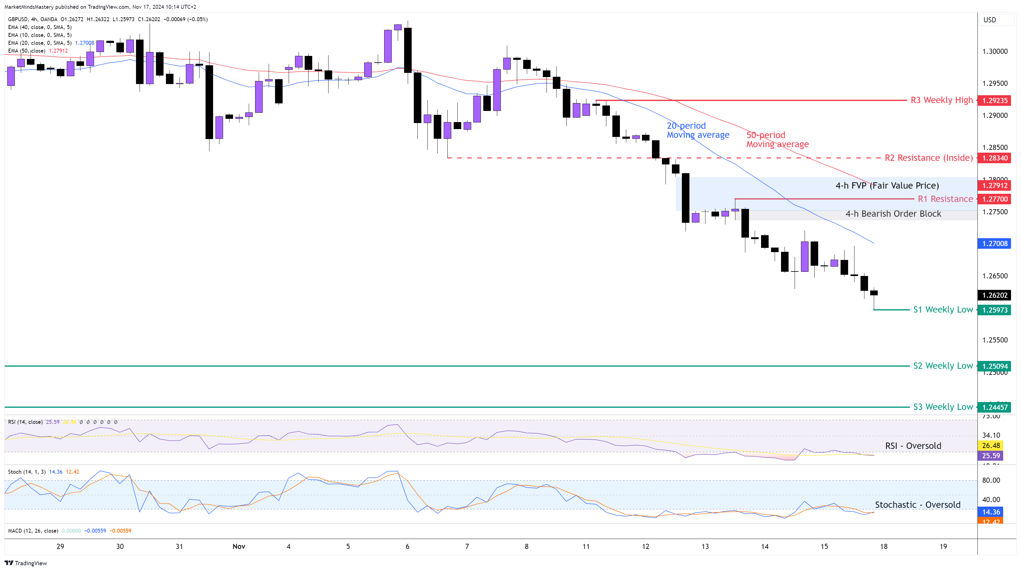 Bir önceki haftanın Piyasa Görünümünün ardından, yatay hareket aşağı yönlü kırılma olarak sona erdi. Haftalık grafikteki fiyat hareketi bir Ayı Devamı candlestick olarak sona erdi. 4 saatlik grafikte, fiyat bir dizi düşük en yüksek ve düşük en düşük seviyeler oluşturdu. Geçtiğimiz Salı günü, New York işlem seansı sırasında fiyat 1,28000 civarında bir FVP (Adil Değer Fiyatı) oluşturdu. Fiyat daha sonra bir süre konsolide oldu ve ertesi gün yeni bir düşük dip formasyonu ile devam ederek 1,27500 civarında bir Ayı Emir Bloğu oluşturdu. Hareketli ortalama analizine göre, 20 periyot 50 periyodun altında ve bu düşüş eğilimi gösteriyor. Hem RSI hem de Stochastic Osilatörler Aşırı Satım durumundadır ve bunun da düşüş yönünde etkileri vardır. Bu nedenle, fiyat aşağı doğru hareket etmeye devam ederse, ilk destek alanı olan S1, önceki haftanın en düşük seviyesi olan 1,25973 civarında olacaktır. Fiyat S1'e nüfuz eder ve düşmeye devam ederse, bir sonraki destek alanı olan S2 1.25094 civarında olacaktır.