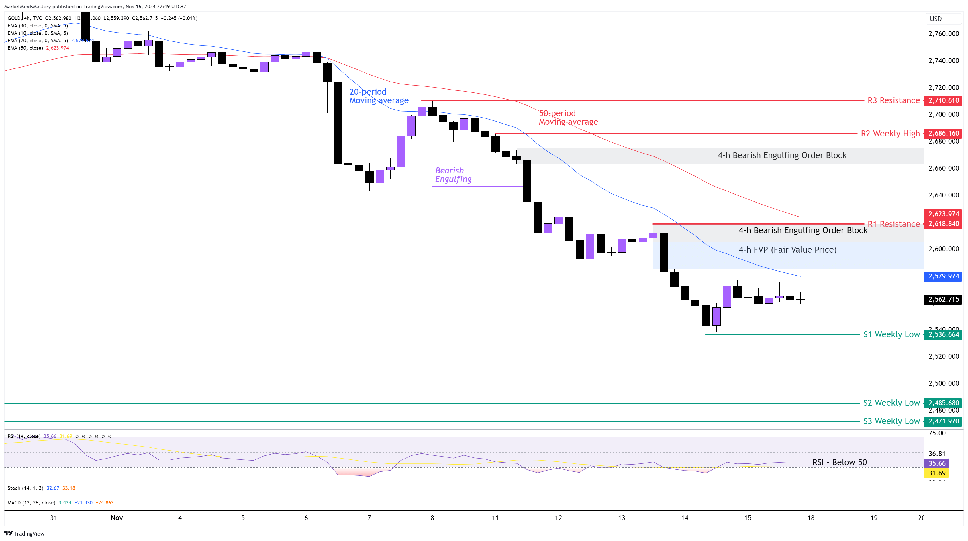 ALTIN fiyatı ham olarak bir hafta daha geriledi. Haftalık birincil trend yükseliş trendidir. Ancak, 4 saatlik grafikteki gibi daha düşük zaman dilimlerinde, fiyat bir dizi düşük yüksek ve düşük düşük ile güçlü bir düşüş trendi yarattı. Pazartesi ve Çarşamba günü, fiyat sırasıyla 2670 ve 2610 dolar civarında iki Ayı Yutan Emir Bloğu oluşturdu. Ayrıca, Çarşamba günü New York işlem seansı sırasında fiyatın güçlü bir şekilde satılması, 2600$ civarında bir FVP (Adil Değer Fiyatı) yarattı. 20 periyot, 50 periyotluk hareketli ortalamanın altında ve bu düşüş eğilimi gösteriyor. RSI Osilatörü orta çizgisi olan 50'nin altında ve bu da aşağı yönlü etkilere sahip. Şu anda fiyat 20 dönemlik hareketli ortalamanın altında. Fiyat aşağı doğru hareket etmeye devam ederse, ilk destek alanı olan S1, bir önceki haftanın en düşük seviyesi olan 2536 $ 'da olacak. Fiyat S1'e nüfuz eder ve düşmeye devam ederse, bir sonraki destek alanı olan S2 2485 $ 'da olacaktır. Tersine, fiyat yukarı doğru hareket ederse, ilk direnç alanı olan R1 2623 $ 'da olacaktır. Bu önemli bir direnç seviyesi olarak kabul ediliyor çünkü geçen Çarşamba günü 2600 $ civarında oluşan 4 saatlik Yutan Ayı Emir Bloğu ve 50 dönemlik hareketli ortalamadan oluşuyor. Fiyat R1'e nüfuz eder ve artmaya devam ederse, bir sonraki direnç alanı olan R2, önceki haftanın en yüksek seviyesi olan yaklaşık 2686 $ olacaktır.