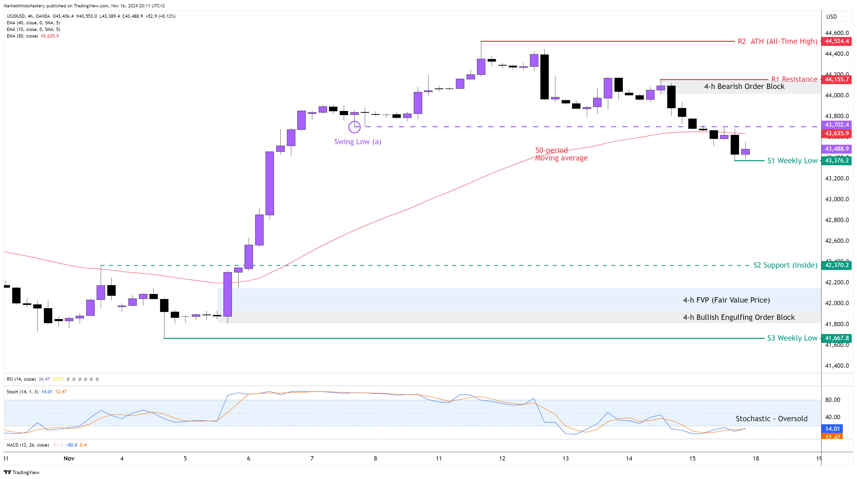 Bir önceki haftanın Piyasa Görünümünün ardından US30 fiyatı yukarı doğru hareket ederek 44524$ civarında %300 Fibonacci Uzantısını test etti ve bu da yeni bir ATH (Tüm Zamanların En Yüksek Seviyesi) yarattı. O zamandan beri, grafikte gösterildiği gibi büyük Ayı mumlarıyla aşağı doğru hareket etmeye başladı. Geçtiğimiz Cuma günü fiyat, son yukarı yönlü hareketin başlangıcı olan (a) noktasındaki düşük dalgalanmaya nüfuz etti, bu da yükseliş trendinin artık geçerli olmadığı anlamına geliyor. New York işlem seansının sonunda, fiyat 50 dönemlik hareketli ortalamanın altında kapandı ve bunun düşüş yönünde etkileri var. Bu aynı zamanda Stochastic Osilatör'ün Aşırı Satım haline gelmesine neden oldu ve US30 piyasasının satış emirleri tarafından agresif bir şekilde satıldığını gösterdi. Fiyat aşağı doğru hareket etmeye devam ederse, ilk destek alanı olan S1, bir önceki haftanın en düşük seviyesi olan 43376$'da olacak. Fiyat S1'e nüfuz eder ve aşağı doğru hareket etmeye devam ederse, bir sonraki destek alanı olan S2, birkaç hafta önce oluşturulan 42370 $ 'lık bir İç destek olacaktır. Tersine, fiyat sıçrar ve yukarı doğru hareket ederse, ilk direnç alanı olan R1, 44155 $ 'da olacaktır. Bu, geçen Perşembe günü oluşturulan ve grafikte gösterildiği gibi fiyatın kırılmasına ve trend yönünün değişmesine neden olan 4-h Bearish Engulfing Order Block ile bir arada bulunduğu için önemli bir direnç alanı olarak kabul edilir. Fiyat R1'e nüfuz eder ve artmaya devam ederse, bir sonraki direnç alanı olan R2, 44524 $ 'da ATH (Tüm Zamanların En Yüksek Seviyesi) olacaktır.