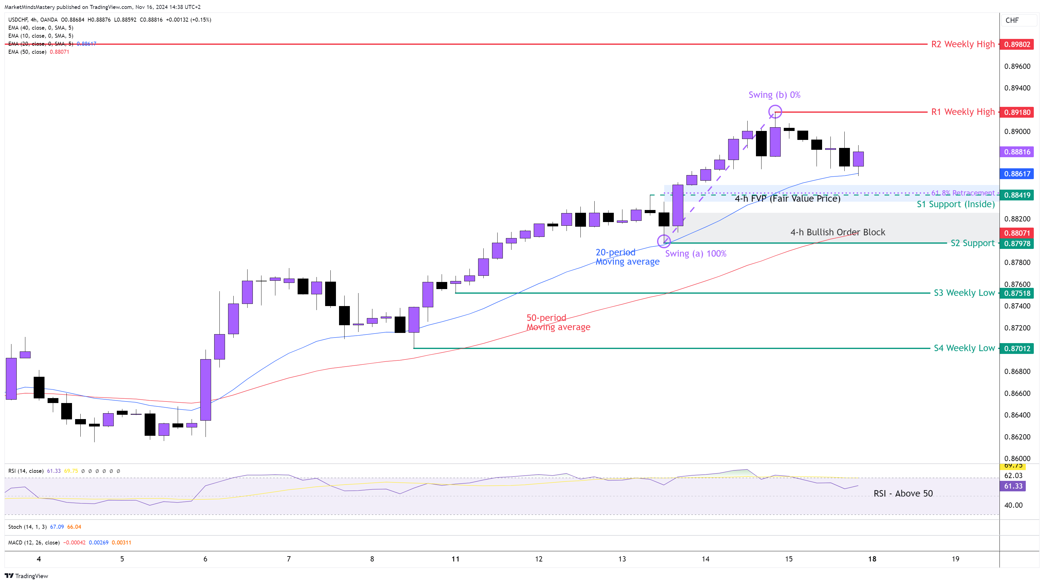 Bir önceki haftanın Yutan Boğa haftalık fiyat hareketi iyi sonuç verdi ve USDCHF döviz çiftinin fiyatını değer olarak yükselterek haftalık grafikte bir Boğa Devam Mum çubuğu formasyonu oluşturdu. 4 saatlik grafikte, fiyat daha yüksek zirveler ve daha yüksek dipler yaparak devam etti. Geçtiğimiz Çarşamba günü, ABD'deki CPI raporunun ardından, fiyat 0,88000 civarında bir Bullish Order Block ve aynı zamanda 0,88400 civarında bir FVP (Fair Value Price) oluşturdu. 20 dönemlik hareketli ortalama 50 dönemlik hareketli ortalamanın üzerinde ve bu yükseliş anlamına geliyor. RSI Osilatörü 50'nin orta çizgisinin üzerinde ve bunun yükseliş etkileri var. Pazartesi gününden itibaren, fiyat yukarı doğru hareket etmeye devam ederse, ilk direnç alanı olan R1, bir önceki haftanın en yüksek seviyesi olan 0,89180'de olacak. Fiyat R1'e nüfuz eder ve artmaya devam ederse, bir sonraki direnç alanı R2, 0.89802 civarında olacaktır.