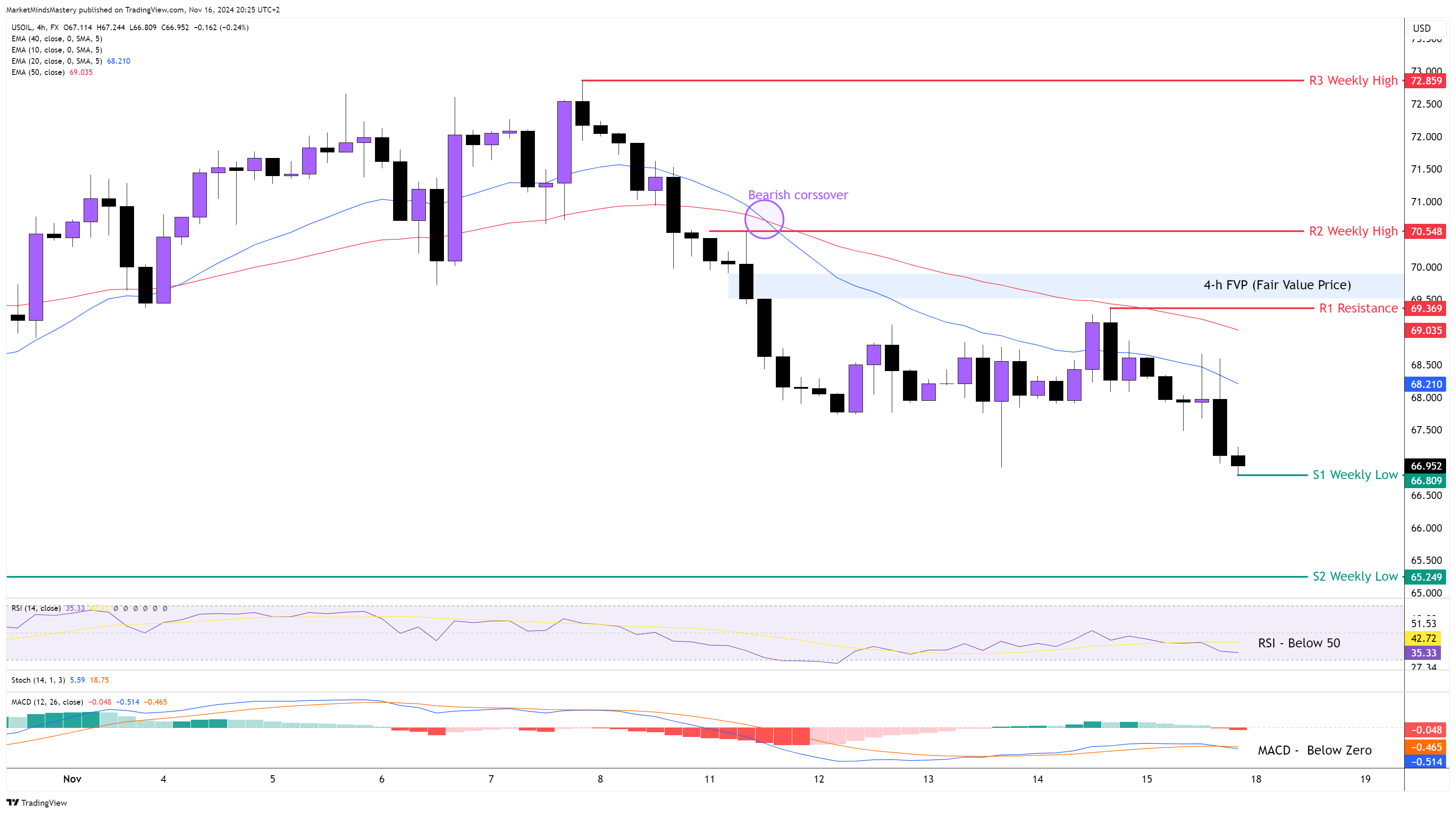 Geçen hafta USOIL piyasasındaki haftalık fiyat hareketinin şekli bir "ders kitabı" örneği olarak tanımlanabilir. Birincil trend bir düşüş trendi ve ters fiyat hareketi bir Ayı Marubozu mumuyla düşüş trendinin devam etmesine yol açtı. 4 saatlik grafikte 20 periyot, Ayı Çaprazlaması olarak bilinen 50 periyotun altından geçti. RSI orta çizgisi olan 50'nin altında ve bu düşüş eğilimi gösteriyor. Benzer şekilde, MACD sıfır çizgisinin altında ve bu da düşüş eğilimi gösteriyor. Şu anda, fiyat 20 dönemlik hareketli ortalamayı reddederek bir düşük yüksek ve düşük düşük formasyonu oluşturdu. Bu nedenle, fiyat aşağı doğru hareket etmeye devam ederse, ilk destek alanı olan S1, bir önceki haftanın en düşük seviyesi olan 66,80 $ civarında olacaktır. Fiyat S1'e nüfuz eder ve aşağı doğru hareket etmeye devam ederse, bir sonraki destek alanı olan S2 yaklaşık 65,24 $ olacaktır. Fiyatın sıçraması ve yukarı doğru hareket etmesi durumunda, ilk direnç alanı olan R1, yaklaşık 69,36 $ olacaktır. Fiyat R1'i aşar ve yukarı doğru hareket etmeye devam ederse, geçen Pazartesi günü 69,60 $ civarında oluşturulan bir FVP (Adil Değer Fiyatı) var ve bu bir direnç alanı olarak hareket edebilir. Fiyat FVP'yi aşar ve artmaya devam ederse, bir sonraki direnç alanı olan R2, önceki haftanın en yüksek seviyesi olan yaklaşık 70,54 $ olacaktır.