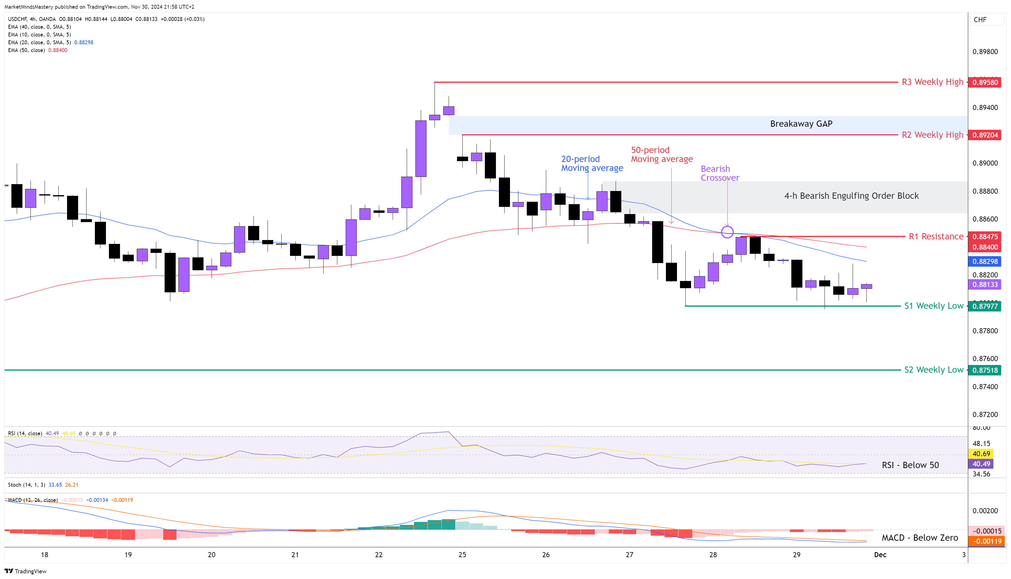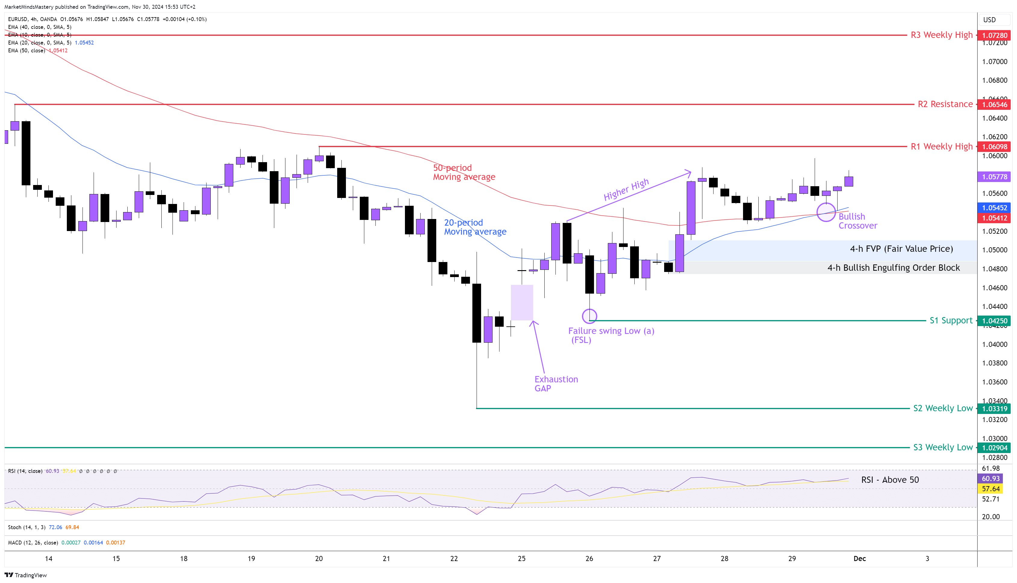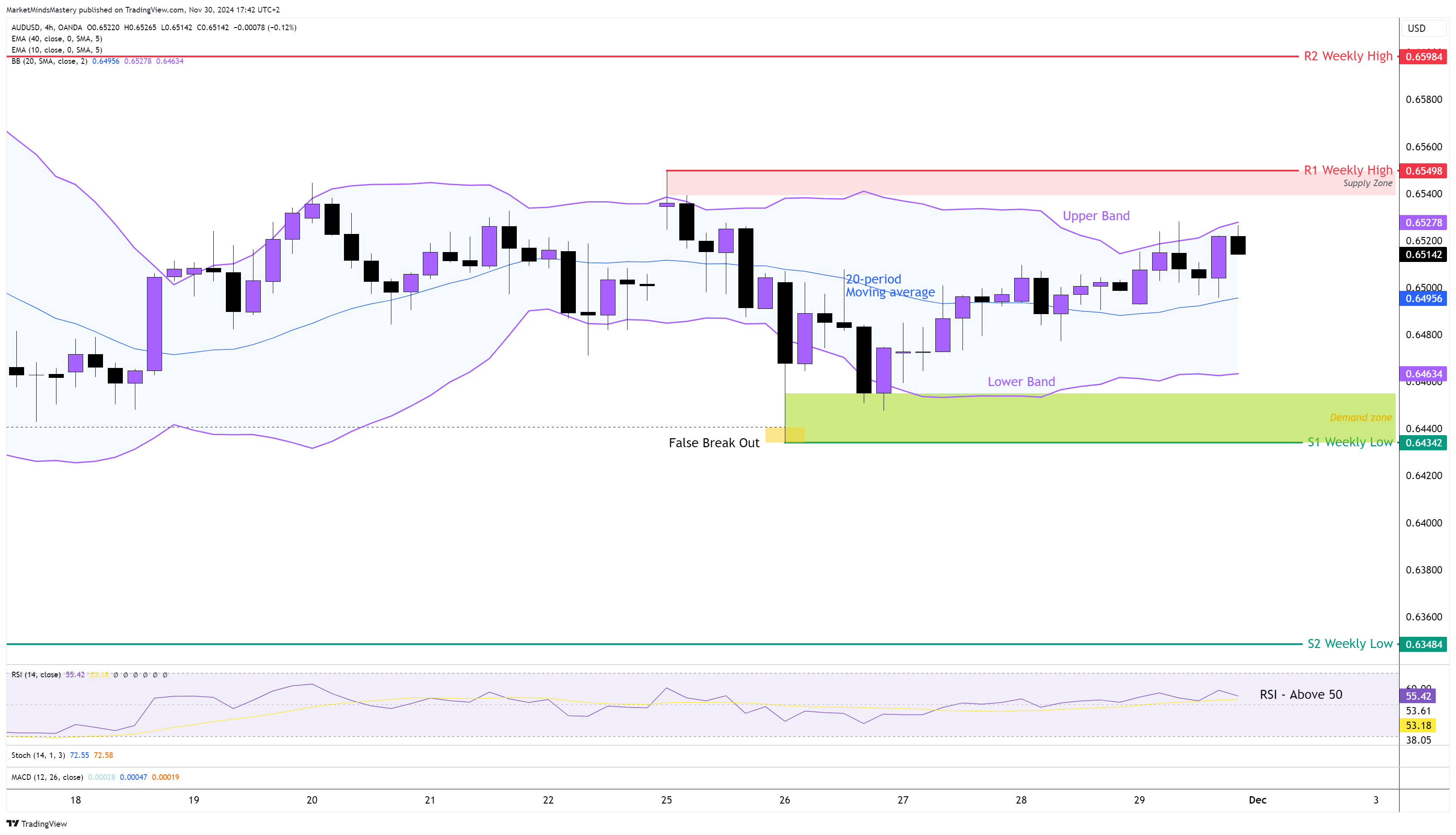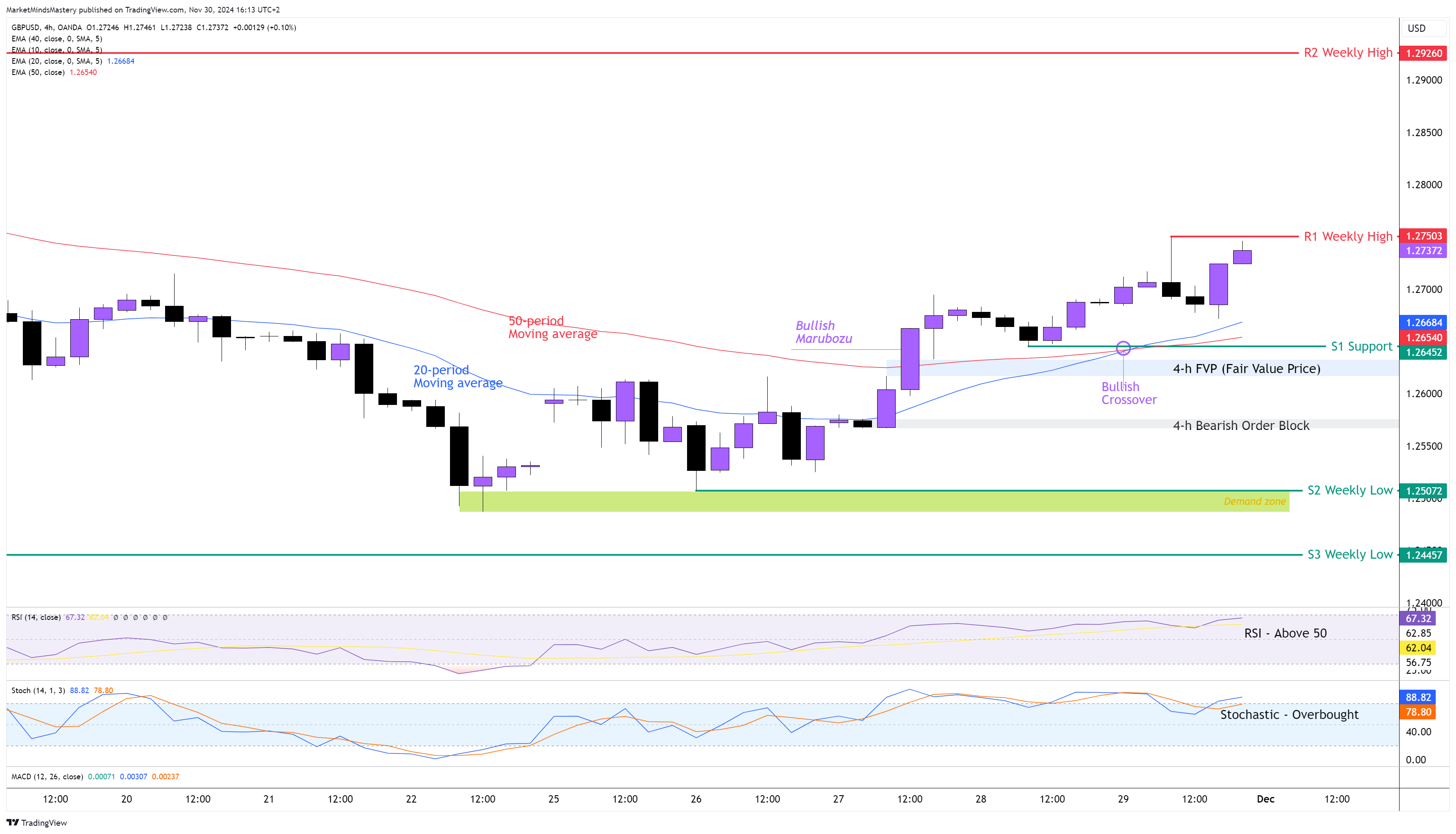 Bir önceki haftanın fiyat hareketi bir başka Boğa mum çubuğunun bir önceki haftanın en yüksek seviyesinin üzerinde kapanmasıyla sona erdi. 4 saatlik grafikte, fiyat ana düşüş trendini devam ettiremedi ve geçtiğimiz Çarşamba günü, New York işlem seansı sırasında basılan bir Bullish Marubozu mumu daha yüksek bir formasyonun yeni bir piyasa yapısını oluşturdu. Fiyat daha sonra 1,25700 civarında bir Bullish Engulfing Order Block ve 1,26200 civarında bir FVP (Fair Value Price) oluşturdu. Geçtiğimiz Cuma günü, 20 periyotluk hareketli ortalama, 50 periyotluk hareketli ortalamanın üzerine çıktı ve Bullish Crossover olarak bilinen bu durum yükseliş etkisi yarattı. RSI Osilatörü orta çizgisi olan 50'nin üzerinde ve bu yükseliş anlamına geliyor. Stochastic Osilatör bir Aşırı Alım Durumunda ve bunun yükseliş etkileri var.