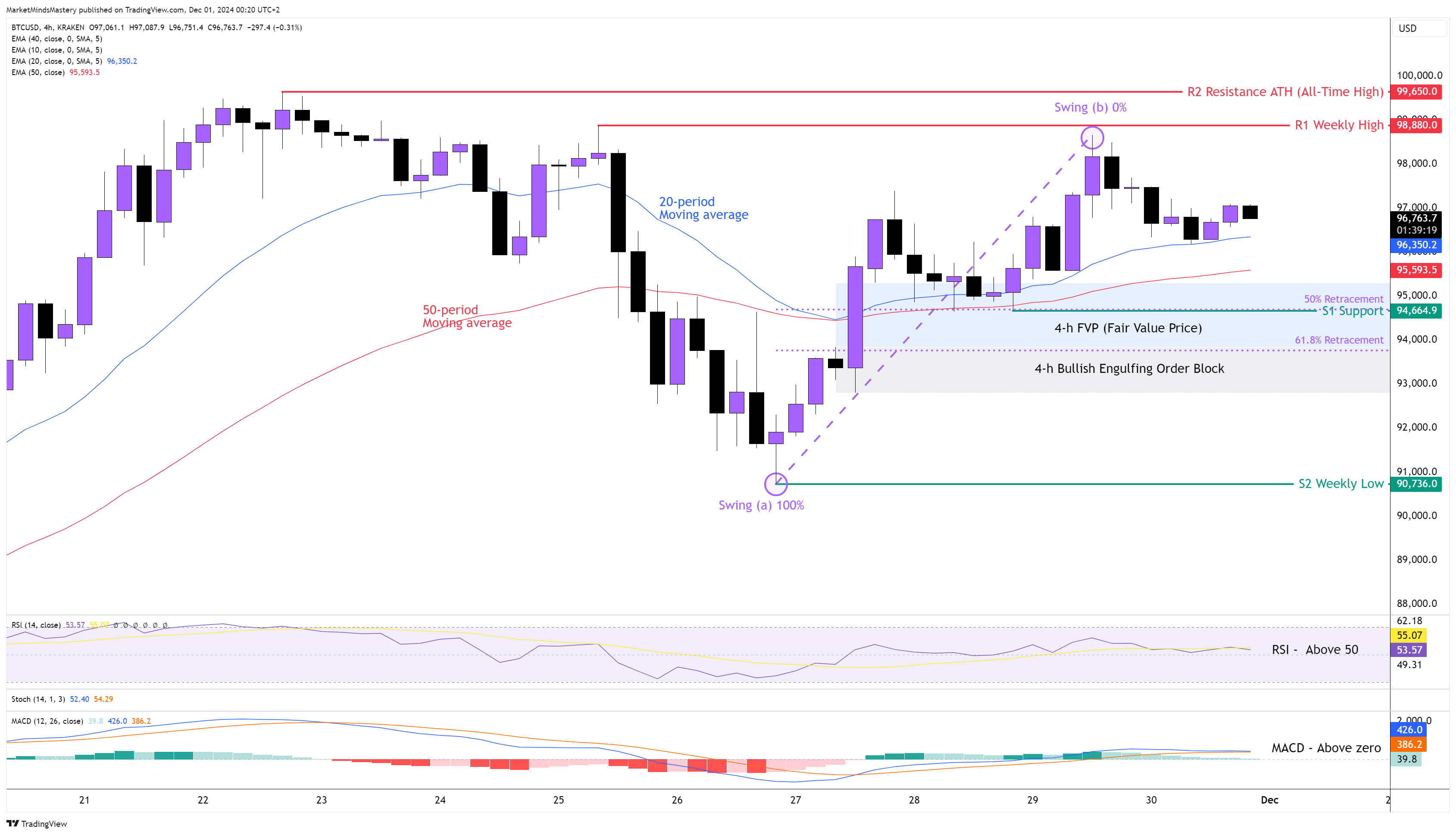 Bir önceki haftaki yükselişin ardından, haftalık grafikteki fiyat bir önceki haftanın mum çubuğunun sınırları (en yüksek ve en düşük) içinde işlem görmeye başladı. Fiyat hareketi bir Asılı Adam formasyonu oluşturuyor ve bu formasyon ilerleyen bir yükseliş trendinin ardından oluştuğunda bir tepe dönüş formasyonu olarak kabul ediliyor. 4 saatlik grafikte, fiyat geçtiğimiz Salı günü geçen hafta grafikte işaretlediğimiz Bullish Order Block alanına girdi. Uzun alt fitilli bir Boğa mumu oluşturdu ve o zamandan beri sıçrayıp yukarı doğru hareket ederek geçen Çarşamba günü 93000$ civarında bir Bullish Engulfing Order Block ve 94000$ civarında bir FVP (Fair Value Price) oluşturdu. 20 periyotluk hareketli ortalama 50 periyotluk hareketli ortalamanın üzerinde ve bu yükseliş anlamına geliyor. RSI, orta çizgisi olan 50'nin üzerinde olduğu için yükseliş eğilimindedir. Hem MACD Hattı (Mavi) hem de Sinyal Hattı (Turuncu) sıfır çizgisinin üzerinde olduğu için MACD de yükselişte. Fiyat yukarı doğru hareket etmeye devam ederse, ilk direnç alanı olan R1, bir önceki haftanın en yüksek seviyesi olan 98889 $ 'da olacak. Fiyat R1'e nüfuz eder ve artmaya devam ederse, bir sonraki direnç alanı R2, 99650 $ 'da ATH (Tüm Zamanların En Yüksek) olacaktır. Fiyat bir geri çekilme aşamasına başlamak için aşağı doğru hareket ederse, ilk destek alanı olan S1 94664 $ 'da olacaktır. Bu, FVP alanından ve % 50 Fibonacci seviyesinden oluştuğu için önemli bir destek seviyesidir. Fiyat S1'i aşar ve düşmeye devam ederse, bir sonraki destek alanı olan S2, önceki haftanın en düşük seviyesi olan 90736 $ seviyesinde olacak.