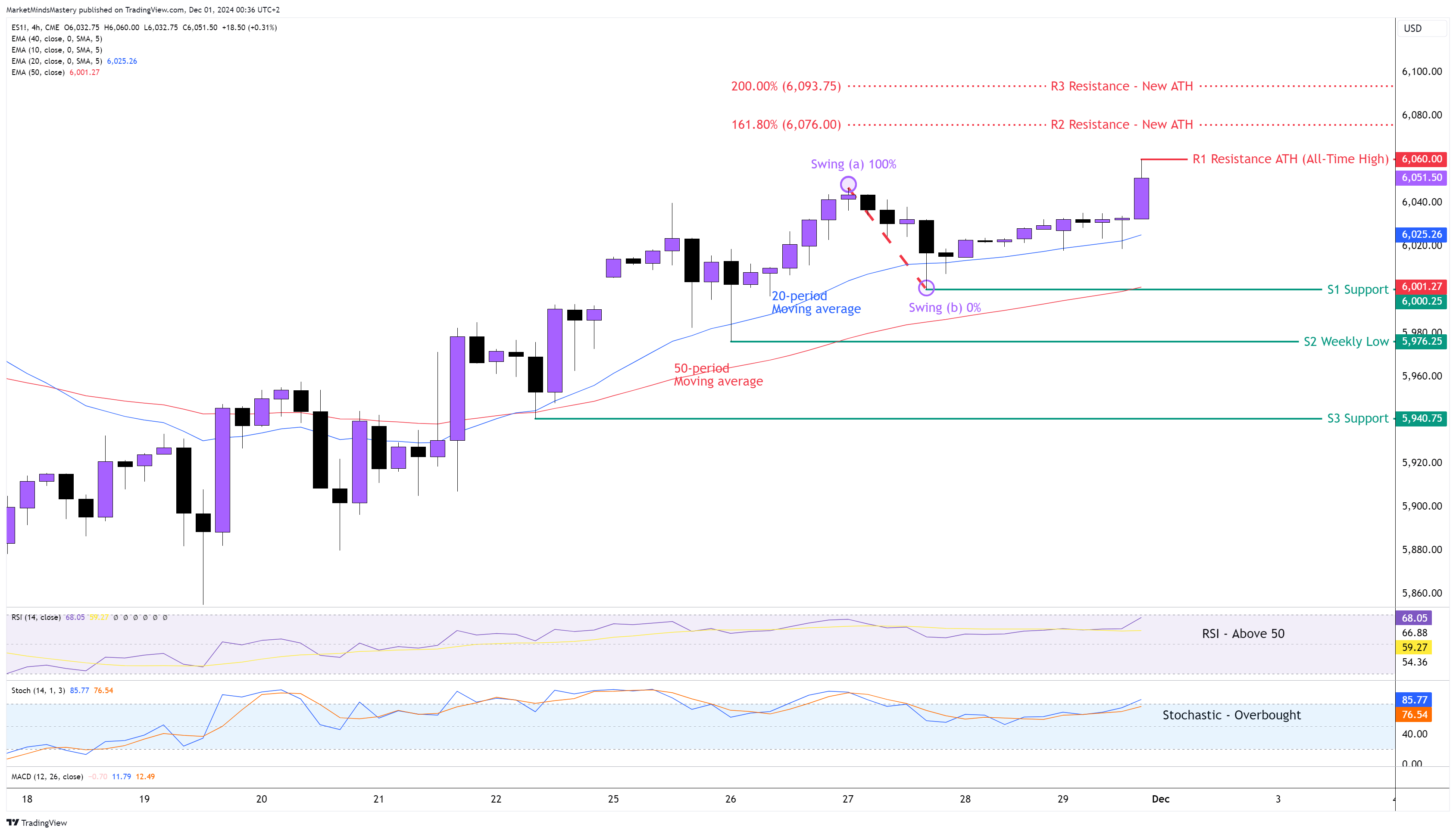 Geçtiğimiz hafta SP 500'ün fiyatı artmaya devam etti. Haftalık grafik, 6060$'da yeni bir ATH (Tüm Zamanların En Yüksek) değeri yaratan bir Bullish candle ile sona erdi. 4 saatlik grafikte, fiyat bir dizi daha yüksek yüksekler ve daha yüksek düşükler şeklinde birincil trendi takip ediyordu. RSI Osilatörü 50'nin üzerinde, bu da yükselişe işaret ediyor. Stochastic Osilatör aşırı alım durumunda ve bu da yükselişe işaret ediyor.