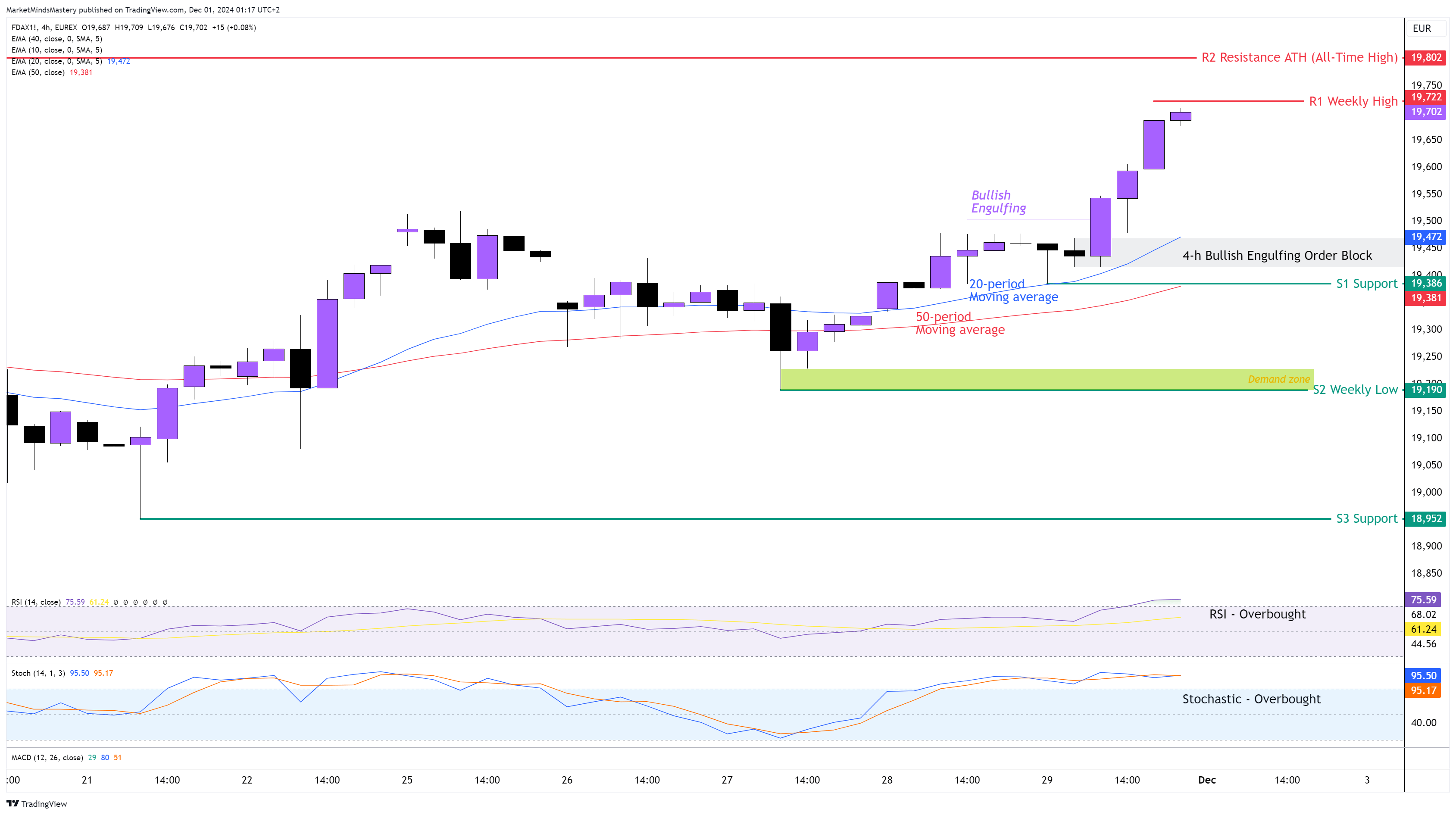 Bir önceki haftanın Piyasa Görünümünde açıkladığımız gibi, bir önceki haftaki yana doğru hareketin ardından, GER 30 Future fiyatı ana Yükseliş trendine devam etti. Haftalık grafik, genellikle boğasal etkilere sahip olan bir Çekiç mum çubuğu ile sona erdi. 4 saatlik grafikte, fiyat bir yüksek tepe ve yüksek düşük oluşumu yaptı. 20 dönem, 50 dönem hareketli ortalamanın üzerinde ve bu yükseliş anlamına geliyor. RSI bir Aşırı Alım durumunda ve bunun yükseliş etkileri var. Stochastic Osilatör de Aşırı Alım durumunda ve bu da yükselişe işaret ediyor. Pazartesi gününden itibaren, fiyat yukarı doğru hareket etmeye devam ederse, ilk direnç alanı olan R1, bir önceki haftanın en yüksek seviyesi olan 19722'de olacak. Fiyat R1'e nüfuz eder ve artmaya devam ederse, bir sonraki direnç alanı R2, 19802'de ATH (Tüm Zamanların En Yüksek) olacaktır.