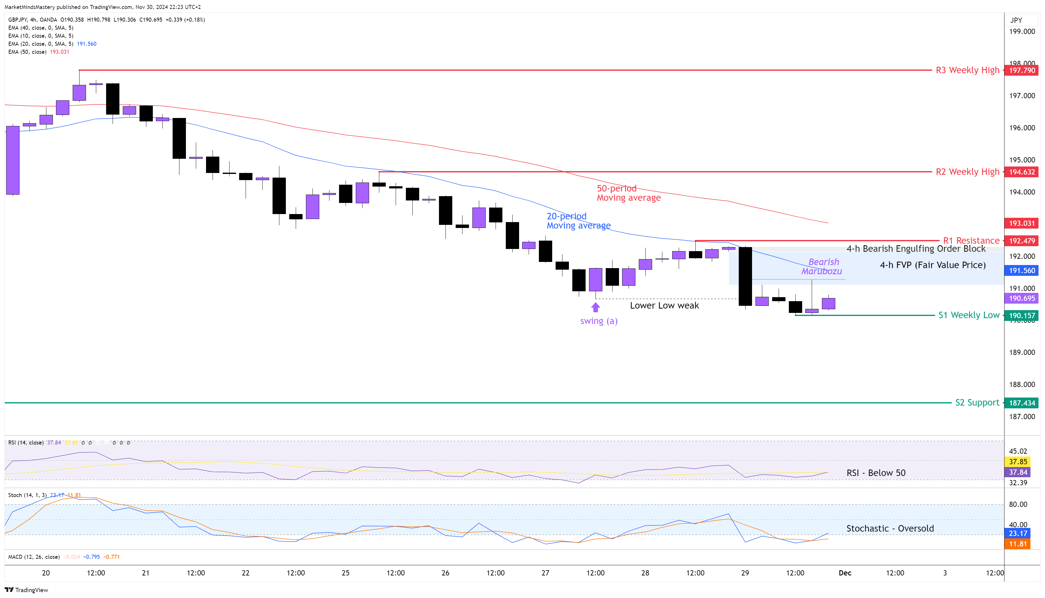 Güçlü Sterlin'e rağmen Japon Yeni üst üste bir hafta daha en güçlü para birimi oldu. Bu durum, Japonya'nın para biriminin küresel ekonomik ve siyasi olaylar sırasında Güvenli Cennet varlığı olarak görülmesiyle de ilgilidir. Haftalık grafik, 40 periyotluk hareketli ortalamanın (grafikte gösterilmemiştir) altında kapanarak Ayı Devamı ile sona erdi. 4 saatlik grafikte, 20 periyot hareketli ortalama 50 periyotun altında ve bu düşüş eğilimi gösteriyor. Fiyat düşük yüksek ve düşük düşük oluşumlar yapmaya devam etti, ancak geçen Cuma, Ayı Marubozu mumu takip etmedi ve fiyat, grafikte gösterildiği gibi (a,) noktasında delinmiş salınım etrafında işlem görmeye devam etti. RSI 50'nin altında ve bu da aşağı yönlü etkilere sahip. Stochastic Osilatör, düşüşe işaret eden bir Aşırı Satım durumunda. Fiyat aşağı yönlü hareket etmeye devam ederse, ilk destek alanı olan S1, bir önceki haftanın en düşük seviyesi olan 190.157'de olacak. Fiyat S1'e nüfuz eder ve düşmeye devam ederse, bir sonraki destek alanı olan S2 187.434'te olacaktır. Fiyatın sıçraması ve yukarı doğru hareket etmesi durumunda, ilk direnç alanı olan R1, 192.479 civarında olacaktır. Bu, Bearish Engulfing Order Block ve geçen Cuma günü oluşturulan FVP (Fair Value Price) ile 20 dönemlik hareketli ortalamadan oluştuğu için önemli bir direnç seviyesidir. Fiyat R1'i aşar ve artmaya devam ederse, bir sonraki ikamet alanı olan R2, önceki haftanın en yüksek seviyesi olan 194.632 civarında olacak.
