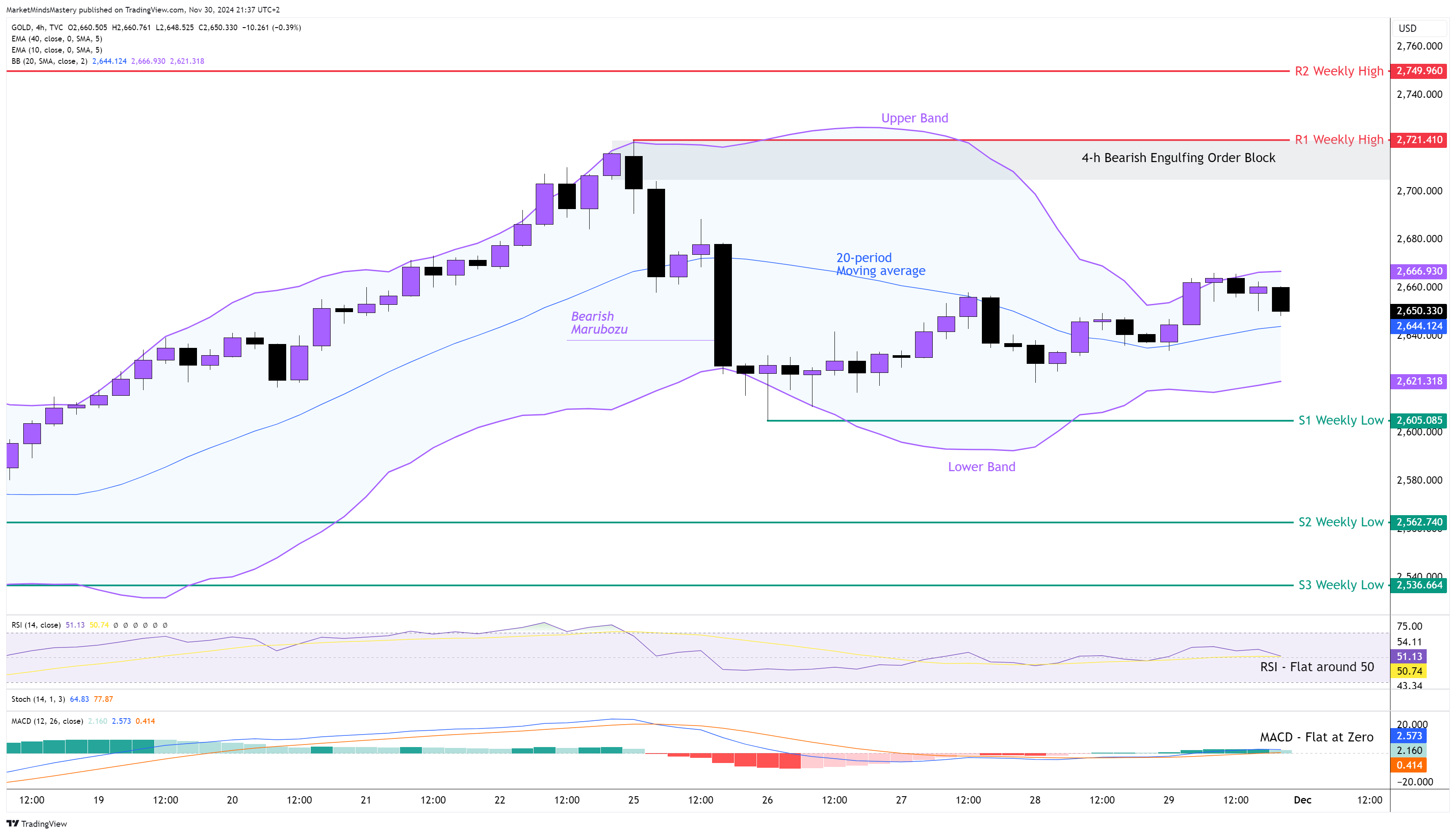 Bir önceki haftanın piyasa analizini takiben, haftalık mum çubuğu bir Asılı Adam formasyonu olarak sona erdi, ki bu formasyon genellikle aşağı yönlü etkilere sahiptir. 4 saatlik grafikte ALTIN fiyatı geriledi ve bir Ayı Marubozu fiyatı geçen hafta işaret ettiğimiz Boğa Emir Bloğunu test etmeye zorladı. O zamandan beri fiyat, tanımlanmış bir yön olmadan dar bir fiyat aralığında hareket etti. Üst ve Alt Bandın birbirine paralel işaret ettiğini görüyoruz, bu da fiyatın yana doğru hareket ettiği anlamına geliyor. MACD sıfır çizgisi etrafında düz ve RSI i 50 orta çizgisinin biraz üzerinde. Şu anda fiyat, aynı zamanda Bollinger Band göstergesinin ortası olan 20 dönemlik hareketli ortalamanın üzerinde. Pazartesi gününden itibaren, fiyat yukarı doğru hareket ederse, ilk direnç alanı olan R1, bir önceki haftanın en yüksek seviyesi olan 2721 $ 'da olacak. Bu, geçtiğimiz Pazartesi günü oluşan Ayı Yutan Emir Bloğu ile bir arada bulunduğu için önemli bir direnç seviyesi olarak kabul ediliyor. Fiyat R1'e nüfuz eder ve artmaya devam ederse, bir sonraki direnç alanı olan R2, 2749 $ civarında olacaktır.