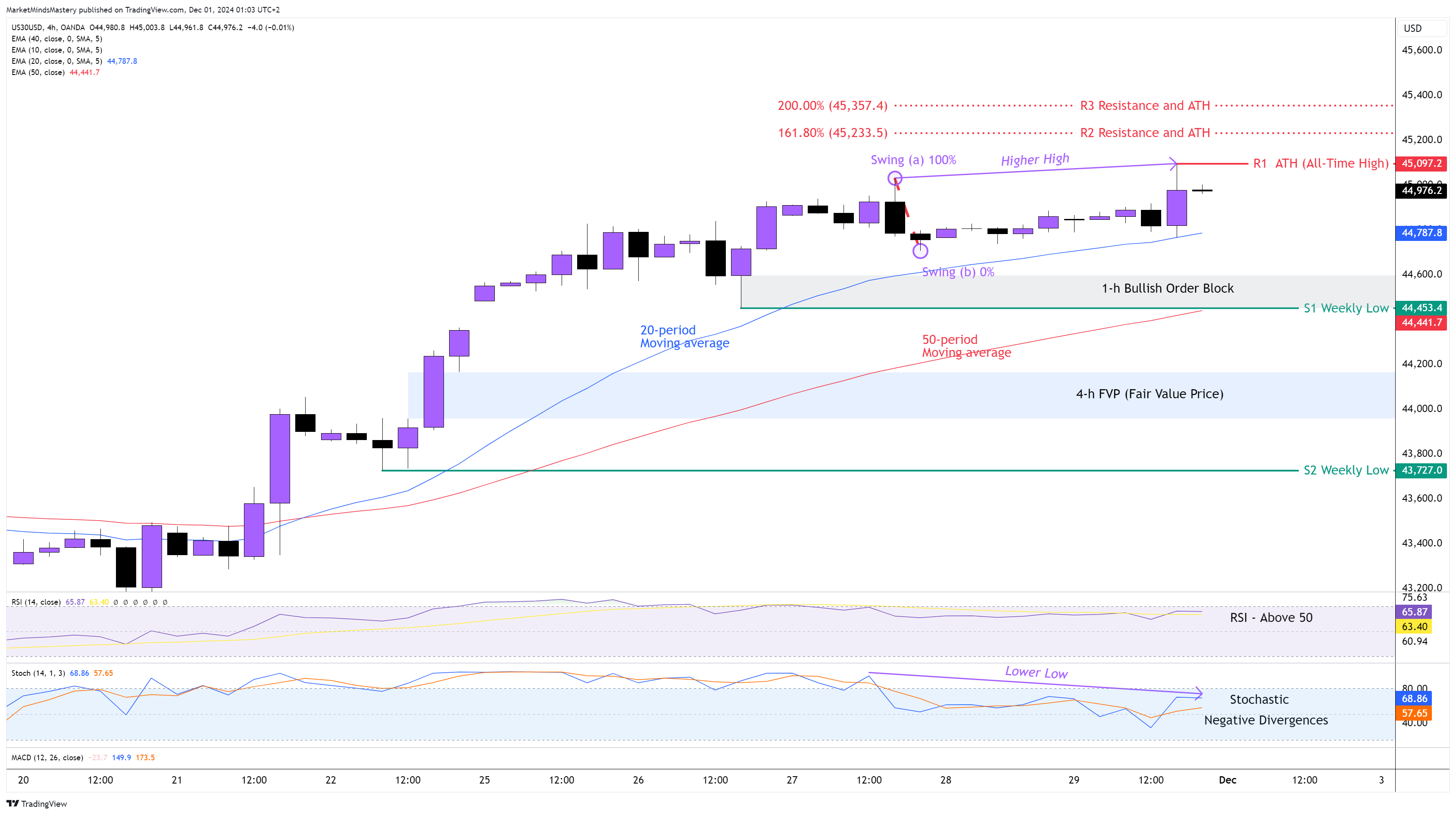 Fiyat yukarı doğru hareket etmeye devam ederse, ilk direnç alanı olan R1, ATH (Tüm Zamanların En Yüksek Seviyesi) olan 45097 $ 'da olacaktır. Fiyat R1'e nüfuz eder ve artmaya devam ederse, bir sonraki direnç alanı R2, (a) noktasından (b) noktasına kadar olan salınımı ölçen% 161,8 Fibonacci seviyesi olan 45233 $ olacaktır. Fiyat R2'ye nüfuz eder ve yukarı doğru hareket etmeye devam ederse, bir sonraki direnç alanı olan R3, yine (a) noktasındaki salınımdan (b) noktasındaki salınıma kadar % 200 Fibonacci Uzantısı olan 454357 $ olacaktır. Fiyatın bir geri çekilme aşamasına başlamak için aşağı doğru hareket etmesi durumunda, ilk destek alanı olan S1, 44453 $ 'da olacaktır. Bu, 1 saatlik Boğa Emir Bloğu ve 50 dönemlik hareketli ortalamadan oluştuğu için önemli bir destek seviyesidir. Fiyat S1'e nüfuz eder ve düşmeye devam ederse, bir sonraki destek alanı olan S2, daha eski bir haftalık seviye olan 43727 $ 'da olacaktır.