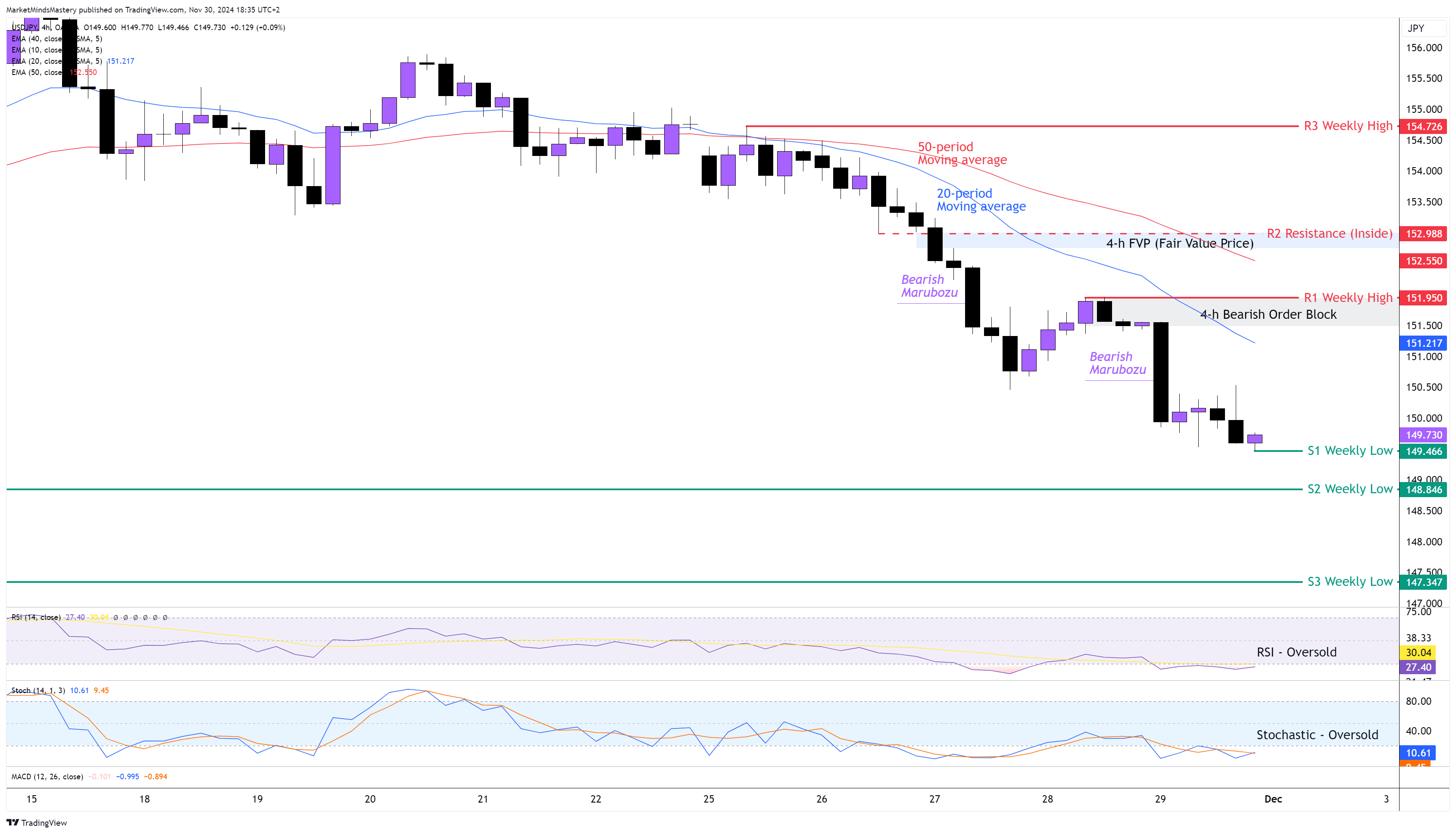 Japon Yeni bir hafta daha döviz piyasasında güçlü bir para birimi oldu. USDJPY'nin fiyatı 5000 puan (500 pip) düştü ve haftalık mum çubuğu bir Ayı Marubozu formasyonu oluşturdu ve kapanış fiyatı 40 dönemlik haftalık hareketli ortalamanın altında kaldı (bu grafikte gösterilmemiştir). 4 saatlik grafikte, fiyat düşük tepe ve düşük dip formasyonları oluşturmaya devam etti. Geçtiğimiz Çarşamba günü, fiyat 153.000 civarında bir FVP (Adil Değer Fiyatı) oluşturdu. Fiyat o zamandan beri düşmeye devam etti ve gözle görülür bir Ayı Marubozu mumu aşağı yönlü hareketi güçlendirdi. Perşembe günü, fiyat 152.000 civarında bir Ayı Emir Bloğu oluşturdu. 20 dönemlik hareketli ortalama, 50 dönemlik ortalamanın altında ve bunun düşüş yönünde etkileri var. RSI ve Stochastic Osilatör her ikisi de düşüşe işaret eden bir Aşırı Satım durumundadır. Bu nedenle, fiyat aşağı doğru hareket etmeye devam ederse, ilk destek alanı olan S1, bir önceki haftanın en düşük seviyesi olan 149.466'da olacaktır. Fiyat S1'e nüfuz eder ve düşmeye devam ederse, bir sonraki destek alanı olan S2 148.846 civarında olacaktır. Aşağı yönde bir hareket daha S3 destek alanını 147.347 civarında bulacaktır.