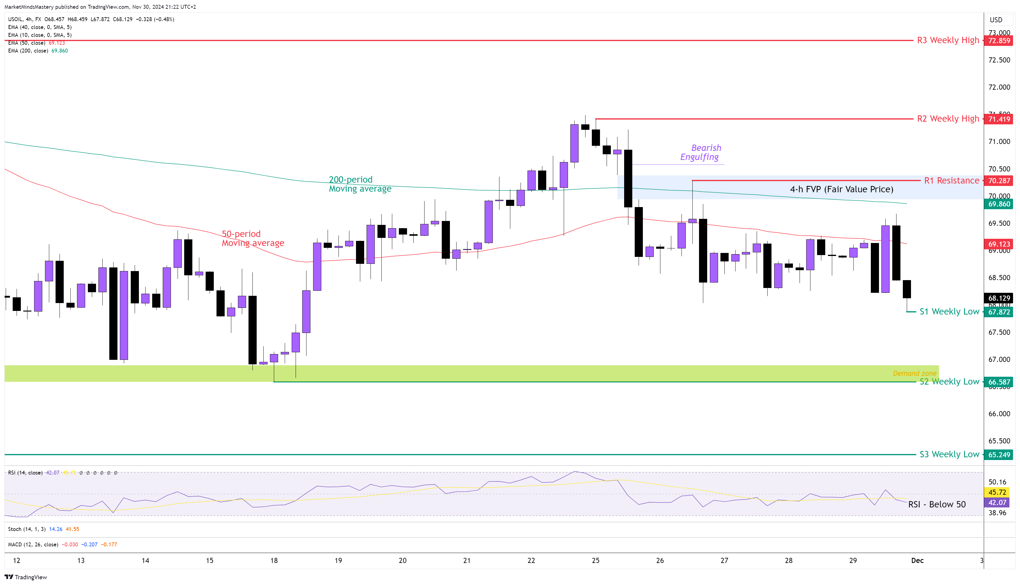Öte yandan, fiyat sıçrar ve yukarı doğru hareket ederse, ilk direnç alanı olan R1 70,28 $ seviyesinde olacak. Fiyat R1'e nüfuz eder ve artmaya devam ederse, bir sonraki direnç alanı R2, önceki haftanın en yüksek seviyesi olan 71.41 $ civarında olacak.