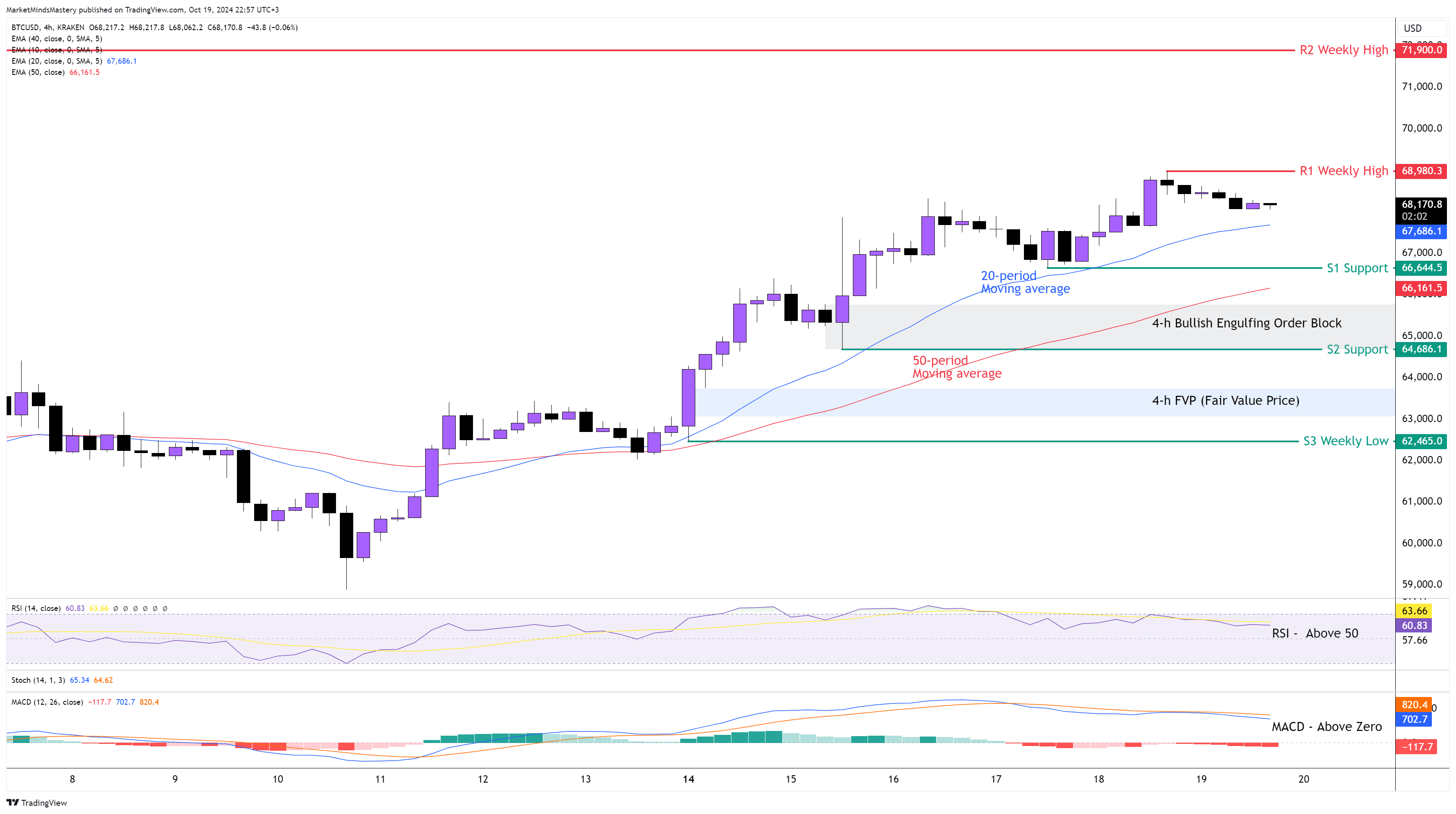 Opsiyonel olarak, fiyat reddedilir ve aşağı doğru hareket ederse, ilk destek alanı olan S1, 66644 $ civarında olacaktır. Bu seviye 20 dönemlik hareketli ortalama ile bir arada bulunur. Fiyat S1'e nüfuz eder ve aşağı doğru hareket etmeye devam ederse, bir sonraki destek alanı olan S2, 64684 $ civarında olacaktır. Bu, geçen Salı günü oluşturulan 4 saatlik Yutan Boğa Emir Bloğu ve her ikisi de fiyat için ek bir destekleyici faktör olarak hareket edebilecek 50 dönemlik hareketli ortalama ile bir arada bulunduğu için önemli bir destek seviyesi olarak kabul edilir. Fiyatın S2'ye girmesi ve düşmeye devam etmesi durumunda, bir sonraki destek alanı olan S3, önceki haftanın en düşük seviyesi olan 62465 $ civarında olacaktır.