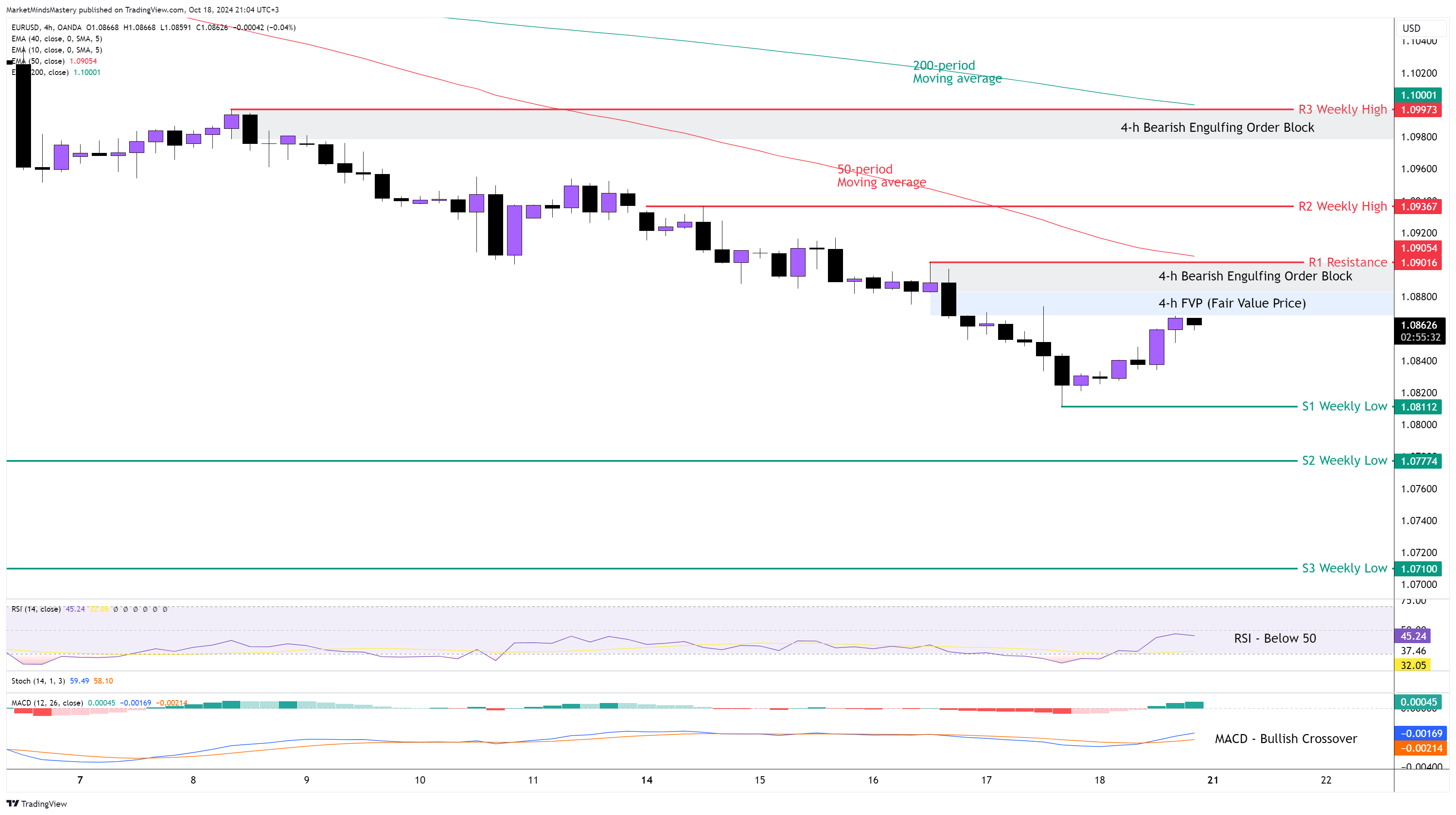 Bir önceki haftanın analizini takiben, EURUSD fiyatı aşağı yönlü hareket etmeye devam etti ve ECB faiz oranlarını üst üste ikinci ay düşürürken 40 dönemlik haftalık hareketli ortalamayı deldi. Haftalık grafik bir Ayı devam mum çubuğu olarak sona erdi. 4 saatlik grafikte, fiyat daha düşük en yüksek ve en düşük seviyeleri görmeye devam etti ve geçtiğimiz Çarşamba günü 1,0890 civarında bir Ayı Yutan Emir Bloğu oluşturdu. Fiyat, düşüşü geçici olarak durduran 1,0870 civarında 4 saatlik FVP (Adil Değer Fiyatı) alanına ulaştı.