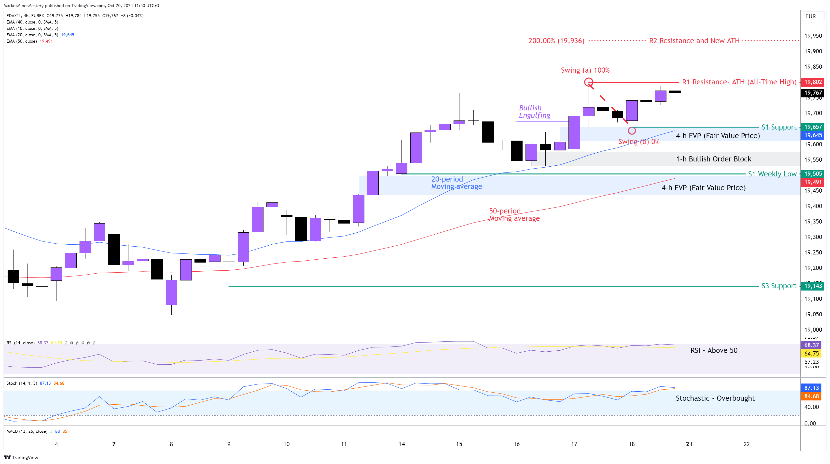 Geçen hafta haftalık grafikte oluşan Bullish Marubozu mum çubuğu Avrupa Göstergesinin gücünü ortaya koydu. Birkaç haftalık konsolidasyonun ardından fiyat yükselişe geçti ve geçen hafta 19802 seviyesinde yeni bir ATH kaydetti. 4 saatlik grafikte, fiyat bir dizi yüksek tepe ve yüksek dip ile yukarı doğru hareket etti. 20 dönemlik hareketli ortalama 50 dönemlik hareketli ortalamanın üzerinde ve bunun yükseliş etkileri var. RSI orta çizgisi olan 50'nin üzerinde ve bu yükselişe işaret ediyor. Stochastic Osilatör Aşırı Alım durumunda ve bu da yükselişe işaret ediyor. Geçtiğimiz Perşembe günü fiyat 19600 civarında bir FVP (Fair Value Price) ve geçtiğimiz Çarşamba günü 19550 civarında bir Bullish Order Block oluşturdu. Pazartesi gününden itibaren, fiyat yukarı doğru hareket etmeye devam ederse, ilk direnç alanı olan R1, 19802'deki ATH olacaktır. Fiyat R1'e nüfuz eder ve yukarı doğru hareket etmeye devam ederse, bir sonraki direnç alanı olan R2, grafikte gösterildiği gibi (a) noktasından (b) noktasındaki salınıma kadar olan salınımı ölçen % 200 Fibonacci Uzantısı olan 19936 olacaktır.