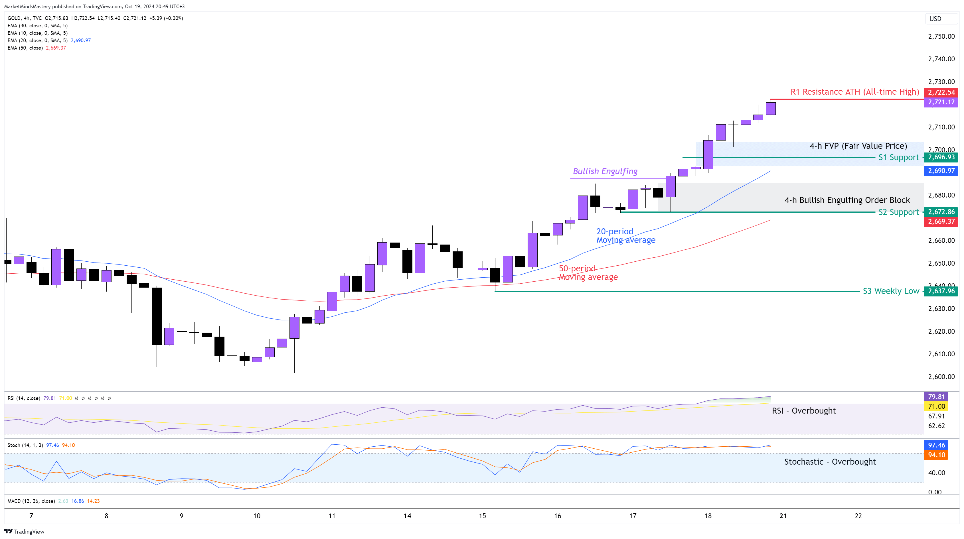 Geçen hafta ALTIN'ın neden güçlü bir Yükseliş Momentumu içinde olduğunu açıklamıştık. Haftalık grafik sadece yükseliş trendinde değil, aynı zamanda fiyat hareketi de yükseliş momentumuna işaret ediyor. Nitekim, geçen hafta fiyat 2721$ civarında yeni bir ATH (All-Time High) oluşturdu ve haftalık mum çubuğunun kapanış fiyatı en yüksek noktasına yakın. 4 saatlik grafikte ise 20 periyotluk hareketli ortalama 50 periyotluk hareketli ortalamanın üzerinde ve bu yükseliş anlamına geliyor. Önceki haftanın mumlarının çoğu yükseliş mumlarıydı ve meydana gelen geri çekilme sığdı ve çok kısa süreliydi. RSI i, yükselişe işaret eden bir Aşırı Alım durumunda. Geçen Salı gününden bu yana, Stochastic Osilatör 80 olan üst sınırının üzerine çıktı ve fiyat agresif bir şekilde yükselirken Aşırı Alım oldu. Fiyat yukarı yönlü hareketine devam ederse ve yukarı yönlü hareket etmeye devam ederse, ilk direnç alanı olan R1, 2722 $ 'daki ATH olacaktır. Fiyatın R1'i geçtiğini ve yukarı doğru hareket etmeye devam ettiğini varsayalım. Bu durumda, Fibonacci Uzantısını kullanarak bir sonraki direnç alanını tahmin edemeyiz, çünkü bu amaç için bir fiyat geri çekilmesinden oluşturulan fiyat tablosunda herhangi bir dalgalanma yoktur.