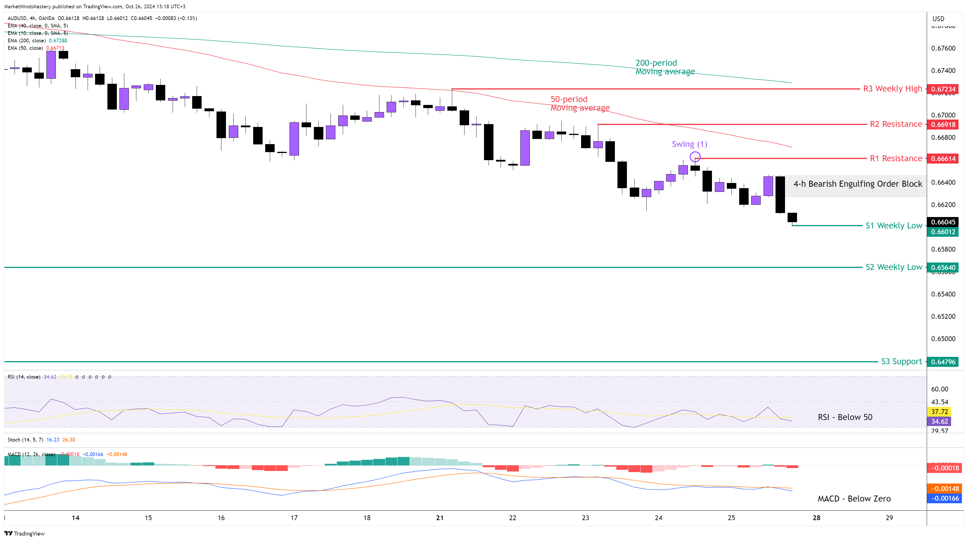 Avustralya dolarının zayıflığı geçen hafta belirgindi ve haftalık grafikteki fiyat, mum kapanış fiyatının düşük seviyesine yakın olduğu bir Uzun Ayı mumuyla sona erdi. 4 saatlik grafikte, fiyat New York işlem seansının sonuna kadar düşmeye devam etti ve fiyat 0,66400 civarında bir Ayı Yutan Emir Bloğu oluşturdu. 50 dönemlik hareketli ortalama 200 dönemlik hareketli ortalamanın altında ve bu düşüş eğilimi gösteriyor. RSI Osilatörü 50'nin altında ve bu düşüş eğilimi gösteriyor. MACD sıfır çizgisinin altında ve bunun düşüş yönünde etkileri var.