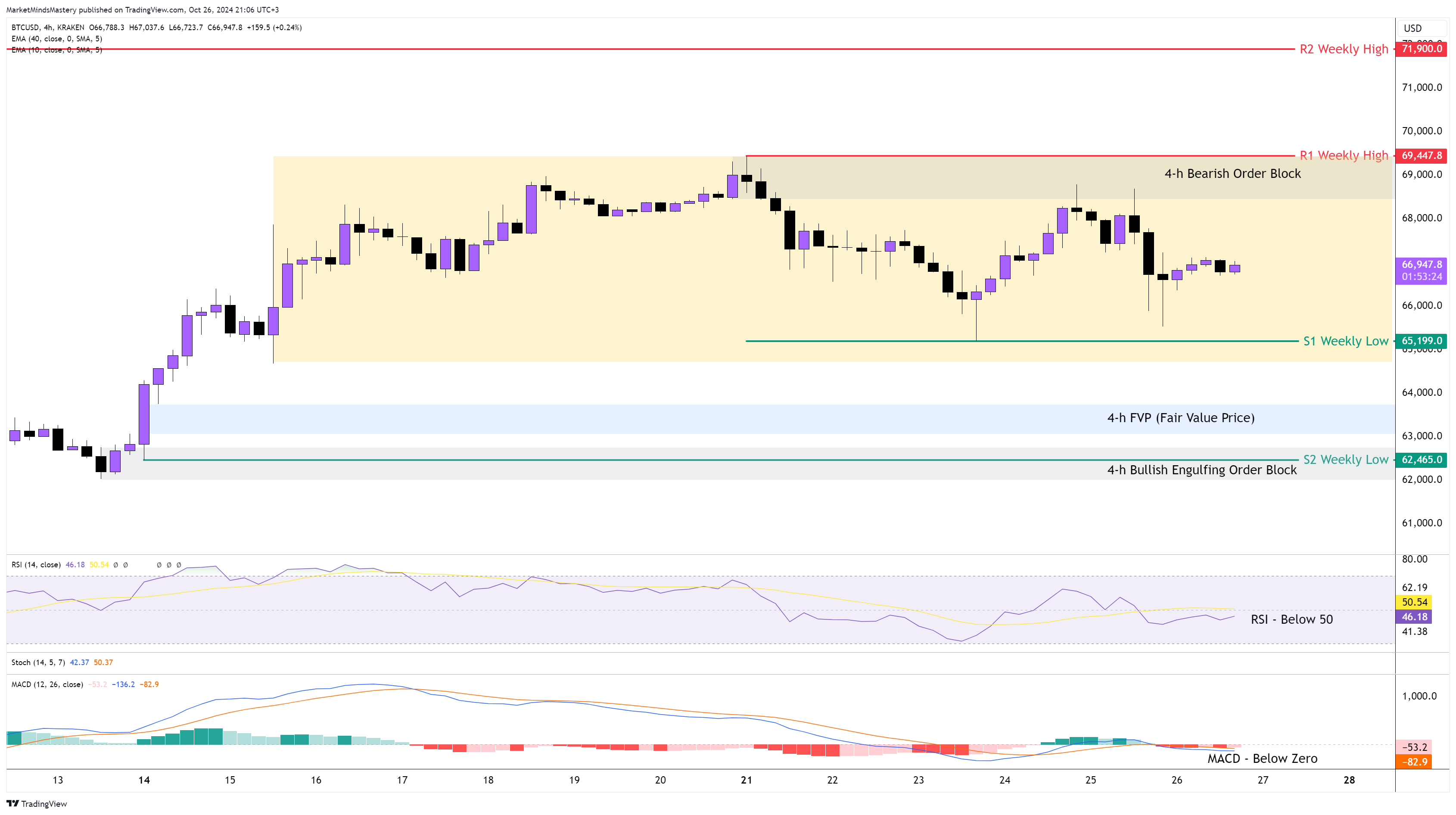 4 saatlik grafikte, fiyat geçen hafta bir Aralık içinde işlem gördü, çünkü daha yüksek veya daha düşük bir fiyat oluşmadı. Geçtiğimiz Pazartesi günü 69000$ civarında bir 4 saatlik Ayı Emir Bloğu oluştu. 63000$ civarında birkaç hafta önce oluşan FVP (Fair Value Price) ve 62000$ civarında oluşan Bullish Engulfing Emir Bloğu hiçbiri henüz test edilmediği için hala geçerli. RSI Osilatörü 50 olan orta çizgisinin altında, bu da düşüş anlamına geliyor.
