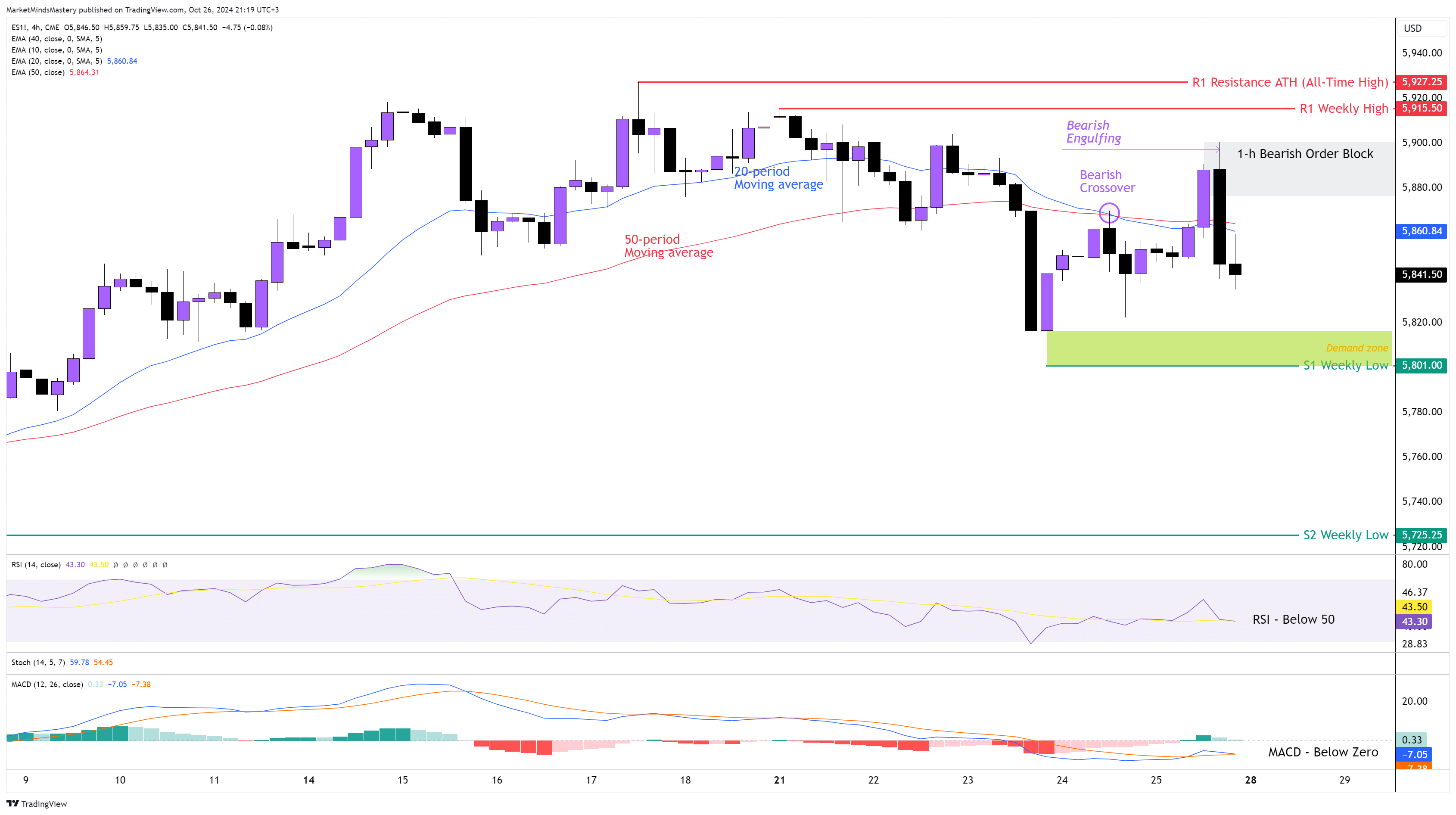 ES'nin fiyatı haftalık grafikte bir salıncak-yüksek formasyonu oluşturdu. Geçen hafta, fiyat yeni bir ATH yapmadı. Bunun yerine, yeni bir düşük düşük oluşturdu. 4 saatlik grafikte, fiyat bir dizi düşük yüksek ve düşük düşük oluşturdu ve bu da bir düşüş trendine işaret etti. Geçtiğimiz Cuma günü, Uzun Ayı Yutan mum çubuğu 5900$ civarında bir Ayı Emir Bloğu oluşturdu.