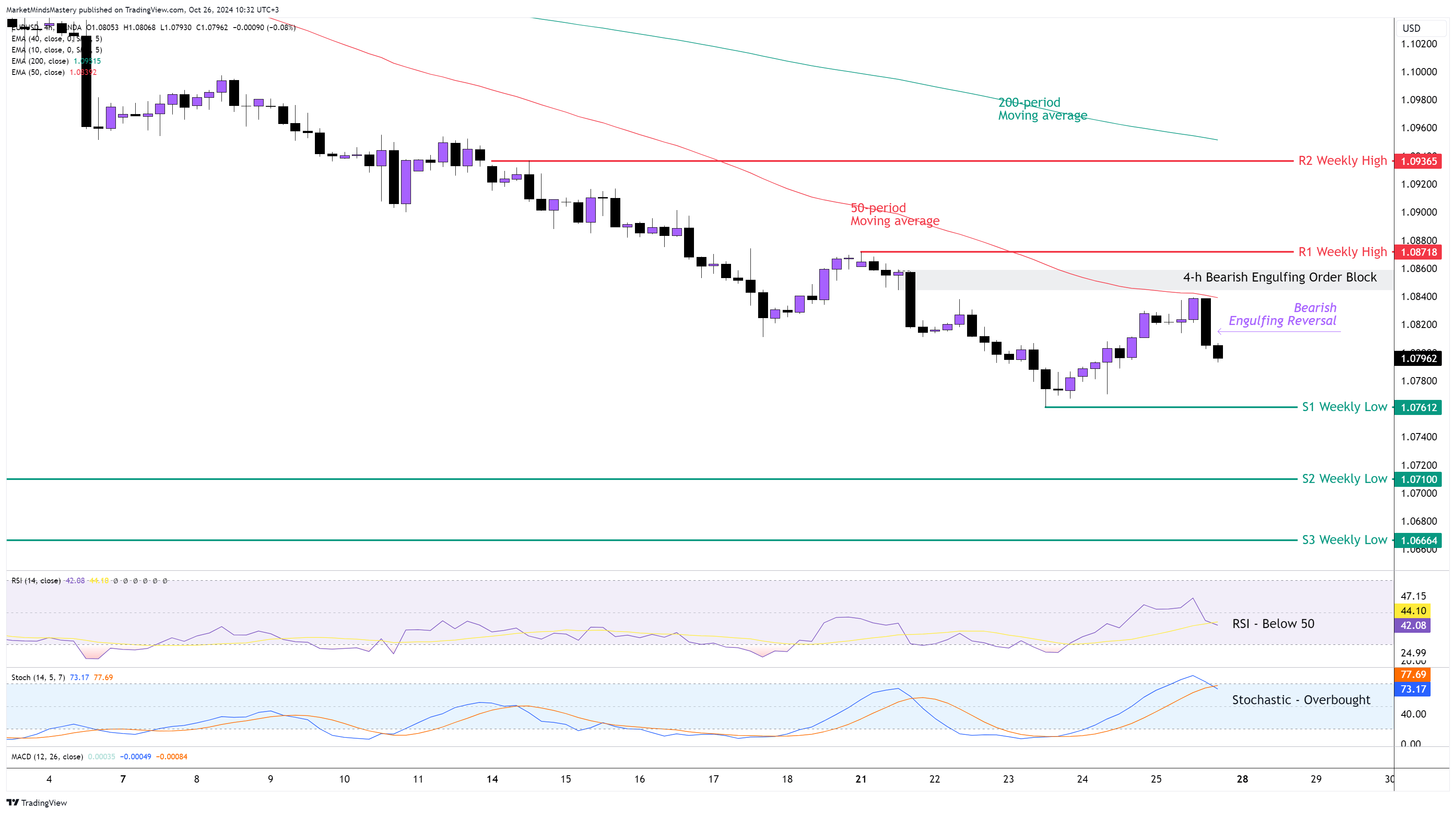 Geçen hafta EURUSD fiyatı düşmeye devam etti ve haftalık grafikte Ayı Devamı mumu olarak sona erdi. 4 saatlik grafikte, 50 dönemlik hareketli ortalama, düşüş eğilimi gösteren 200 dönemlik ortalamanın altında seyrediyor. RSI orta seviyesi olan 50'nin altında ve düşüş eğilimine işaret ediyor. Stochastic Osilatör, geçen Cuma günü meydana gelen Ayı Çaprazlaması ile Aşırı Alım durumunda ve düşüş trendinin devam edeceğine işaret ediyor. Geçtiğimiz Cuma günü, 50 dönemlik hareketli ortalama etrafında bir Ayı Yutulması meydana geldi. Dolayısıyla, fiyat aşağı yönlü hareket etmeye devam ederse, ilk destek alanı olan S1, bir önceki haftanın en düşük seviyesi olan 1,07612 civarında olacaktır. Fiyat S1'e nüfuz eder ve daha düşük hareket etmeye devam ederse, bir sonraki destek alanı olan S2, 1.07100'de daha eski bir haftalık seviye olacaktır.