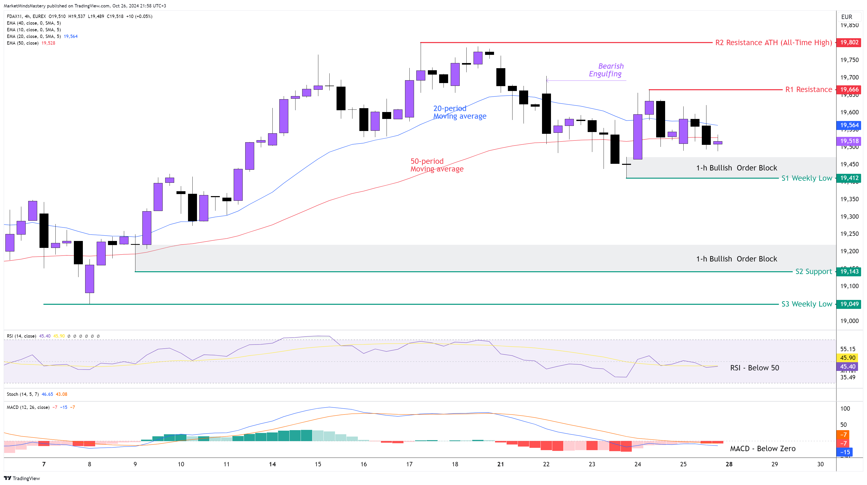 Ek olarak, MACD'nin Histogramı sıfır çizgisinin altında olduğu için düşüş eğiliminde. Pazartesi gününden itibaren, fiyat aşağı doğru hareket ederse, ilk destek alanı olan S1, bir önceki haftanın en düşük seviyesi olan 19412'de olacak. Bu seviyede, geçtiğimiz Perşembe günü bir 1-h Ayı Emir Bloğu oluşturuldu ve henüz test edilmedi. Fiyatın S1 desteğine girmesi ve aşağı doğru hareket etmeye devam etmesi durumunda, bir sonraki destek alanı olan S2, 19143 seviyesi civarında olacaktır.