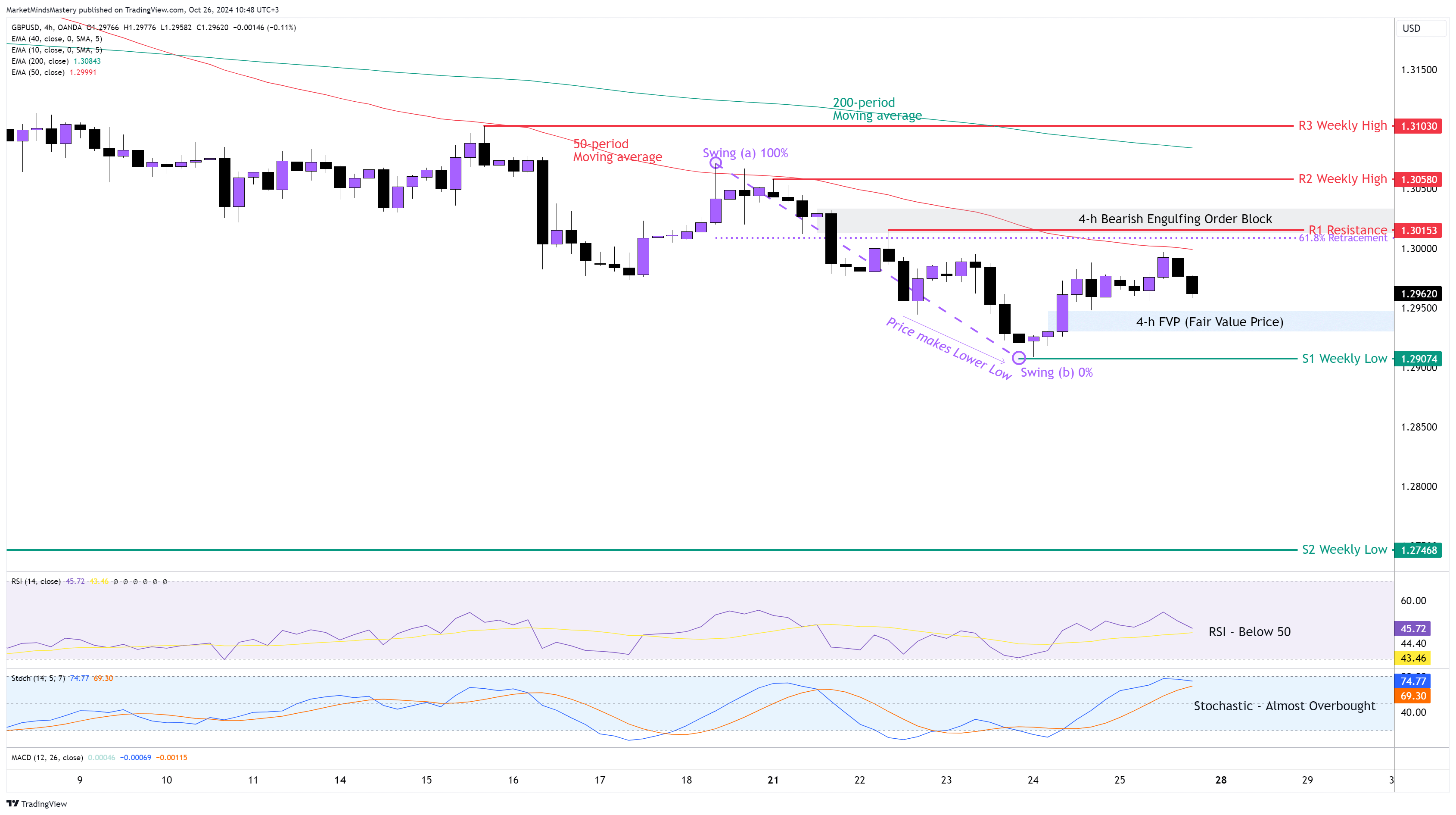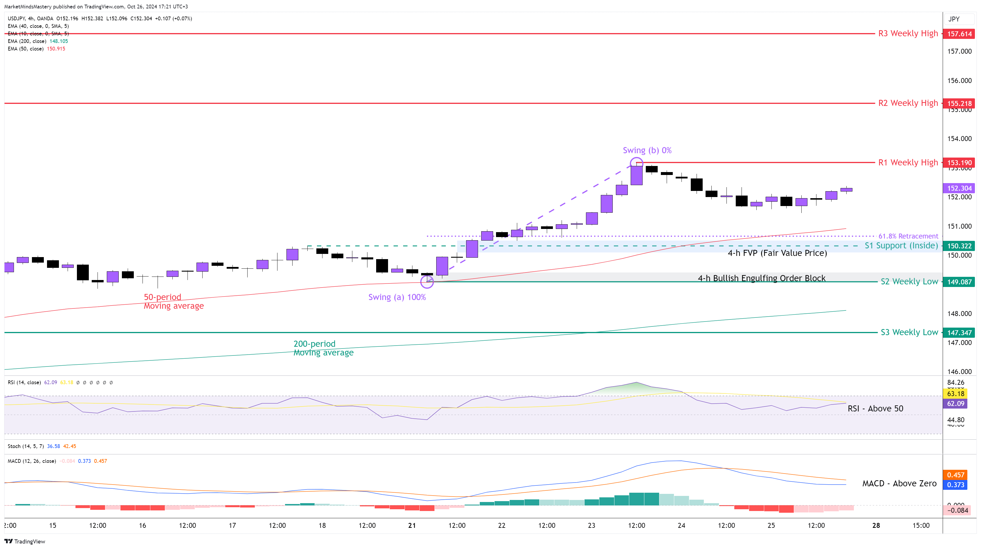 Bu, grafikte gösterildiği gibi (a) noktasındaki salınımdan (b) noktasındaki salınıma kadar ölçülen Altın Oran %61,8 Fibonacci, geçen Pazartesi oluşturulan 4 saatlik FVP (Adil Değer Fiyatı) ve 50 dönemlik hareketli ortalamadan oluştuğu için önemli bir destek seviyesidir. Fiyat S1'e nüfuz eder ve aşağı doğru hareket etmeye devam ederse, bir sonraki destek alanı olan S2, önceki haftanın en düşük seviyesi olan 149.087 civarında olacaktır. Bu seviyede, geçtiğimiz Pazartesi günü 4-h Bullish Engulfing Order Block oluşturuldu.