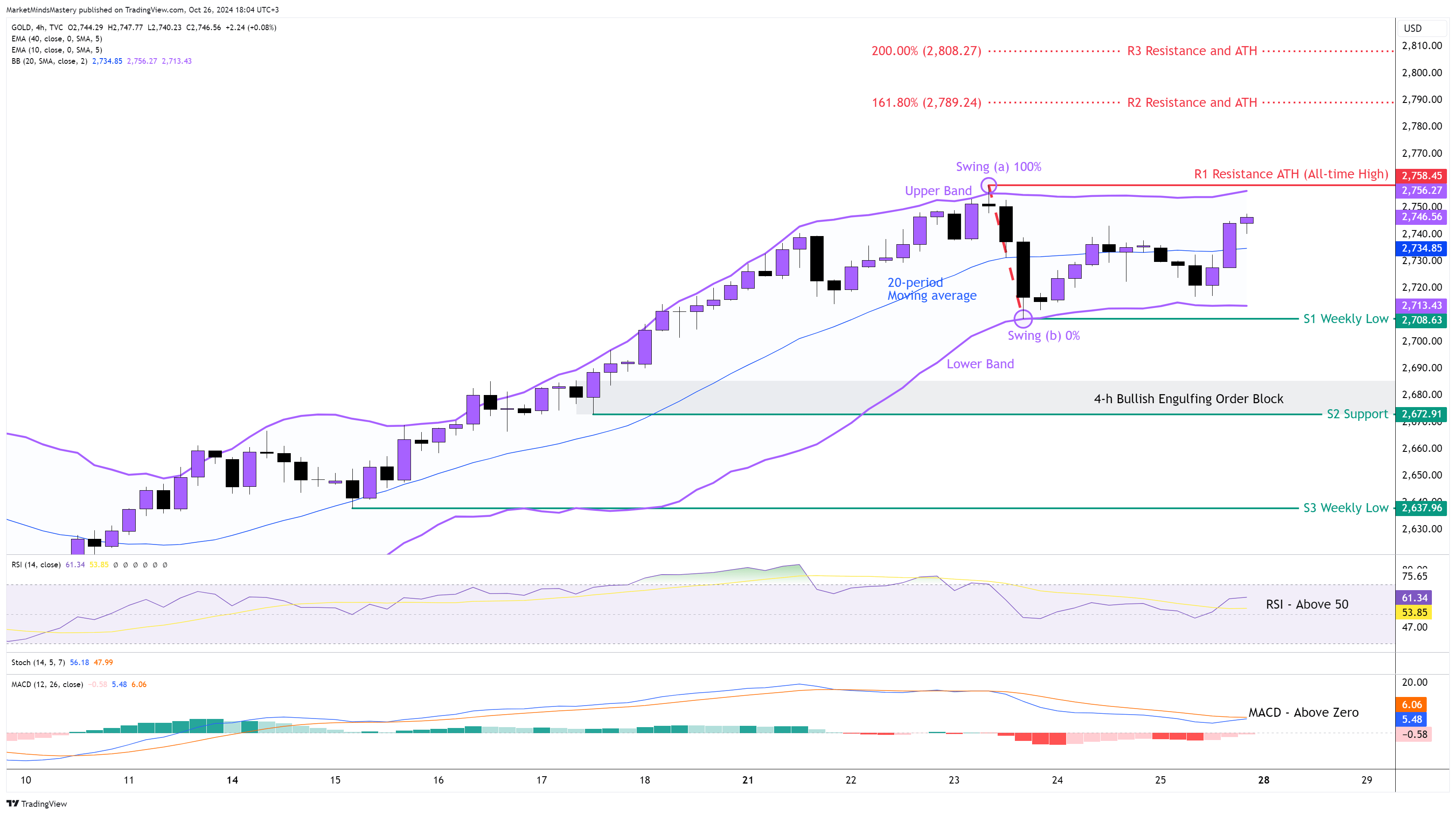 Tüm tüccarlar derin bir fiyat düzeltmesi beklese de, ALTIN fiyatı bir hafta daha yeni bir ATH (Tüm Zamanların En Yüksek Seviyesi) yarattı. Eylül ayından bu yana, fiyat artmaya devam ettikçe haftalık RSI Aşırı Alım durumunda. 4 saatlik grafikte, geçen Çarşamba gününden bu yana, fiyat bir Ticaret Aralığı içinde işlem görüyor. Bollinger Bandı göstergesini kullanarak, Üst Bant Alt Bant ile paraleldir ve fiyatın arz ve talep güçlerinin eşit olmasıyla dengede olduğunu gösterir. RSI Osilatörü 50'nin üzerinde, bu da yükselişe işaret ediyor. MACD sıfır çizgisinin üzerinde, bu da yükselişe işaret ediyor. Şu anda fiyat, Bollinger Band göstergesinin ortası olan 20 dönemlik hareketli ortalamanın üzerinde. Bu nedenle, fiyat yukarı doğru hareket ederse, ilk direnç alanı olan R1, 2758 $ 'da ATH (Tüm Zamanların En Yüksek) olacaktır. Fiyat R1'e nüfuz eder ve yukarı doğru hareket etmeye devam ederse, bir sonraki direnç alanı R2, 2789 $ 'da olacaktır. Bu, grafikte gösterildiği gibi (a) noktasındaki salınımdan (b) noktasındaki salınıma kadar ölçülen % 161,8 Fibonacci Uzantısı dır.