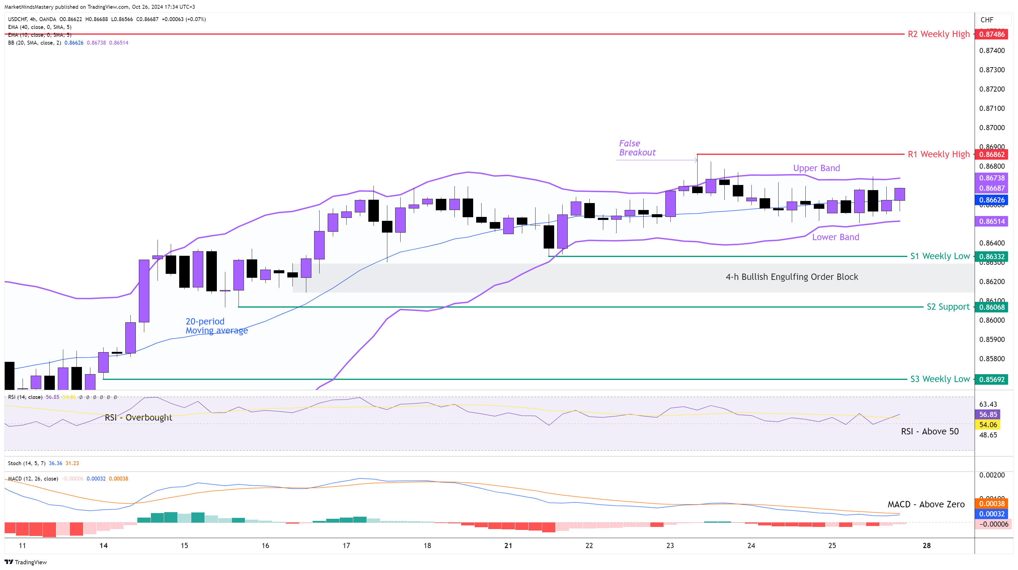 haftalık mum Boğa Devamı formasyonu olarak sona erdi, ancak gövdesi iki hafta öncesine kıyasla nispeten küçüktü ve bu da piyasanın zayıflığına işaret ediyordu. 4 saatlik grafikte, fiyat dar bir işlem aralığında yatay hareket etti ve bu hareket Bollinger Bandı göstergesi kullanılarak daha iyi görülebilir. Fiyat, Göstergenin Üst ve Alt Bantları arasında kaldı. Çarşamba günü, fiyat grafikte gösterildiği gibi Üst Bandın üzerine çıkmaya çalışırken bir Yanlış Kırılma yarattı. RSI i, yükseliş eğilimi gösteren orta çizgisi olan 50'nin üzerinde. MACD sıfır çizgisinin üzerinde, bu da yükseliş anlamına geliyor.