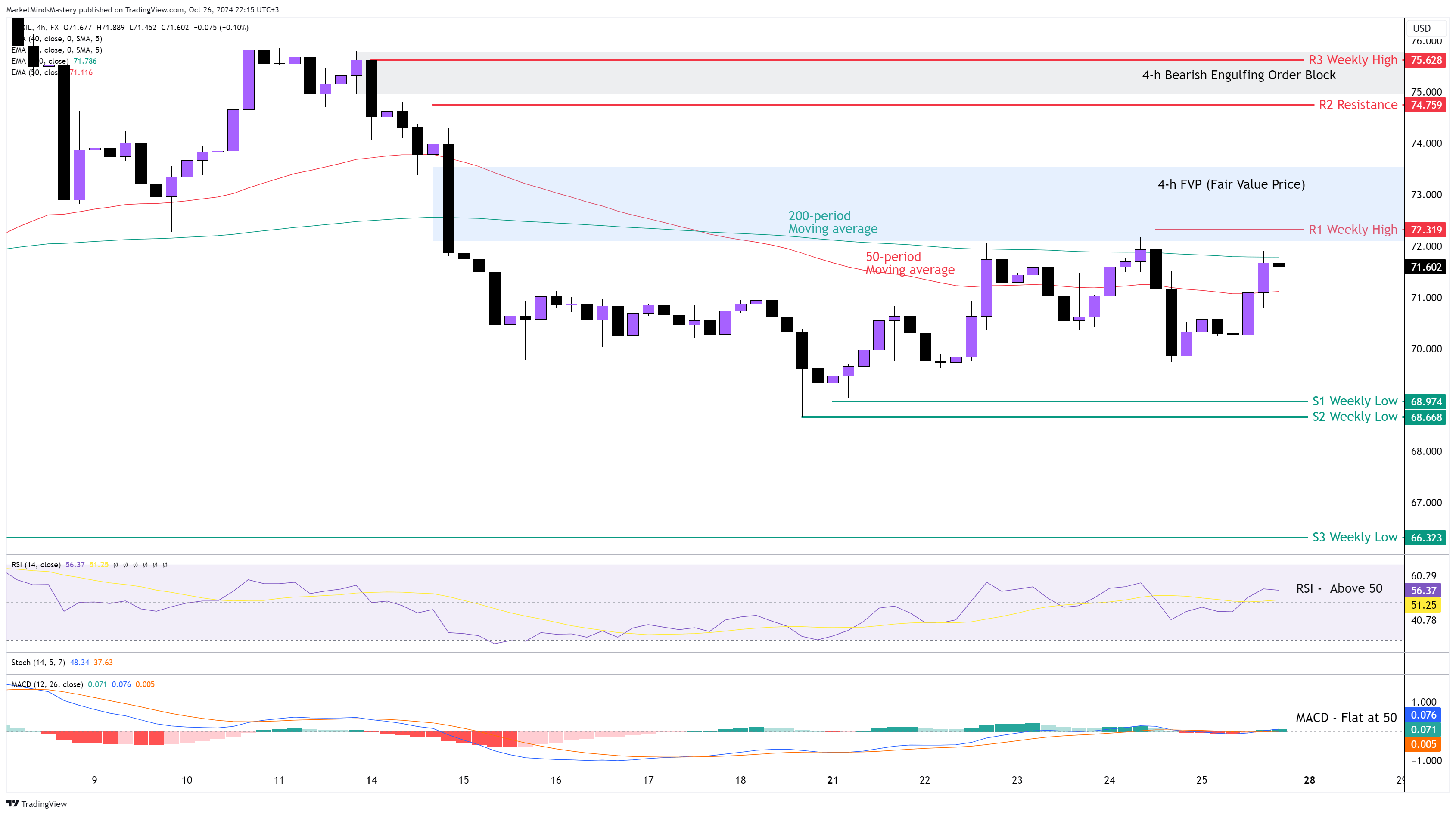 USOIL haftalık mumu bir İç mum olarak sona erdi. Geçen haftanın fiyatı yeni bir düşük dip ya da yeni bir yüksek tepe oluşturmadı. 4 saatlik grafikte, 200 dönemlik hareketli ortalama geçtiğimiz Salı, Perşembe ve Cuma günleri Direnç olarak hareket etti ve fiyat bu ortalamayı aşamadı. 50 periyot, 200 periyotluk hareketli ortalamanın altında ve bu düşüş eğilimi gösteriyor. Aksine, RSI orta çizgisi olan 50'nin üzerinde ve bu da yükseliş anlamına geliyor. MACD orta çizgisi olan 50 civarında yatay seyrediyor. Geçen haftaki Piyasa Görünümünde grafikte işaret ettiğimiz 73$ civarındaki FVP (Fair Value Price) ve 75$ civarındaki 4-h Bearish Engulfing Order Block hala geçerli.