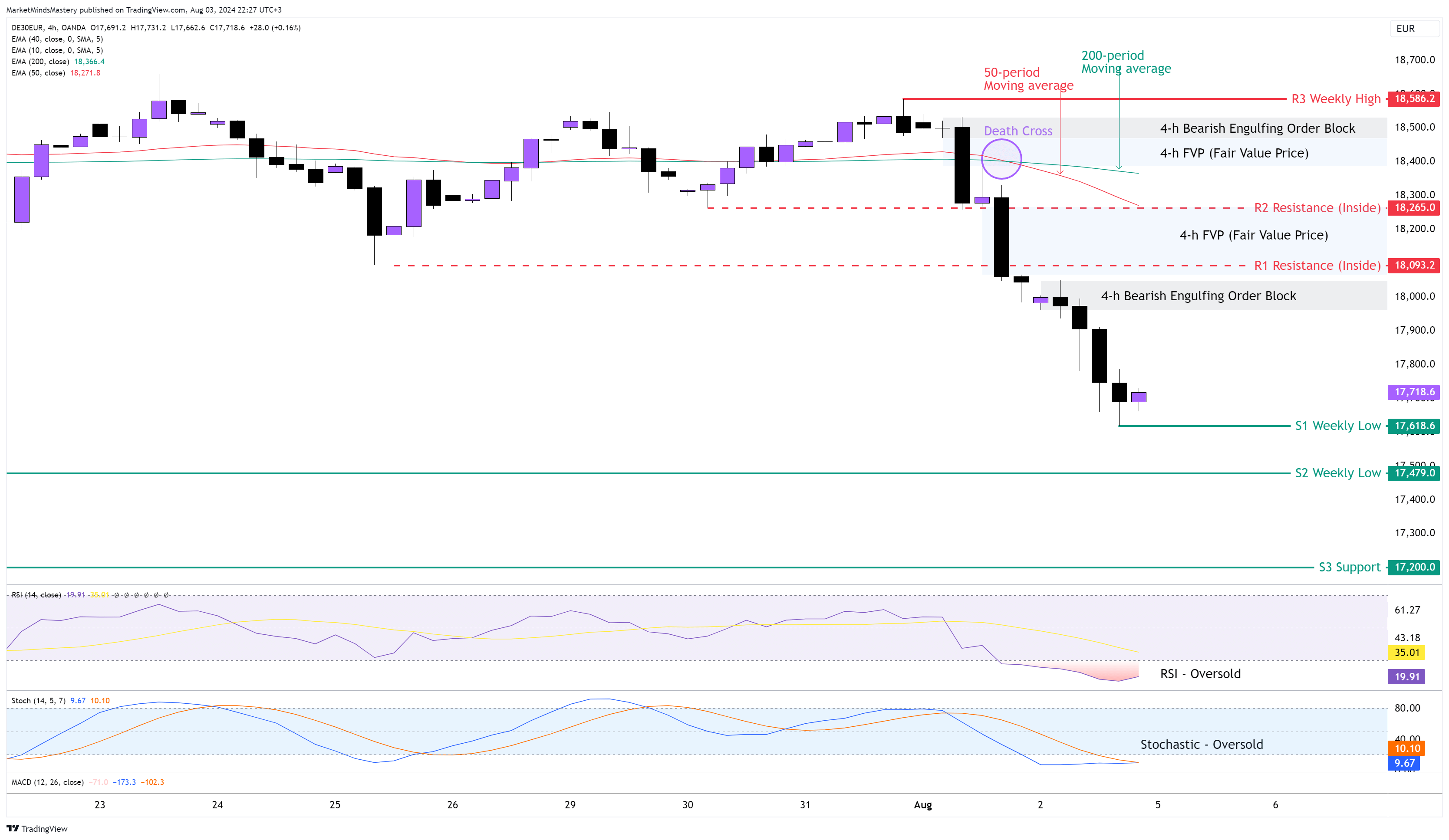 Geçen haftaki fiyat hareketinin ardından, fiyat geçen hafta grafikte işaretlediğimiz Talep alanına girdi, sıçradı ve yukarı doğru hareket ederek "RunAway Gap "i doldurdu. Daha sonra düşüşe geçti ve o zamandan beri 4 saatlik grafikte yalnızca Ayı Mumları belirdi. Bu nedenle, haftalık mum bir Ayı Mumu olarak sona erdi. Geçtiğimiz Cuma günü, 50 dönemlik hareketli ortalama 200 dönemlik hareketli ortalamanın altından geçerek "Ölüm Çaprazı" olarak bilinen bir düşüş eğilimi yarattı. Fiyat yeni bir düşük dip oluşturdu, ancak şu anda teyit edilmiş bir düşük salınım olmadığından, Fibonacci düzeltme aracını bir düzeltme yüzdesi tahmin etmek için kullanamıyoruz. RSI Osilatörü bir Aşırı Satım durumunda ve MACD sıfır çizgisinin altında. MACD'nin Histogramı da Sıfır çizgisinin altında ve güçlü bir düşüş gösteriyor. Pazartesi gününden itibaren, fiyat aşağı yönlü hareketine devam ederse, ilk destek alanı olan S1, bir önceki haftanın en düşük seviyesi olan 5302 $ olacaktır. Fiyatın S1'e girmesi ve düşmeye devam etmesi durumunda, bir sonraki destek alanı olan S2 5234$ ve S3 5193$ civarında olacaktır.