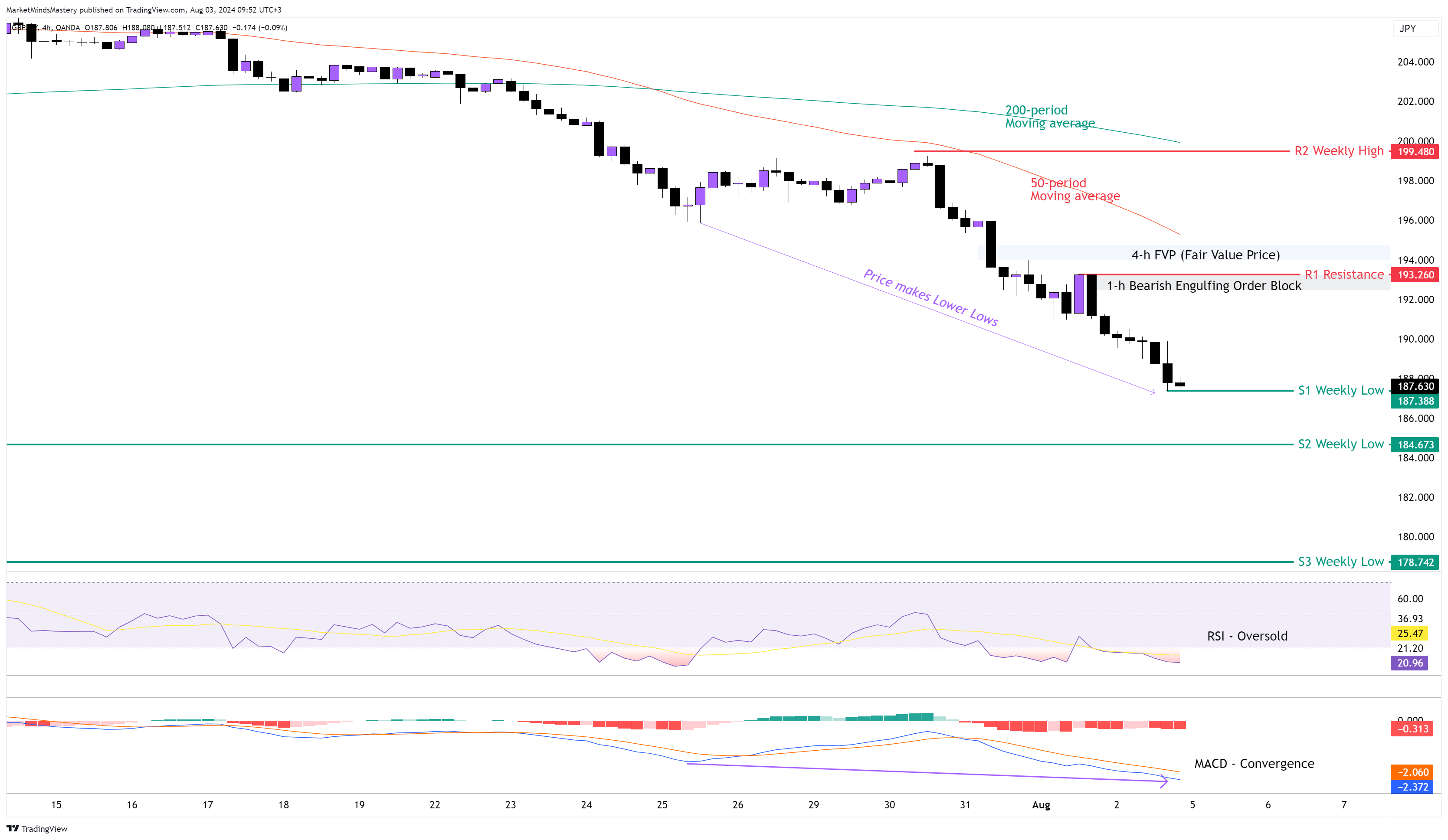 Pazartesi gününden itibaren, fiyat aşağı yönlü hareketine devam ederse, ilk destek alanı olan S1, 187.388 ile bir önceki haftanın en düşük seviyesi olacak. Önceki haftanın en düşük seviyesi ve haftalık mum kapanışı aynı fiyat seviyesindeydi. Fiyat S1'e nüfuz eder ve aşağı doğru hareket ederse, bir sonraki destek alanı olan S2, bir başka haftalık düşük fiyat olan 184.673 civarında olacaktır. Fiyatın sıçraması ve yukarı doğru hareket etmesi durumunda, ilk direnç alanı olan R1, 193,26 civarında olacaktır. Aynı fiyat seviyesinde, geçtiğimiz Perşembe günü 1 saatlik grafikte bir Ayı Yutan Emir Bloğu oluşturuldu. Fiyat R1'e nüfuz eder ve yukarı doğru hareket etmeye devam ederse, 50 dönemlik hareketli ortalamanın etrafında aralıksız bir FVP var. Bir sonraki statik Direnç seviyesi olan R2, bir önceki haftanın en yüksek seviyesi olan 199.480 civarında.