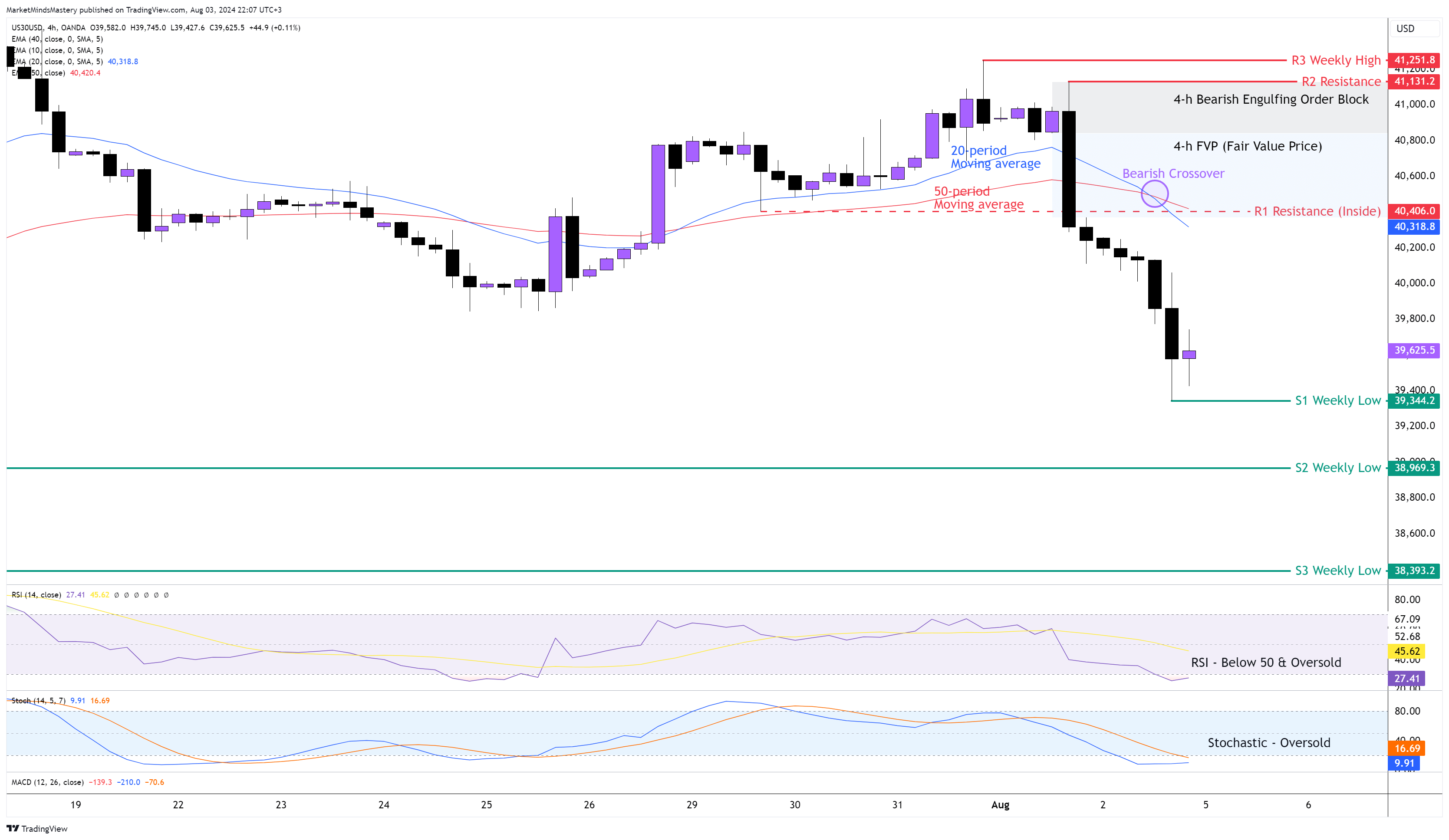 US30 fiyatı geçtiğimiz Perşembe günü güçlü bir satış dalgası yaşadı. Bir önceki haftanın Piyasa Görünümünde, olgun bir yükseliş trendinin ardından gelen Boğa Çekiçinin önemini ve bunun aşağı yönlü etkileri olduğunu açıklamıştık. Bu gerçekleşti ve haftalık grafikteki fiyat bir Ayı Yutan Ters Dönüş mumuna dönüştü. 4 saatlik grafikte, piyasa yapısı değişti ve yükseliş trendinden düşüş trendine doğru ilerliyor. Piyasa halihazırda daha düşük bir dip yaptı ve düşüş trendini teyit etmek için daha düşük bir tepe gerekiyor. Bununla birlikte, 20 periyot 50 periyodun altından geçti ve bu düşüş eğilimi gösteriyor. RSI sadece 50'nin altında değil, aynı zamanda geçen haftaki güçlü ve hızlı fiyat düşüşü nedeniyle Aşırı Satım durumunda. Stochastic Osilatör de Aşırı Satım durumunda ve bu düşüş eğilimi gösteriyor. Pazartesi gününden itibaren, fiyat daha da düşerse, ilk destek alanı olan S1, bir önceki haftanın en düşük seviyesi olan 39344 $ civarında olacak. Fiyatın S1'i geçmesi ve aşağı doğru hareket etmeye devam etmesi durumunda, bir sonraki destek olan S2, yaklaşık 38969 $ 'lık bir başka haftalık düşük fiyat olacaktır. Fiyat S2'yi geçerse ve düşmeye devam ederse, bir sonraki destek olan S3, 38393 $' da olacaktır.
