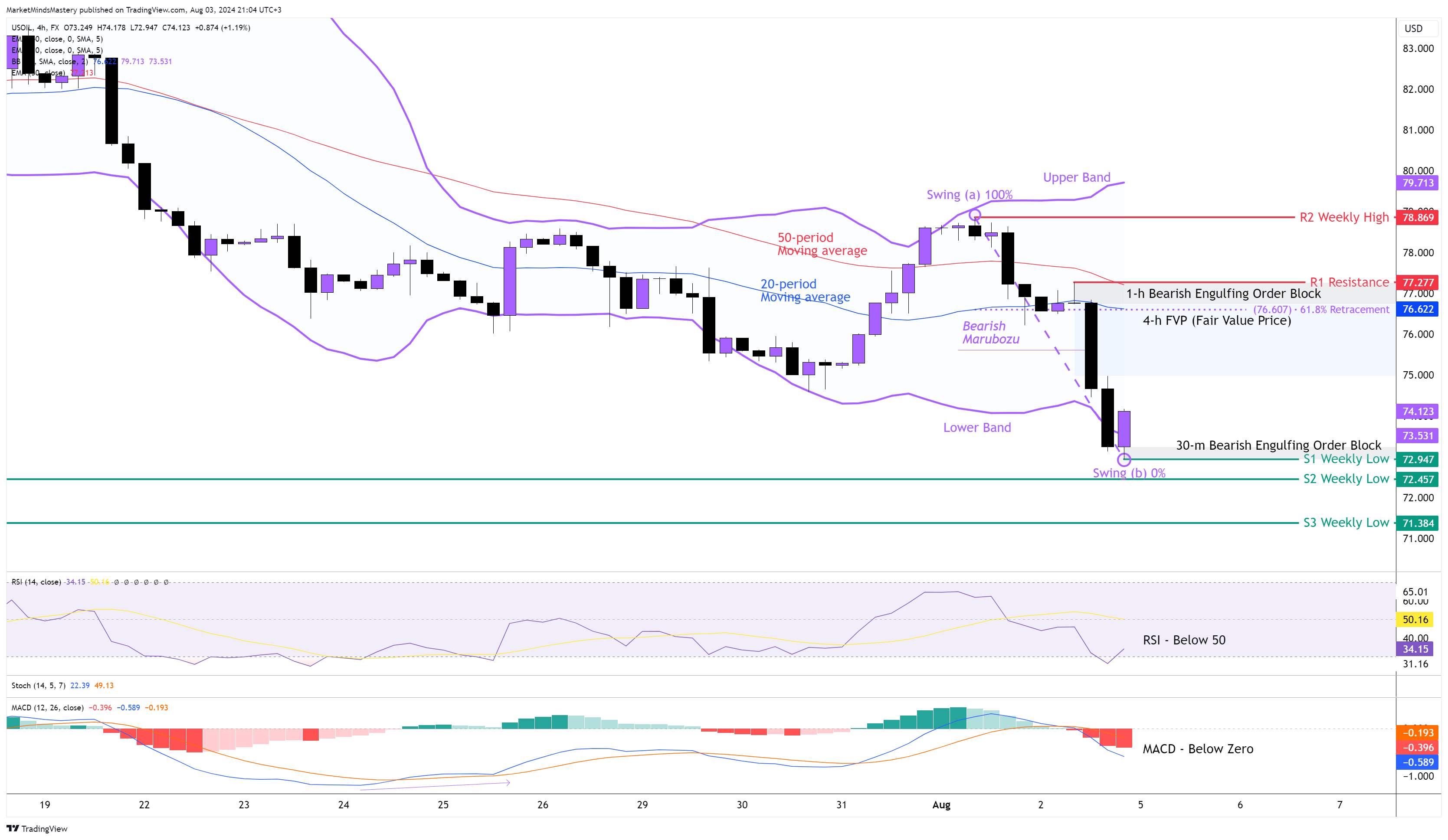 Ayrıca, RSI OScillator 50'nin altında ve bu da düşüş eğiliminde. MACD sıfır çizgisinin altından geçerek fiyat düşüşüne işaret etti. MACD'nin Histogramı sıfırın altında ve bu da fiyat düşüşünü teyit ediyor. Fiyat aşağı yönlü hareketine devam ederse, ilk destek alanı olan S1, bir önceki haftanın en düşük seviyesi olan 72,94 $ civarında olacak. Fiyat S1'e nüfuz eder ve düşmeye devam ederse, bir sonraki destek alanı olan S2 72,45 $ olacaktır. Aşağı doğru bir hareket daha, 71,38 $ civarında S3 desteğini bulur. Fiyatın yukarı doğru hareket etmesi durumunda, ilk direnç R1, 1 saatlik Bearish Engulfing Order Block 77,27 $ civarında olacak. 77 dolarlık alan önemli bir fiyat seviyesi olarak kabul edilir çünkü grafikte gösterildiği gibi R1 direnci, FVP ve % 61,8 Fibonacci geri çekilme seviyesinden (a) salınımdan (b) salınımına kadar oluşur. Fiyat R1'i aşar ve yukarı doğru hareket etmeye devam ederse, bir sonraki direnç alanı olan R2, önceki haftanın en yüksek seviyesi olan 78,86 $ civarında olacak.