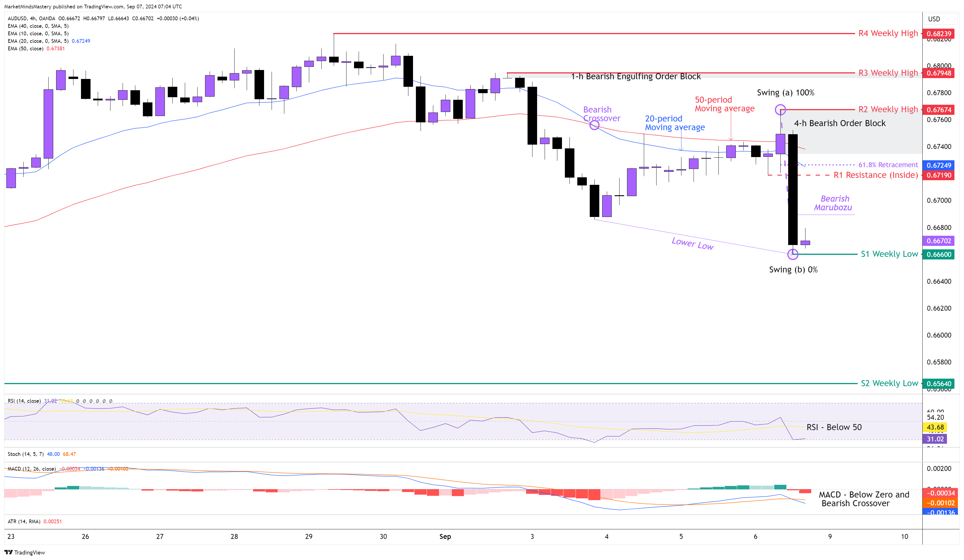 Haftalık grafikteki birincil düşüş trendini takip eden haftalık mum, bir Ayı Yutan ters dönüş olarak sona erdi. 4 saatlik grafikte, geçtiğimiz Çarşamba günü 20 periyot, 50 periyotluk hareketli ortalamanın altından geçerek bir Ayı Geçişi oluşturdu. Ardından, fiyat bir dizi düşük tepe ve düşük dip ile 4 saatlik düşüş trendine devam etti. Düşüş trendi güçlü olduğu için geri çekilmeler çok sığdı. Bu, aşağı yönlü hareket sırasında basılan birkaç yükseliş mumuna kıyasla düşüş (siyah) mumlarının sayısı ile açıklanabilir.