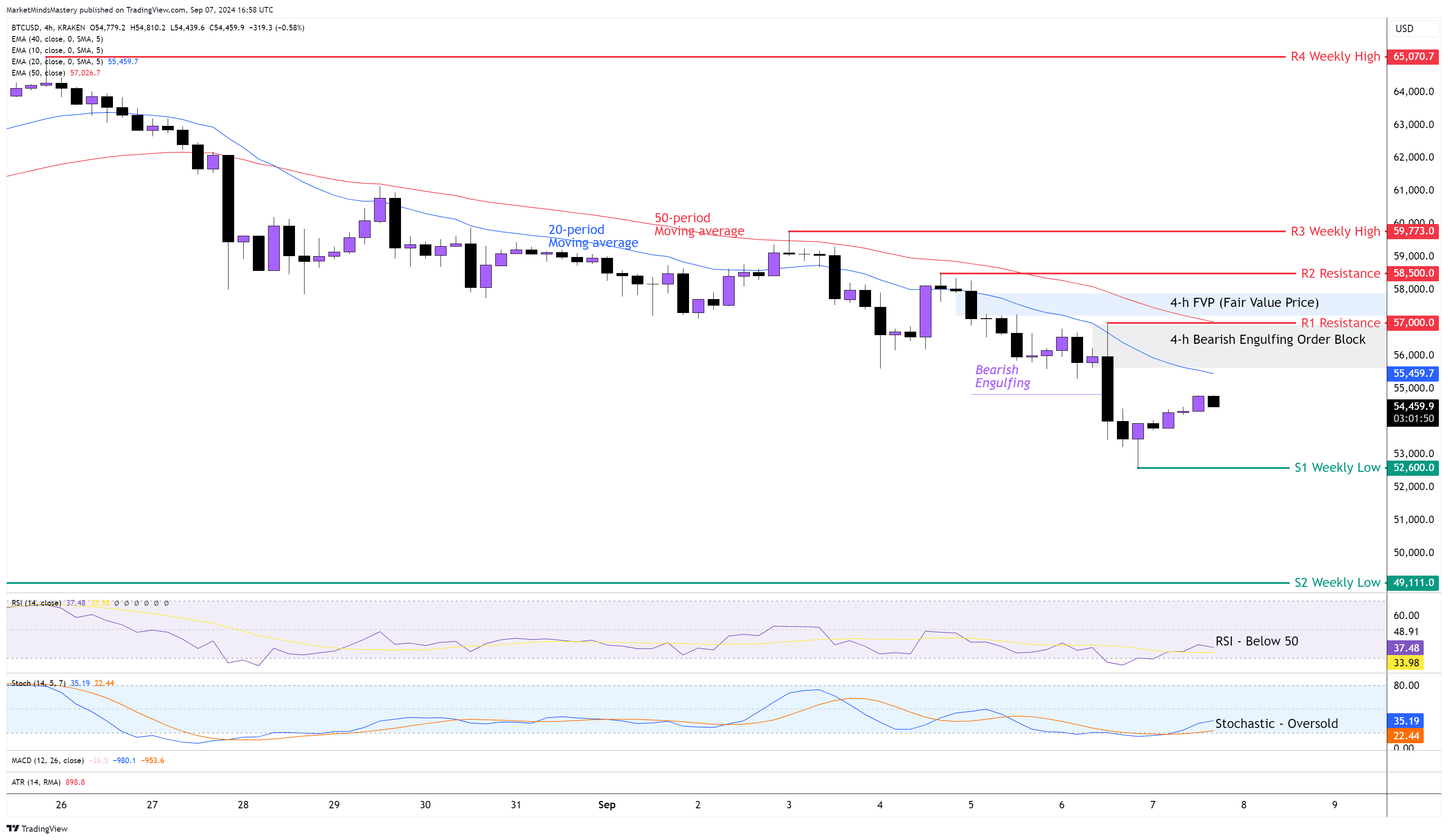 Devam grafiği formasyonları kategorisinde yer alan alçalan üçgen, bir önceki haftanın Piyasa Görünümü analizine dayanarak beklendiği gibi gerçekleşti. Haftalık grafikteki fiyat bir Ayı damlası olarak sona erdi. Aynı zamanda, 4 saatlik grafikte piyasa bir dizi düşük yüksekler ve düşük düşükler şeklinde aşağı yönlü hareket etti. 20 dönemlik hareketli ortalama, 50 dönemlik hareketli ortalamanın altında ve bu bir düşüş göstergesi. Fiyat sürekli ve güçlü bir aşağı yönlü hareket içinde çünkü her geri çekilme aşamasında 20 periyoda dokunur dokunmaz hızla düşüyor. RSI orta çizgisi olan 50'nin altında ve Ayı olarak kabul ediliyor. Stochastic Oscillator aşırı satım durumundadır ve % K Çizgisi (Mavi) yükseliş etkileri olan % D Çizgisinin (Turuncu) üzerine çıkmıştır. Şu anda fiyat düzeltici bir aşamada. Fiyat aşağı doğru hareket etmeye devam ederse, ilk destek alanı olan S1, bir önceki haftanın en düşük seviyesi olan 52600 $ civarında olacaktır. Fiyat S1 desteğine nüfuz eder ve aşağı doğru hareket etmeye devam ederse, bir sonraki destek alanı olan S2, daha eski bir haftalık düşük fiyat seviyesi olan 49111 $ civarında olacaktır.
